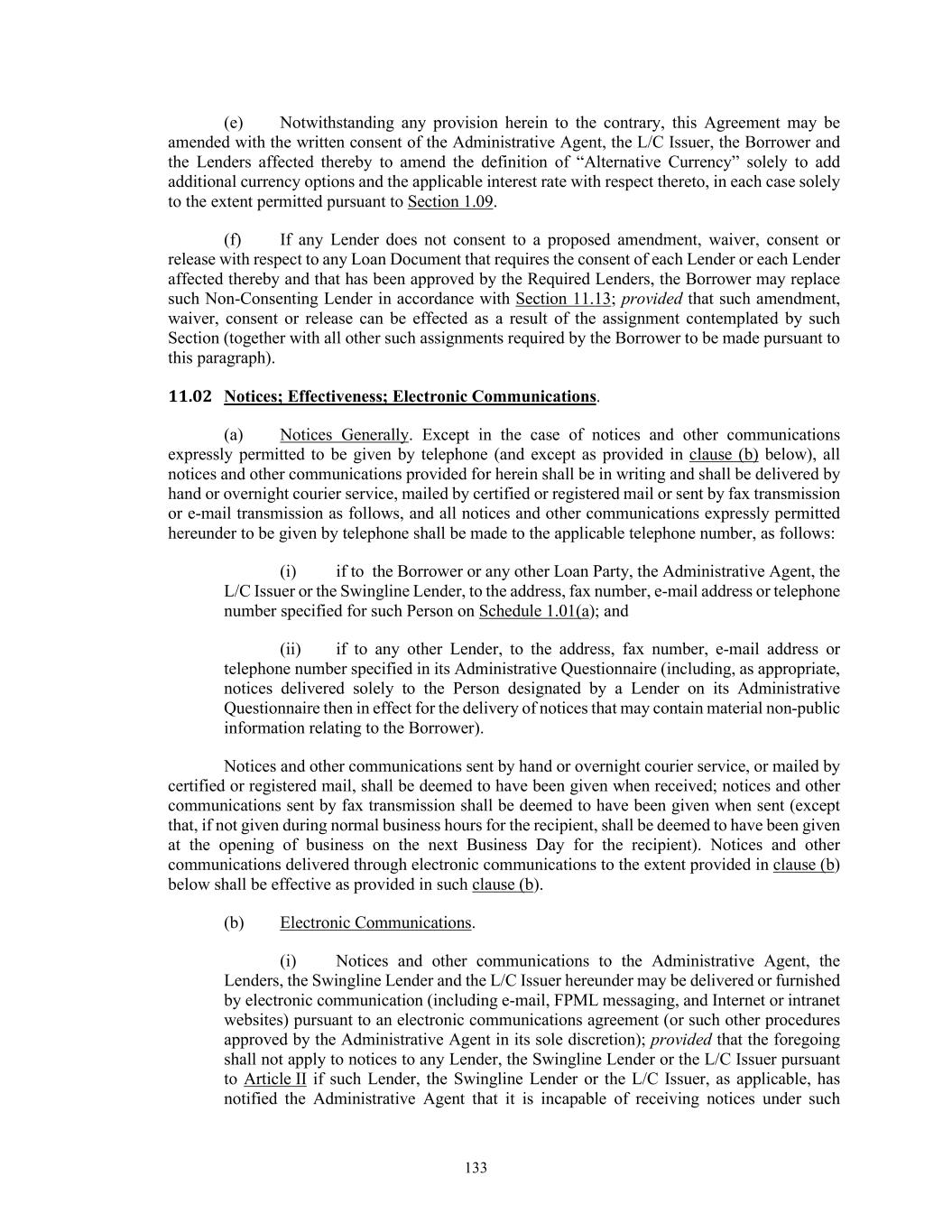 133 (e) Notwithstanding any provision herein to the contrary, this Agreement may be amended with the written consent of the Administrative Agent, the L/C Issuer, the Borrower and the Lenders affected thereby to amend the definition of “Alternative Currency” solely to add additional currency options and the applicable interest rate with respect thereto, in each case solely to the extent permitted pursuant to Section 1.09. (f) If any Lender does not consent to a proposed amendment, waiver, consent or release with respect to any Loan Document that requires the consent of each Lender or each Lender affected thereby and that has been approved by the Required Lenders, the Borrower may replace such Non-Consenting Lender in accordance with Section 11.13; provided that such amendment, waiver, consent or release can be effected as a result of the assignment contemplated by such Section (together with all other such assignments required by the Borrower to be made pursuant to this paragraph). 11.02 Notices; Effectiveness; Electronic Communications. (a) Notices Generally. Except in the case of notices and other communications expressly permitted to be given by telephone (and except as provided in clause (b) below), all notices and other communications provided for herein shall be in writing and shall be delivered by hand or overnight courier service, mailed by certified or registered mail or sent by fax transmission or e-mail transmission as follows, and all notices and other communications expressly permitted hereunder to be given by telephone shall be made to the applicable telephone number, as follows: (i) if to the Borrower or any other Loan Party, the Administrative Agent, the L/C Issuer or the Swingline Lender, to the address, fax number, e-mail address or telephone number specified for such Person on Schedule 1.01(a); and (ii) if to any other Lender, to the address, fax number, e-mail address or telephone number specified in its Administrative Questionnaire (including, as appropriate, notices delivered solely to the Person designated by a Lender on its Administrative Questionnaire then in effect for the delivery of notices that may contain material non-public information relating to the Borrower). Notices and other communications sent by hand or overnight courier service, or mailed by certified or registered mail, shall be deemed to have been given when received; notices and other communications sent by fax transmission shall be deemed to have been given when sent (except that, if not given during normal business hours for the recipient, shall be deemed to have been given at the opening of business on the next Business Day for the recipient). Notices and other communications delivered through electronic communications to the extent provided in clause (b) below shall be effective as provided in such clause (b). (b) Electronic Communications. (i) Notices and other communications to the Administrative Agent, the Lenders, the Swingline Lender and the L/C Issuer hereunder may be delivered or furnished by electronic communication (including e-mail, FPML messaging, and Internet or intranet websites) pursuant to an electronic communications agreement (or such other procedures approved by the Administrative Agent in its sole discretion); provided that the foregoing shall not apply to notices to any Lender, the Swingline Lender or the L/C Issuer pursuant to Article II if such Lender, the Swingline Lender or the L/C Issuer, as applicable, has notified the Administrative Agent that it is incapable of receiving notices under such