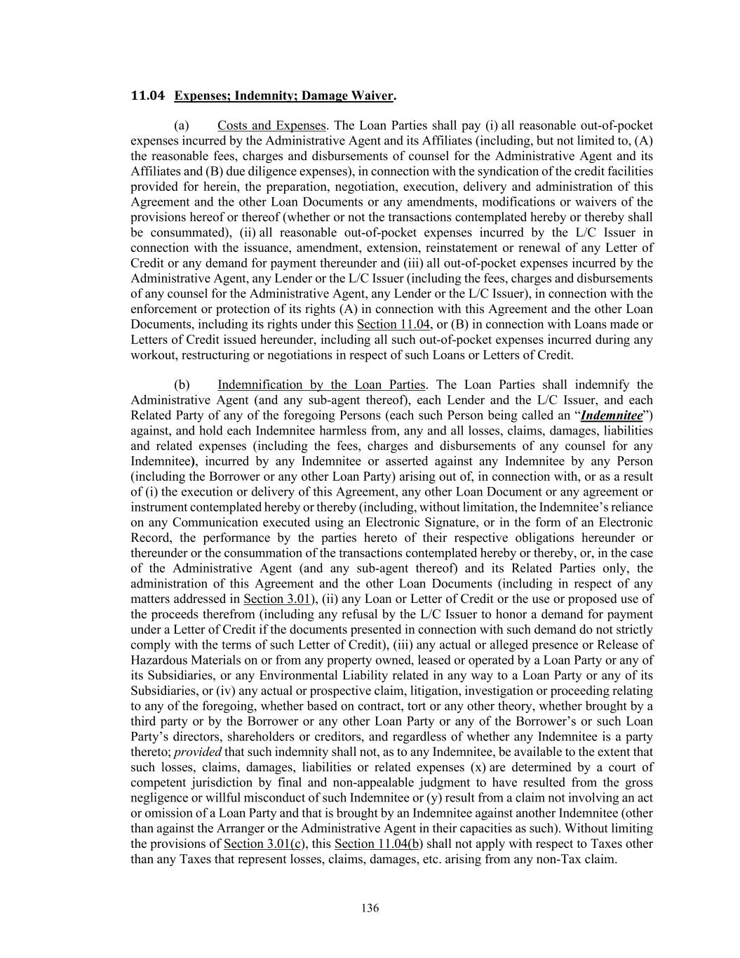136 11.04 Expenses; Indemnity; Damage Waiver. (a) Costs and Expenses. The Loan Parties shall pay (i) all reasonable out-of-pocket expenses incurred by the Administrative Agent and its Affiliates (including, but not limited to, (A) the reasonable fees, charges and disbursements of counsel for the Administrative Agent and its Affiliates and (B) due diligence expenses), in connection with the syndication of the credit facilities provided for herein, the preparation, negotiation, execution, delivery and administration of this Agreement and the other Loan Documents or any amendments, modifications or waivers of the provisions hereof or thereof (whether or not the transactions contemplated hereby or thereby shall be consummated), (ii) all reasonable out-of-pocket expenses incurred by the L/C Issuer in connection with the issuance, amendment, extension, reinstatement or renewal of any Letter of Credit or any demand for payment thereunder and (iii) all out-of-pocket expenses incurred by the Administrative Agent, any Lender or the L/C Issuer (including the fees, charges and disbursements of any counsel for the Administrative Agent, any Lender or the L/C Issuer), in connection with the enforcement or protection of its rights (A) in connection with this Agreement and the other Loan Documents, including its rights under this Section 11.04, or (B) in connection with Loans made or Letters of Credit issued hereunder, including all such out-of-pocket expenses incurred during any workout, restructuring or negotiations in respect of such Loans or Letters of Credit. (b) Indemnification by the Loan Parties. The Loan Parties shall indemnify the Administrative Agent (and any sub-agent thereof), each Lender and the L/C Issuer, and each Related Party of any of the foregoing Persons (each such Person being called an “Indemnitee”) against, and hold each Indemnitee harmless from, any and all losses, claims, damages, liabilities and related expenses (including the fees, charges and disbursements of any counsel for any Indemnitee), incurred by any Indemnitee or asserted against any Indemnitee by any Person (including the Borrower or any other Loan Party) arising out of, in connection with, or as a result of (i) the execution or delivery of this Agreement, any other Loan Document or any agreement or instrument contemplated hereby or thereby (including, without limitation, the Indemnitee’s reliance on any Communication executed using an Electronic Signature, or in the form of an Electronic Record, the performance by the parties hereto of their respective obligations hereunder or thereunder or the consummation of the transactions contemplated hereby or thereby, or, in the case of the Administrative Agent (and any sub-agent thereof) and its Related Parties only, the administration of this Agreement and the other Loan Documents (including in respect of any matters addressed in Section 3.01), (ii) any Loan or Letter of Credit or the use or proposed use of the proceeds therefrom (including any refusal by the L/C Issuer to honor a demand for payment under a Letter of Credit if the documents presented in connection with such demand do not strictly comply with the terms of such Letter of Credit), (iii) any actual or alleged presence or Release of Hazardous Materials on or from any property owned, leased or operated by a Loan Party or any of its Subsidiaries, or any Environmental Liability related in any way to a Loan Party or any of its Subsidiaries, or (iv) any actual or prospective claim, litigation, investigation or proceeding relating to any of the foregoing, whether based on contract, tort or any other theory, whether brought by a third party or by the Borrower or any other Loan Party or any of the Borrower’s or such Loan Party’s directors, shareholders or creditors, and regardless of whether any Indemnitee is a party thereto; provided that such indemnity shall not, as to any Indemnitee, be available to the extent that such losses, claims, damages, liabilities or related expenses (x) are determined by a court of competent jurisdiction by final and non-appealable judgment to have resulted from the gross negligence or willful misconduct of such Indemnitee or (y) result from a claim not involving an act or omission of a Loan Party and that is brought by an Indemnitee against another Indemnitee (other than against the Arranger or the Administrative Agent in their capacities as such). Without limiting the provisions of Section 3.01(c), this Section 11.04(b) shall not apply with respect to Taxes other than any Taxes that represent losses, claims, damages, etc. arising from any non-Tax claim.