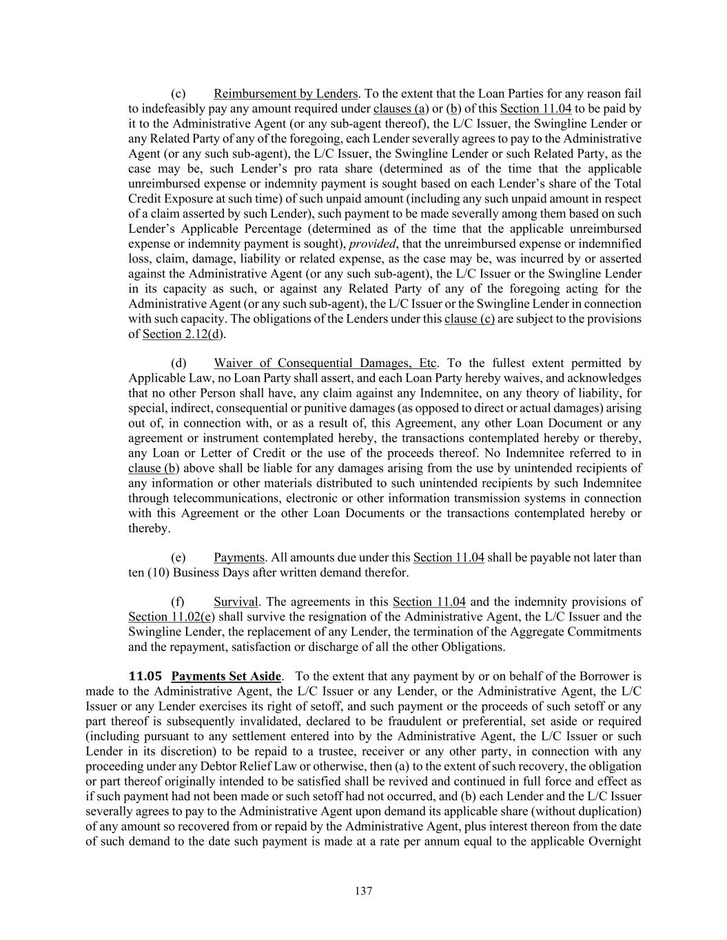 137 (c) Reimbursement by Lenders. To the extent that the Loan Parties for any reason fail to indefeasibly pay any amount required under clauses (a) or (b) of this Section 11.04 to be paid by it to the Administrative Agent (or any sub-agent thereof), the L/C Issuer, the Swingline Lender or any Related Party of any of the foregoing, each Lender severally agrees to pay to the Administrative Agent (or any such sub-agent), the L/C Issuer, the Swingline Lender or such Related Party, as the case may be, such Lender’s pro rata share (determined as of the time that the applicable unreimbursed expense or indemnity payment is sought based on each Lender’s share of the Total Credit Exposure at such time) of such unpaid amount (including any such unpaid amount in respect of a claim asserted by such Lender), such payment to be made severally among them based on such Lender’s Applicable Percentage (determined as of the time that the applicable unreimbursed expense or indemnity payment is sought), provided, that the unreimbursed expense or indemnified loss, claim, damage, liability or related expense, as the case may be, was incurred by or asserted against the Administrative Agent (or any such sub-agent), the L/C Issuer or the Swingline Lender in its capacity as such, or against any Related Party of any of the foregoing acting for the Administrative Agent (or any such sub-agent), the L/C Issuer or the Swingline Lender in connection with such capacity. The obligations of the Lenders under this clause (c) are subject to the provisions of Section 2.12(d). (d) Waiver of Consequential Damages, Etc. To the fullest extent permitted by Applicable Law, no Loan Party shall assert, and each Loan Party hereby waives, and acknowledges that no other Person shall have, any claim against any Indemnitee, on any theory of liability, for special, indirect, consequential or punitive damages (as opposed to direct or actual damages) arising out of, in connection with, or as a result of, this Agreement, any other Loan Document or any agreement or instrument contemplated hereby, the transactions contemplated hereby or thereby, any Loan or Letter of Credit or the use of the proceeds thereof. No Indemnitee referred to in clause (b) above shall be liable for any damages arising from the use by unintended recipients of any information or other materials distributed to such unintended recipients by such Indemnitee through telecommunications, electronic or other information transmission systems in connection with this Agreement or the other Loan Documents or the transactions contemplated hereby or thereby. (e) Payments. All amounts due under this Section 11.04 shall be payable not later than ten (10) Business Days after written demand therefor. (f) Survival. The agreements in this Section 11.04 and the indemnity provisions of Section 11.02(e) shall survive the resignation of the Administrative Agent, the L/C Issuer and the Swingline Lender, the replacement of any Lender, the termination of the Aggregate Commitments and the repayment, satisfaction or discharge of all the other Obligations. 11.05 Payments Set Aside. To the extent that any payment by or on behalf of the Borrower is made to the Administrative Agent, the L/C Issuer or any Lender, or the Administrative Agent, the L/C Issuer or any Lender exercises its right of setoff, and such payment or the proceeds of such setoff or any part thereof is subsequently invalidated, declared to be fraudulent or preferential, set aside or required (including pursuant to any settlement entered into by the Administrative Agent, the L/C Issuer or such Lender in its discretion) to be repaid to a trustee, receiver or any other party, in connection with any proceeding under any Debtor Relief Law or otherwise, then (a) to the extent of such recovery, the obligation or part thereof originally intended to be satisfied shall be revived and continued in full force and effect as if such payment had not been made or such setoff had not occurred, and (b) each Lender and the L/C Issuer severally agrees to pay to the Administrative Agent upon demand its applicable share (without duplication) of any amount so recovered from or repaid by the Administrative Agent, plus interest thereon from the date of such demand to the date such payment is made at a rate per annum equal to the applicable Overnight