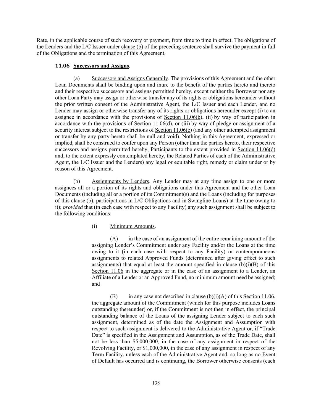 138 Rate, in the applicable course of such recovery or payment, from time to time in effect. The obligations of the Lenders and the L/C Issuer under clause (b) of the preceding sentence shall survive the payment in full of the Obligations and the termination of this Agreement. 11.06 Successors and Assigns. (a) Successors and Assigns Generally. The provisions of this Agreement and the other Loan Documents shall be binding upon and inure to the benefit of the parties hereto and thereto and their respective successors and assigns permitted hereby, except neither the Borrower nor any other Loan Party may assign or otherwise transfer any of its rights or obligations hereunder without the prior written consent of the Administrative Agent, the L/C Issuer and each Lender, and no Lender may assign or otherwise transfer any of its rights or obligations hereunder except (i) to an assignee in accordance with the provisions of Section 11.06(b), (ii) by way of participation in accordance with the provisions of Section 11.06(d), or (iii) by way of pledge or assignment of a security interest subject to the restrictions of Section 11.06(e) (and any other attempted assignment or transfer by any party hereto shall be null and void). Nothing in this Agreement, expressed or implied, shall be construed to confer upon any Person (other than the parties hereto, their respective successors and assigns permitted hereby, Participants to the extent provided in Section 11.06(d) and, to the extent expressly contemplated hereby, the Related Parties of each of the Administrative Agent, the L/C Issuer and the Lenders) any legal or equitable right, remedy or claim under or by reason of this Agreement. (b) Assignments by Lenders. Any Lender may at any time assign to one or more assignees all or a portion of its rights and obligations under this Agreement and the other Loan Documents (including all or a portion of its Commitment(s) and the Loans (including for purposes of this clause (b), participations in L/C Obligations and in Swingline Loans) at the time owing to it); provided that (in each case with respect to any Facility) any such assignment shall be subject to the following conditions: (i) Minimum Amounts. (A) in the case of an assignment of the entire remaining amount of the assigning Lender’s Commitment under any Facility and/or the Loans at the time owing to it (in each case with respect to any Facility) or contemporaneous assignments to related Approved Funds (determined after giving effect to such assignments) that equal at least the amount specified in clause (b)(i)(B) of this Section 11.06 in the aggregate or in the case of an assignment to a Lender, an Affiliate of a Lender or an Approved Fund, no minimum amount need be assigned; and (B) in any case not described in clause (b)(i)(A) of this Section 11.06, the aggregate amount of the Commitment (which for this purpose includes Loans outstanding thereunder) or, if the Commitment is not then in effect, the principal outstanding balance of the Loans of the assigning Lender subject to each such assignment, determined as of the date the Assignment and Assumption with respect to such assignment is delivered to the Administrative Agent or, if “Trade Date” is specified in the Assignment and Assumption, as of the Trade Date, shall not be less than $5,000,000, in the case of any assignment in respect of the Revolving Facility, or $1,000,000, in the case of any assignment in respect of any Term Facility, unless each of the Administrative Agent and, so long as no Event of Default has occurred and is continuing, the Borrower otherwise consents (each