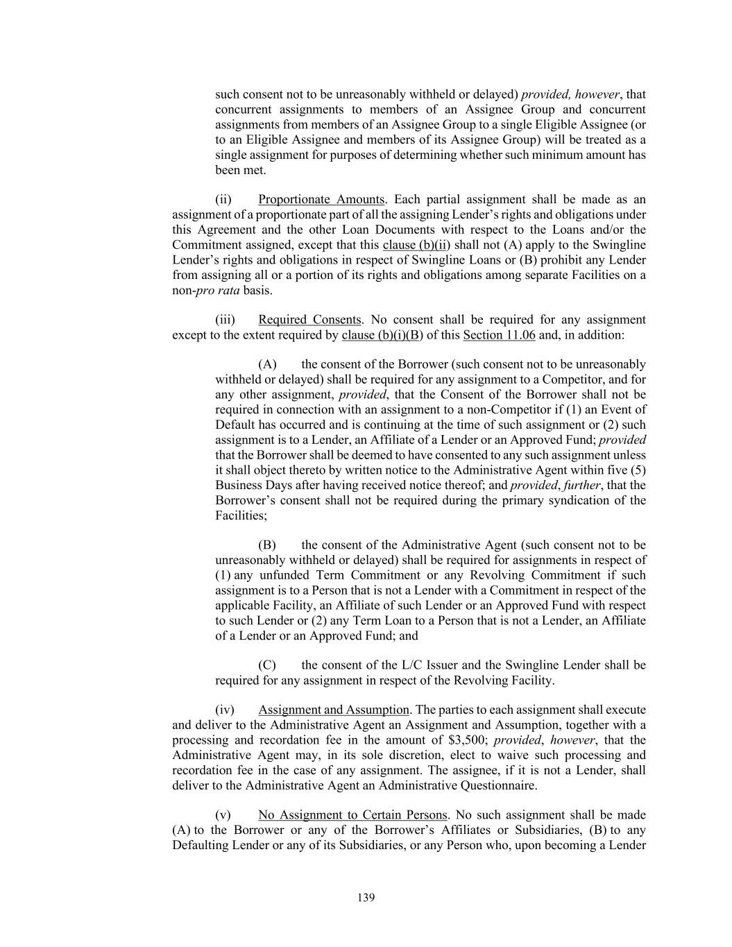 139 such consent not to be unreasonably withheld or delayed) provided, however, that concurrent assignments to members of an Assignee Group and concurrent assignments from members of an Assignee Group to a single Eligible Assignee (or to an Eligible Assignee and members of its Assignee Group) will be treated as a single assignment for purposes of determining whether such minimum amount has been met. (ii) Proportionate Amounts. Each partial assignment shall be made as an assignment of a proportionate part of all the assigning Lender’s rights and obligations under this Agreement and the other Loan Documents with respect to the Loans and/or the Commitment assigned, except that this clause (b)(ii) shall not (A) apply to the Swingline Lender’s rights and obligations in respect of Swingline Loans or (B) prohibit any Lender from assigning all or a portion of its rights and obligations among separate Facilities on a non-pro rata basis. (iii) Required Consents. No consent shall be required for any assignment except to the extent required by clause (b)(i)(B) of this Section 11.06 and, in addition: (A) the consent of the Borrower (such consent not to be unreasonably withheld or delayed) shall be required for any assignment to a Competitor, and for any other assignment, provided, that the Consent of the Borrower shall not be required in connection with an assignment to a non-Competitor if (1) an Event of Default has occurred and is continuing at the time of such assignment or (2) such assignment is to a Lender, an Affiliate of a Lender or an Approved Fund; provided that the Borrower shall be deemed to have consented to any such assignment unless it shall object thereto by written notice to the Administrative Agent within five (5) Business Days after having received notice thereof; and provided, further, that the Borrower’s consent shall not be required during the primary syndication of the Facilities; (B) the consent of the Administrative Agent (such consent not to be unreasonably withheld or delayed) shall be required for assignments in respect of (1) any unfunded Term Commitment or any Revolving Commitment if such assignment is to a Person that is not a Lender with a Commitment in respect of the applicable Facility, an Affiliate of such Lender or an Approved Fund with respect to such Lender or (2) any Term Loan to a Person that is not a Lender, an Affiliate of a Lender or an Approved Fund; and (C) the consent of the L/C Issuer and the Swingline Lender shall be required for any assignment in respect of the Revolving Facility. (iv) Assignment and Assumption. The parties to each assignment shall execute and deliver to the Administrative Agent an Assignment and Assumption, together with a processing and recordation fee in the amount of $3,500; provided, however, that the Administrative Agent may, in its sole discretion, elect to waive such processing and recordation fee in the case of any assignment. The assignee, if it is not a Lender, shall deliver to the Administrative Agent an Administrative Questionnaire. (v) No Assignment to Certain Persons. No such assignment shall be made (A) to the Borrower or any of the Borrower’s Affiliates or Subsidiaries, (B) to any Defaulting Lender or any of its Subsidiaries, or any Person who, upon becoming a Lender
