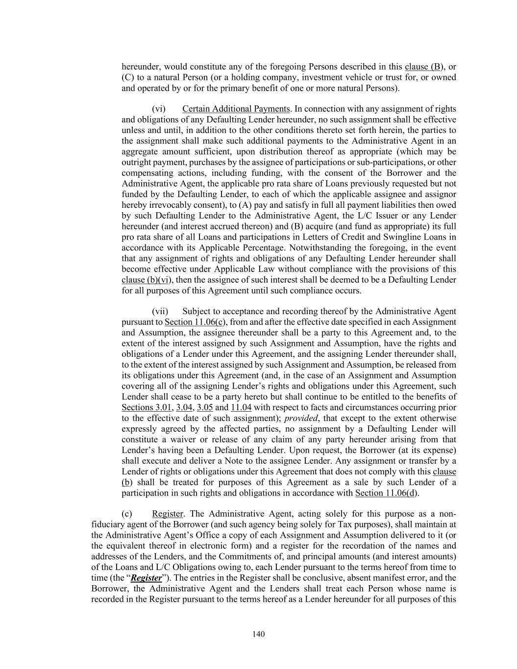 140 hereunder, would constitute any of the foregoing Persons described in this clause (B), or (C) to a natural Person (or a holding company, investment vehicle or trust for, or owned and operated by or for the primary benefit of one or more natural Persons). (vi) Certain Additional Payments. In connection with any assignment of rights and obligations of any Defaulting Lender hereunder, no such assignment shall be effective unless and until, in addition to the other conditions thereto set forth herein, the parties to the assignment shall make such additional payments to the Administrative Agent in an aggregate amount sufficient, upon distribution thereof as appropriate (which may be outright payment, purchases by the assignee of participations or sub-participations, or other compensating actions, including funding, with the consent of the Borrower and the Administrative Agent, the applicable pro rata share of Loans previously requested but not funded by the Defaulting Lender, to each of which the applicable assignee and assignor hereby irrevocably consent), to (A) pay and satisfy in full all payment liabilities then owed by such Defaulting Lender to the Administrative Agent, the L/C Issuer or any Lender hereunder (and interest accrued thereon) and (B) acquire (and fund as appropriate) its full pro rata share of all Loans and participations in Letters of Credit and Swingline Loans in accordance with its Applicable Percentage. Notwithstanding the foregoing, in the event that any assignment of rights and obligations of any Defaulting Lender hereunder shall become effective under Applicable Law without compliance with the provisions of this clause (b)(vi), then the assignee of such interest shall be deemed to be a Defaulting Lender for all purposes of this Agreement until such compliance occurs. (vii) Subject to acceptance and recording thereof by the Administrative Agent pursuant to Section 11.06(c), from and after the effective date specified in each Assignment and Assumption, the assignee thereunder shall be a party to this Agreement and, to the extent of the interest assigned by such Assignment and Assumption, have the rights and obligations of a Lender under this Agreement, and the assigning Lender thereunder shall, to the extent of the interest assigned by such Assignment and Assumption, be released from its obligations under this Agreement (and, in the case of an Assignment and Assumption covering all of the assigning Lender’s rights and obligations under this Agreement, such Lender shall cease to be a party hereto but shall continue to be entitled to the benefits of Sections 3.01, 3.04, 3.05 and 11.04 with respect to facts and circumstances occurring prior to the effective date of such assignment); provided, that except to the extent otherwise expressly agreed by the affected parties, no assignment by a Defaulting Lender will constitute a waiver or release of any claim of any party hereunder arising from that Lender’s having been a Defaulting Lender. Upon request, the Borrower (at its expense) shall execute and deliver a Note to the assignee Lender. Any assignment or transfer by a Lender of rights or obligations under this Agreement that does not comply with this clause (b) shall be treated for purposes of this Agreement as a sale by such Lender of a participation in such rights and obligations in accordance with Section 11.06(d). (c) Register. The Administrative Agent, acting solely for this purpose as a non- fiduciary agent of the Borrower (and such agency being solely for Tax purposes), shall maintain at the Administrative Agent’s Office a copy of each Assignment and Assumption delivered to it (or the equivalent thereof in electronic form) and a register for the recordation of the names and addresses of the Lenders, and the Commitments of, and principal amounts (and interest amounts) of the Loans and L/C Obligations owing to, each Lender pursuant to the terms hereof from time to time (the “Register”). The entries in the Register shall be conclusive, absent manifest error, and the Borrower, the Administrative Agent and the Lenders shall treat each Person whose name is recorded in the Register pursuant to the terms hereof as a Lender hereunder for all purposes of this