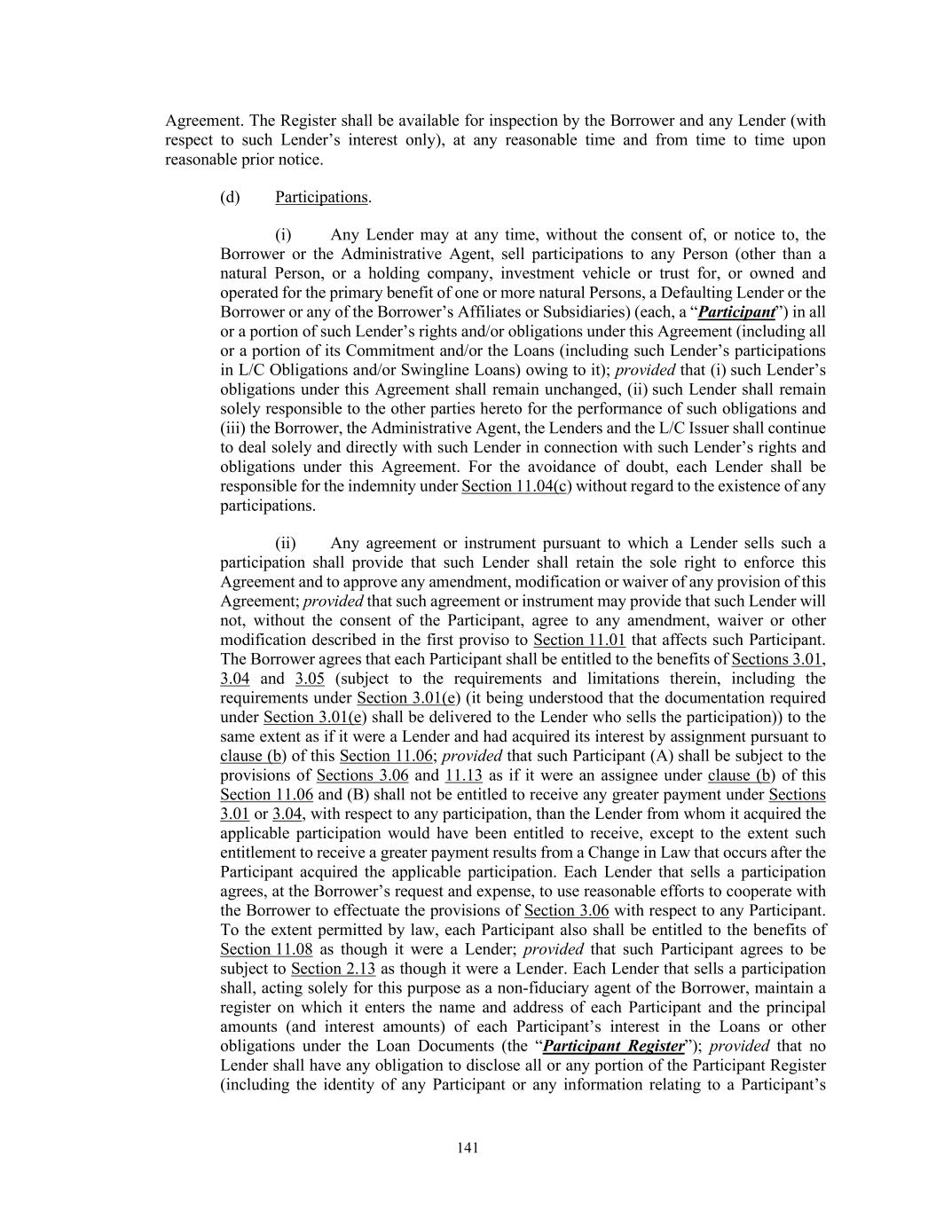 141 Agreement. The Register shall be available for inspection by the Borrower and any Lender (with respect to such Lender’s interest only), at any reasonable time and from time to time upon reasonable prior notice. (d) Participations. (i) Any Lender may at any time, without the consent of, or notice to, the Borrower or the Administrative Agent, sell participations to any Person (other than a natural Person, or a holding company, investment vehicle or trust for, or owned and operated for the primary benefit of one or more natural Persons, a Defaulting Lender or the Borrower or any of the Borrower’s Affiliates or Subsidiaries) (each, a “Participant”) in all or a portion of such Lender’s rights and/or obligations under this Agreement (including all or a portion of its Commitment and/or the Loans (including such Lender’s participations in L/C Obligations and/or Swingline Loans) owing to it); provided that (i) such Lender’s obligations under this Agreement shall remain unchanged, (ii) such Lender shall remain solely responsible to the other parties hereto for the performance of such obligations and (iii) the Borrower, the Administrative Agent, the Lenders and the L/C Issuer shall continue to deal solely and directly with such Lender in connection with such Lender’s rights and obligations under this Agreement. For the avoidance of doubt, each Lender shall be responsible for the indemnity under Section 11.04(c) without regard to the existence of any participations. (ii) Any agreement or instrument pursuant to which a Lender sells such a participation shall provide that such Lender shall retain the sole right to enforce this Agreement and to approve any amendment, modification or waiver of any provision of this Agreement; provided that such agreement or instrument may provide that such Lender will not, without the consent of the Participant, agree to any amendment, waiver or other modification described in the first proviso to Section 11.01 that affects such Participant. The Borrower agrees that each Participant shall be entitled to the benefits of Sections 3.01, 3.04 and 3.05 (subject to the requirements and limitations therein, including the requirements under Section 3.01(e) (it being understood that the documentation required under Section 3.01(e) shall be delivered to the Lender who sells the participation)) to the same extent as if it were a Lender and had acquired its interest by assignment pursuant to clause (b) of this Section 11.06; provided that such Participant (A) shall be subject to the provisions of Sections 3.06 and 11.13 as if it were an assignee under clause (b) of this Section 11.06 and (B) shall not be entitled to receive any greater payment under Sections 3.01 or 3.04, with respect to any participation, than the Lender from whom it acquired the applicable participation would have been entitled to receive, except to the extent such entitlement to receive a greater payment results from a Change in Law that occurs after the Participant acquired the applicable participation. Each Lender that sells a participation agrees, at the Borrower’s request and expense, to use reasonable efforts to cooperate with the Borrower to effectuate the provisions of Section 3.06 with respect to any Participant. To the extent permitted by law, each Participant also shall be entitled to the benefits of Section 11.08 as though it were a Lender; provided that such Participant agrees to be subject to Section 2.13 as though it were a Lender. Each Lender that sells a participation shall, acting solely for this purpose as a non-fiduciary agent of the Borrower, maintain a register on which it enters the name and address of each Participant and the principal amounts (and interest amounts) of each Participant’s interest in the Loans or other obligations under the Loan Documents (the “Participant Register”); provided that no Lender shall have any obligation to disclose all or any portion of the Participant Register (including the identity of any Participant or any information relating to a Participant’s