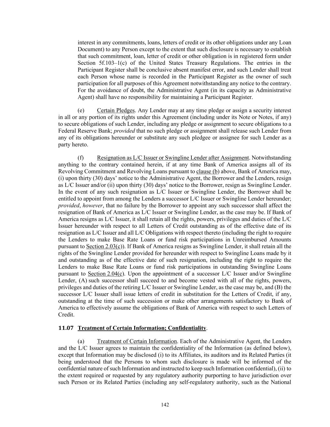 142 interest in any commitments, loans, letters of credit or its other obligations under any Loan Document) to any Person except to the extent that such disclosure is necessary to establish that such commitment, loan, letter of credit or other obligation is in registered form under Section 5f.103–1(c) of the United States Treasury Regulations. The entries in the Participant Register shall be conclusive absent manifest error, and such Lender shall treat each Person whose name is recorded in the Participant Register as the owner of such participation for all purposes of this Agreement notwithstanding any notice to the contrary. For the avoidance of doubt, the Administrative Agent (in its capacity as Administrative Agent) shall have no responsibility for maintaining a Participant Register. (e) Certain Pledges. Any Lender may at any time pledge or assign a security interest in all or any portion of its rights under this Agreement (including under its Note or Notes, if any) to secure obligations of such Lender, including any pledge or assignment to secure obligations to a Federal Reserve Bank; provided that no such pledge or assignment shall release such Lender from any of its obligations hereunder or substitute any such pledgee or assignee for such Lender as a party hereto. (f) Resignation as L/C Issuer or Swingline Lender after Assignment. Notwithstanding anything to the contrary contained herein, if at any time Bank of America assigns all of its Revolving Commitment and Revolving Loans pursuant to clause (b) above, Bank of America may, (i) upon thirty (30) days’ notice to the Administrative Agent, the Borrower and the Lenders, resign as L/C Issuer and/or (ii) upon thirty (30) days’ notice to the Borrower, resign as Swingline Lender. In the event of any such resignation as L/C Issuer or Swingline Lender, the Borrower shall be entitled to appoint from among the Lenders a successor L/C Issuer or Swingline Lender hereunder; provided, however, that no failure by the Borrower to appoint any such successor shall affect the resignation of Bank of America as L/C Issuer or Swingline Lender, as the case may be. If Bank of America resigns as L/C Issuer, it shall retain all the rights, powers, privileges and duties of the L/C Issuer hereunder with respect to all Letters of Credit outstanding as of the effective date of its resignation as L/C Issuer and all L/C Obligations with respect thereto (including the right to require the Lenders to make Base Rate Loans or fund risk participations in Unreimbursed Amounts pursuant to Section 2.03(c)). If Bank of America resigns as Swingline Lender, it shall retain all the rights of the Swingline Lender provided for hereunder with respect to Swingline Loans made by it and outstanding as of the effective date of such resignation, including the right to require the Lenders to make Base Rate Loans or fund risk participations in outstanding Swingline Loans pursuant to Section 2.04(c). Upon the appointment of a successor L/C Issuer and/or Swingline Lender, (A) such successor shall succeed to and become vested with all of the rights, powers, privileges and duties of the retiring L/C Issuer or Swingline Lender, as the case may be, and (B) the successor L/C Issuer shall issue letters of credit in substitution for the Letters of Credit, if any, outstanding at the time of such succession or make other arrangements satisfactory to Bank of America to effectively assume the obligations of Bank of America with respect to such Letters of Credit. 11.07 Treatment of Certain Information; Confidentiality. (a) Treatment of Certain Information. Each of the Administrative Agent, the Lenders and the L/C Issuer agrees to maintain the confidentiality of the Information (as defined below), except that Information may be disclosed (i) to its Affiliates, its auditors and its Related Parties (it being understood that the Persons to whom such disclosure is made will be informed of the confidential nature of such Information and instructed to keep such Information confidential), (ii) to the extent required or requested by any regulatory authority purporting to have jurisdiction over such Person or its Related Parties (including any self-regulatory authority, such as the National