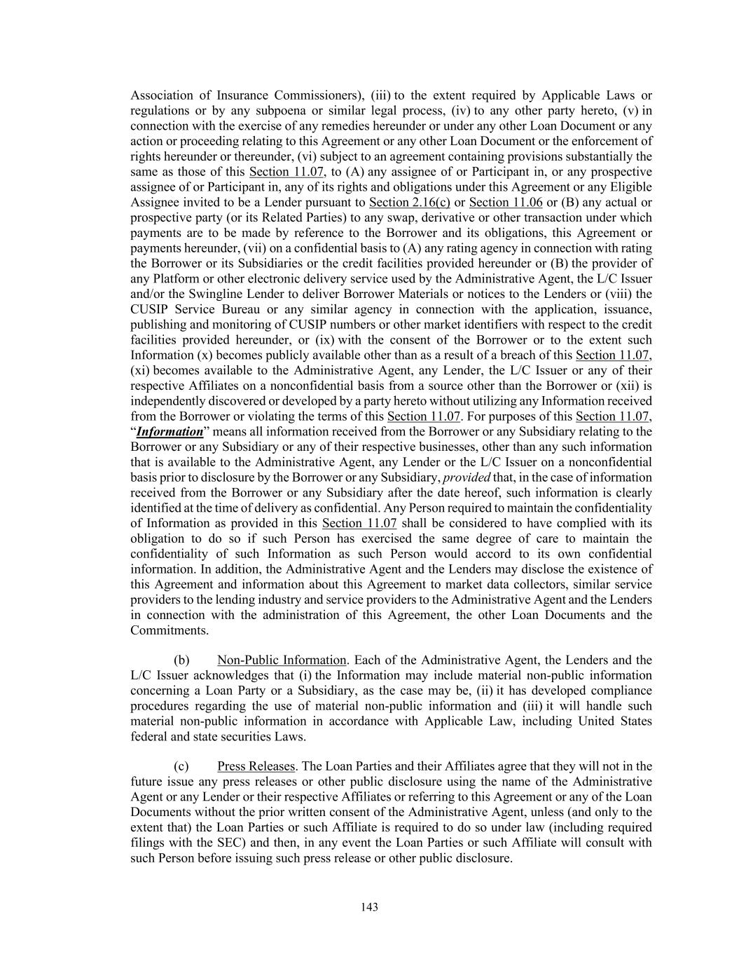 143 Association of Insurance Commissioners), (iii) to the extent required by Applicable Laws or regulations or by any subpoena or similar legal process, (iv) to any other party hereto, (v) in connection with the exercise of any remedies hereunder or under any other Loan Document or any action or proceeding relating to this Agreement or any other Loan Document or the enforcement of rights hereunder or thereunder, (vi) subject to an agreement containing provisions substantially the same as those of this Section 11.07, to (A) any assignee of or Participant in, or any prospective assignee of or Participant in, any of its rights and obligations under this Agreement or any Eligible Assignee invited to be a Lender pursuant to Section 2.16(c) or Section 11.06 or (B) any actual or prospective party (or its Related Parties) to any swap, derivative or other transaction under which payments are to be made by reference to the Borrower and its obligations, this Agreement or payments hereunder, (vii) on a confidential basis to (A) any rating agency in connection with rating the Borrower or its Subsidiaries or the credit facilities provided hereunder or (B) the provider of any Platform or other electronic delivery service used by the Administrative Agent, the L/C Issuer and/or the Swingline Lender to deliver Borrower Materials or notices to the Lenders or (viii) the CUSIP Service Bureau or any similar agency in connection with the application, issuance, publishing and monitoring of CUSIP numbers or other market identifiers with respect to the credit facilities provided hereunder, or (ix) with the consent of the Borrower or to the extent such Information (x) becomes publicly available other than as a result of a breach of this Section 11.07, (xi) becomes available to the Administrative Agent, any Lender, the L/C Issuer or any of their respective Affiliates on a nonconfidential basis from a source other than the Borrower or (xii) is independently discovered or developed by a party hereto without utilizing any Information received from the Borrower or violating the terms of this Section 11.07. For purposes of this Section 11.07, “Information” means all information received from the Borrower or any Subsidiary relating to the Borrower or any Subsidiary or any of their respective businesses, other than any such information that is available to the Administrative Agent, any Lender or the L/C Issuer on a nonconfidential basis prior to disclosure by the Borrower or any Subsidiary, provided that, in the case of information received from the Borrower or any Subsidiary after the date hereof, such information is clearly identified at the time of delivery as confidential. Any Person required to maintain the confidentiality of Information as provided in this Section 11.07 shall be considered to have complied with its obligation to do so if such Person has exercised the same degree of care to maintain the confidentiality of such Information as such Person would accord to its own confidential information. In addition, the Administrative Agent and the Lenders may disclose the existence of this Agreement and information about this Agreement to market data collectors, similar service providers to the lending industry and service providers to the Administrative Agent and the Lenders in connection with the administration of this Agreement, the other Loan Documents and the Commitments. (b) Non-Public Information. Each of the Administrative Agent, the Lenders and the L/C Issuer acknowledges that (i) the Information may include material non-public information concerning a Loan Party or a Subsidiary, as the case may be, (ii) it has developed compliance procedures regarding the use of material non-public information and (iii) it will handle such material non-public information in accordance with Applicable Law, including United States federal and state securities Laws. (c) Press Releases. The Loan Parties and their Affiliates agree that they will not in the future issue any press releases or other public disclosure using the name of the Administrative Agent or any Lender or their respective Affiliates or referring to this Agreement or any of the Loan Documents without the prior written consent of the Administrative Agent, unless (and only to the extent that) the Loan Parties or such Affiliate is required to do so under law (including required filings with the SEC) and then, in any event the Loan Parties or such Affiliate will consult with such Person before issuing such press release or other public disclosure.