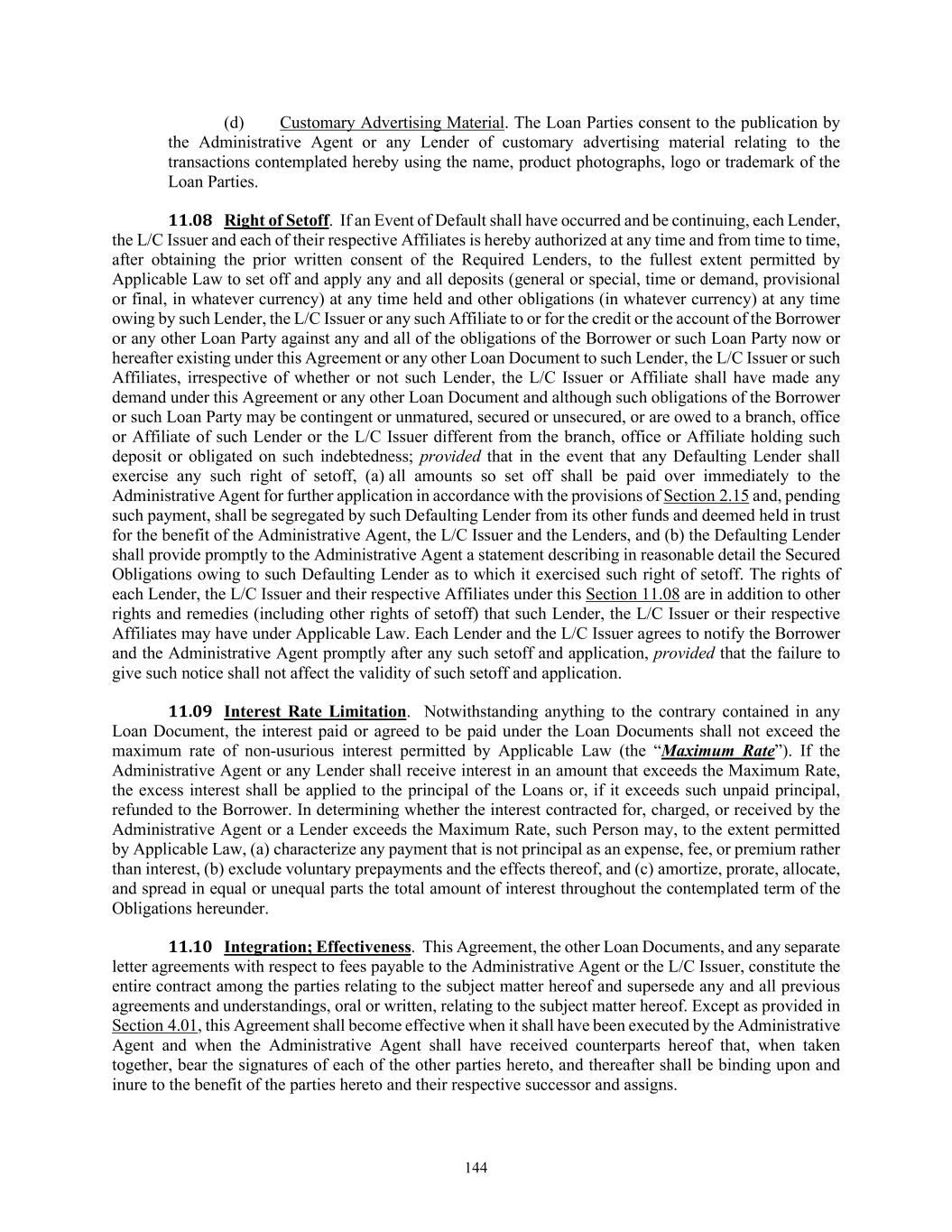 144 (d) Customary Advertising Material. The Loan Parties consent to the publication by the Administrative Agent or any Lender of customary advertising material relating to the transactions contemplated hereby using the name, product photographs, logo or trademark of the Loan Parties. 11.08 Right of Setoff. If an Event of Default shall have occurred and be continuing, each Lender, the L/C Issuer and each of their respective Affiliates is hereby authorized at any time and from time to time, after obtaining the prior written consent of the Required Lenders, to the fullest extent permitted by Applicable Law to set off and apply any and all deposits (general or special, time or demand, provisional or final, in whatever currency) at any time held and other obligations (in whatever currency) at any time owing by such Lender, the L/C Issuer or any such Affiliate to or for the credit or the account of the Borrower or any other Loan Party against any and all of the obligations of the Borrower or such Loan Party now or hereafter existing under this Agreement or any other Loan Document to such Lender, the L/C Issuer or such Affiliates, irrespective of whether or not such Lender, the L/C Issuer or Affiliate shall have made any demand under this Agreement or any other Loan Document and although such obligations of the Borrower or such Loan Party may be contingent or unmatured, secured or unsecured, or are owed to a branch, office or Affiliate of such Lender or the L/C Issuer different from the branch, office or Affiliate holding such deposit or obligated on such indebtedness; provided that in the event that any Defaulting Lender shall exercise any such right of setoff, (a) all amounts so set off shall be paid over immediately to the Administrative Agent for further application in accordance with the provisions of Section 2.15 and, pending such payment, shall be segregated by such Defaulting Lender from its other funds and deemed held in trust for the benefit of the Administrative Agent, the L/C Issuer and the Lenders, and (b) the Defaulting Lender shall provide promptly to the Administrative Agent a statement describing in reasonable detail the Secured Obligations owing to such Defaulting Lender as to which it exercised such right of setoff. The rights of each Lender, the L/C Issuer and their respective Affiliates under this Section 11.08 are in addition to other rights and remedies (including other rights of setoff) that such Lender, the L/C Issuer or their respective Affiliates may have under Applicable Law. Each Lender and the L/C Issuer agrees to notify the Borrower and the Administrative Agent promptly after any such setoff and application, provided that the failure to give such notice shall not affect the validity of such setoff and application. 11.09 Interest Rate Limitation. Notwithstanding anything to the contrary contained in any Loan Document, the interest paid or agreed to be paid under the Loan Documents shall not exceed the maximum rate of non-usurious interest permitted by Applicable Law (the “Maximum Rate”). If the Administrative Agent or any Lender shall receive interest in an amount that exceeds the Maximum Rate, the excess interest shall be applied to the principal of the Loans or, if it exceeds such unpaid principal, refunded to the Borrower. In determining whether the interest contracted for, charged, or received by the Administrative Agent or a Lender exceeds the Maximum Rate, such Person may, to the extent permitted by Applicable Law, (a) characterize any payment that is not principal as an expense, fee, or premium rather than interest, (b) exclude voluntary prepayments and the effects thereof, and (c) amortize, prorate, allocate, and spread in equal or unequal parts the total amount of interest throughout the contemplated term of the Obligations hereunder. 11.10 Integration; Effectiveness. This Agreement, the other Loan Documents, and any separate letter agreements with respect to fees payable to the Administrative Agent or the L/C Issuer, constitute the entire contract among the parties relating to the subject matter hereof and supersede any and all previous agreements and understandings, oral or written, relating to the subject matter hereof. Except as provided in Section 4.01, this Agreement shall become effective when it shall have been executed by the Administrative Agent and when the Administrative Agent shall have received counterparts hereof that, when taken together, bear the signatures of each of the other parties hereto, and thereafter shall be binding upon and inure to the benefit of the parties hereto and their respective successor and assigns.