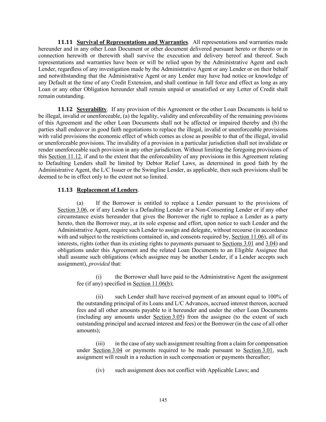 145 11.11 Survival of Representations and Warranties. All representations and warranties made hereunder and in any other Loan Document or other document delivered pursuant hereto or thereto or in connection herewith or therewith shall survive the execution and delivery hereof and thereof. Such representations and warranties have been or will be relied upon by the Administrative Agent and each Lender, regardless of any investigation made by the Administrative Agent or any Lender or on their behalf and notwithstanding that the Administrative Agent or any Lender may have had notice or knowledge of any Default at the time of any Credit Extension, and shall continue in full force and effect as long as any Loan or any other Obligation hereunder shall remain unpaid or unsatisfied or any Letter of Credit shall remain outstanding. 11.12 Severability. If any provision of this Agreement or the other Loan Documents is held to be illegal, invalid or unenforceable, (a) the legality, validity and enforceability of the remaining provisions of this Agreement and the other Loan Documents shall not be affected or impaired thereby and (b) the parties shall endeavor in good faith negotiations to replace the illegal, invalid or unenforceable provisions with valid provisions the economic effect of which comes as close as possible to that of the illegal, invalid or unenforceable provisions. The invalidity of a provision in a particular jurisdiction shall not invalidate or render unenforceable such provision in any other jurisdiction. Without limiting the foregoing provisions of this Section 11.12, if and to the extent that the enforceability of any provisions in this Agreement relating to Defaulting Lenders shall be limited by Debtor Relief Laws, as determined in good faith by the Administrative Agent, the L/C Issuer or the Swingline Lender, as applicable, then such provisions shall be deemed to be in effect only to the extent not so limited. 11.13 Replacement of Lenders. (a) If the Borrower is entitled to replace a Lender pursuant to the provisions of Section 3.06, or if any Lender is a Defaulting Lender or a Non-Consenting Lender or if any other circumstance exists hereunder that gives the Borrower the right to replace a Lender as a party hereto, then the Borrower may, at its sole expense and effort, upon notice to such Lender and the Administrative Agent, require such Lender to assign and delegate, without recourse (in accordance with and subject to the restrictions contained in, and consents required by, Section 11.06), all of its interests, rights (other than its existing rights to payments pursuant to Sections 3.01 and 3.04) and obligations under this Agreement and the related Loan Documents to an Eligible Assignee that shall assume such obligations (which assignee may be another Lender, if a Lender accepts such assignment), provided that: (i) the Borrower shall have paid to the Administrative Agent the assignment fee (if any) specified in Section 11.06(b); (ii) such Lender shall have received payment of an amount equal to 100% of the outstanding principal of its Loans and L/C Advances, accrued interest thereon, accrued fees and all other amounts payable to it hereunder and under the other Loan Documents (including any amounts under Section 3.05) from the assignee (to the extent of such outstanding principal and accrued interest and fees) or the Borrower (in the case of all other amounts); (iii) in the case of any such assignment resulting from a claim for compensation under Section 3.04 or payments required to be made pursuant to Section 3.01, such assignment will result in a reduction in such compensation or payments thereafter; (iv) such assignment does not conflict with Applicable Laws; and