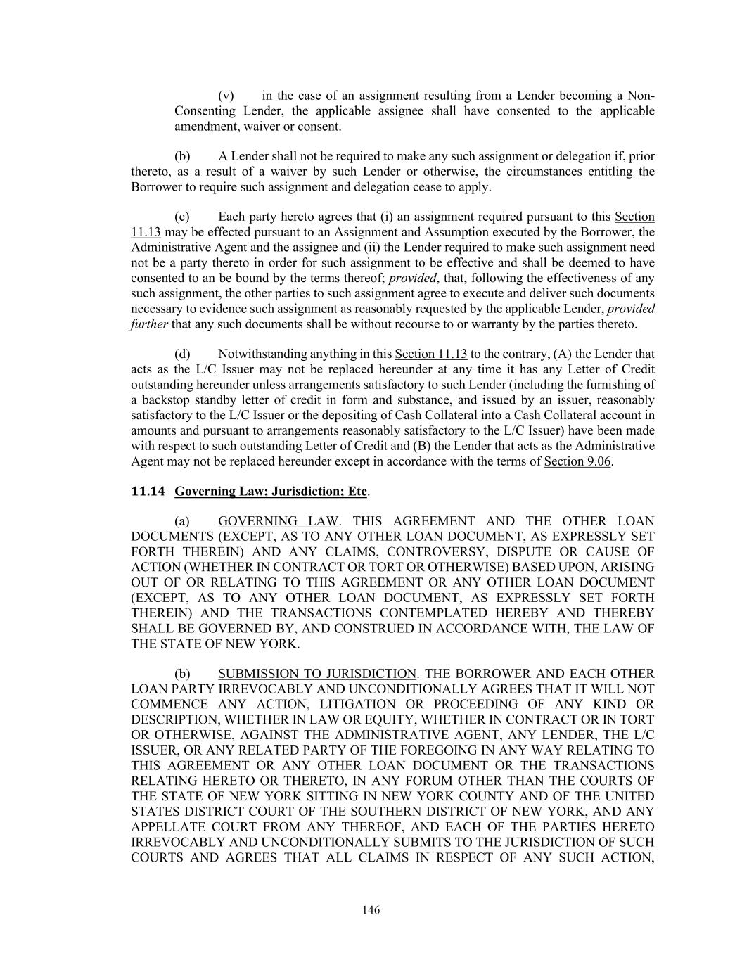 146 (v) in the case of an assignment resulting from a Lender becoming a Non- Consenting Lender, the applicable assignee shall have consented to the applicable amendment, waiver or consent. (b) A Lender shall not be required to make any such assignment or delegation if, prior thereto, as a result of a waiver by such Lender or otherwise, the circumstances entitling the Borrower to require such assignment and delegation cease to apply. (c) Each party hereto agrees that (i) an assignment required pursuant to this Section 11.13 may be effected pursuant to an Assignment and Assumption executed by the Borrower, the Administrative Agent and the assignee and (ii) the Lender required to make such assignment need not be a party thereto in order for such assignment to be effective and shall be deemed to have consented to an be bound by the terms thereof; provided, that, following the effectiveness of any such assignment, the other parties to such assignment agree to execute and deliver such documents necessary to evidence such assignment as reasonably requested by the applicable Lender, provided further that any such documents shall be without recourse to or warranty by the parties thereto. (d) Notwithstanding anything in this Section 11.13 to the contrary, (A) the Lender that acts as the L/C Issuer may not be replaced hereunder at any time it has any Letter of Credit outstanding hereunder unless arrangements satisfactory to such Lender (including the furnishing of a backstop standby letter of credit in form and substance, and issued by an issuer, reasonably satisfactory to the L/C Issuer or the depositing of Cash Collateral into a Cash Collateral account in amounts and pursuant to arrangements reasonably satisfactory to the L/C Issuer) have been made with respect to such outstanding Letter of Credit and (B) the Lender that acts as the Administrative Agent may not be replaced hereunder except in accordance with the terms of Section 9.06. 11.14 Governing Law; Jurisdiction; Etc. (a) GOVERNING LAW. THIS AGREEMENT AND THE OTHER LOAN DOCUMENTS (EXCEPT, AS TO ANY OTHER LOAN DOCUMENT, AS EXPRESSLY SET FORTH THEREIN) AND ANY CLAIMS, CONTROVERSY, DISPUTE OR CAUSE OF ACTION (WHETHER IN CONTRACT OR TORT OR OTHERWISE) BASED UPON, ARISING OUT OF OR RELATING TO THIS AGREEMENT OR ANY OTHER LOAN DOCUMENT (EXCEPT, AS TO ANY OTHER LOAN DOCUMENT, AS EXPRESSLY SET FORTH THEREIN) AND THE TRANSACTIONS CONTEMPLATED HEREBY AND THEREBY SHALL BE GOVERNED BY, AND CONSTRUED IN ACCORDANCE WITH, THE LAW OF THE STATE OF NEW YORK. (b) SUBMISSION TO JURISDICTION. THE BORROWER AND EACH OTHER LOAN PARTY IRREVOCABLY AND UNCONDITIONALLY AGREES THAT IT WILL NOT COMMENCE ANY ACTION, LITIGATION OR PROCEEDING OF ANY KIND OR DESCRIPTION, WHETHER IN LAW OR EQUITY, WHETHER IN CONTRACT OR IN TORT OR OTHERWISE, AGAINST THE ADMINISTRATIVE AGENT, ANY LENDER, THE L/C ISSUER, OR ANY RELATED PARTY OF THE FOREGOING IN ANY WAY RELATING TO THIS AGREEMENT OR ANY OTHER LOAN DOCUMENT OR THE TRANSACTIONS RELATING HERETO OR THERETO, IN ANY FORUM OTHER THAN THE COURTS OF THE STATE OF NEW YORK SITTING IN NEW YORK COUNTY AND OF THE UNITED STATES DISTRICT COURT OF THE SOUTHERN DISTRICT OF NEW YORK, AND ANY APPELLATE COURT FROM ANY THEREOF, AND EACH OF THE PARTIES HERETO IRREVOCABLY AND UNCONDITIONALLY SUBMITS TO THE JURISDICTION OF SUCH COURTS AND AGREES THAT ALL CLAIMS IN RESPECT OF ANY SUCH ACTION,
