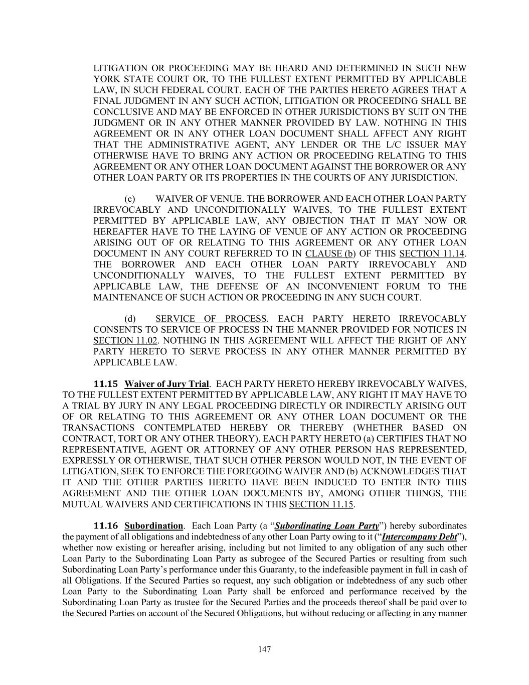 147 LITIGATION OR PROCEEDING MAY BE HEARD AND DETERMINED IN SUCH NEW YORK STATE COURT OR, TO THE FULLEST EXTENT PERMITTED BY APPLICABLE LAW, IN SUCH FEDERAL COURT. EACH OF THE PARTIES HERETO AGREES THAT A FINAL JUDGMENT IN ANY SUCH ACTION, LITIGATION OR PROCEEDING SHALL BE CONCLUSIVE AND MAY BE ENFORCED IN OTHER JURISDICTIONS BY SUIT ON THE JUDGMENT OR IN ANY OTHER MANNER PROVIDED BY LAW. NOTHING IN THIS AGREEMENT OR IN ANY OTHER LOAN DOCUMENT SHALL AFFECT ANY RIGHT THAT THE ADMINISTRATIVE AGENT, ANY LENDER OR THE L/C ISSUER MAY OTHERWISE HAVE TO BRING ANY ACTION OR PROCEEDING RELATING TO THIS AGREEMENT OR ANY OTHER LOAN DOCUMENT AGAINST THE BORROWER OR ANY OTHER LOAN PARTY OR ITS PROPERTIES IN THE COURTS OF ANY JURISDICTION. (c) WAIVER OF VENUE. THE BORROWER AND EACH OTHER LOAN PARTY IRREVOCABLY AND UNCONDITIONALLY WAIVES, TO THE FULLEST EXTENT PERMITTED BY APPLICABLE LAW, ANY OBJECTION THAT IT MAY NOW OR HEREAFTER HAVE TO THE LAYING OF VENUE OF ANY ACTION OR PROCEEDING ARISING OUT OF OR RELATING TO THIS AGREEMENT OR ANY OTHER LOAN DOCUMENT IN ANY COURT REFERRED TO IN CLAUSE (b) OF THIS SECTION 11.14. THE BORROWER AND EACH OTHER LOAN PARTY IRREVOCABLY AND UNCONDITIONALLY WAIVES, TO THE FULLEST EXTENT PERMITTED BY APPLICABLE LAW, THE DEFENSE OF AN INCONVENIENT FORUM TO THE MAINTENANCE OF SUCH ACTION OR PROCEEDING IN ANY SUCH COURT. (d) SERVICE OF PROCESS. EACH PARTY HERETO IRREVOCABLY CONSENTS TO SERVICE OF PROCESS IN THE MANNER PROVIDED FOR NOTICES IN SECTION 11.02. NOTHING IN THIS AGREEMENT WILL AFFECT THE RIGHT OF ANY PARTY HERETO TO SERVE PROCESS IN ANY OTHER MANNER PERMITTED BY APPLICABLE LAW. 11.15 Waiver of Jury Trial. EACH PARTY HERETO HEREBY IRREVOCABLY WAIVES, TO THE FULLEST EXTENT PERMITTED BY APPLICABLE LAW, ANY RIGHT IT MAY HAVE TO A TRIAL BY JURY IN ANY LEGAL PROCEEDING DIRECTLY OR INDIRECTLY ARISING OUT OF OR RELATING TO THIS AGREEMENT OR ANY OTHER LOAN DOCUMENT OR THE TRANSACTIONS CONTEMPLATED HEREBY OR THEREBY (WHETHER BASED ON CONTRACT, TORT OR ANY OTHER THEORY). EACH PARTY HERETO (a) CERTIFIES THAT NO REPRESENTATIVE, AGENT OR ATTORNEY OF ANY OTHER PERSON HAS REPRESENTED, EXPRESSLY OR OTHERWISE, THAT SUCH OTHER PERSON WOULD NOT, IN THE EVENT OF LITIGATION, SEEK TO ENFORCE THE FOREGOING WAIVER AND (b) ACKNOWLEDGES THAT IT AND THE OTHER PARTIES HERETO HAVE BEEN INDUCED TO ENTER INTO THIS AGREEMENT AND THE OTHER LOAN DOCUMENTS BY, AMONG OTHER THINGS, THE MUTUAL WAIVERS AND CERTIFICATIONS IN THIS SECTION 11.15. 11.16 Subordination. Each Loan Party (a “Subordinating Loan Party”) hereby subordinates the payment of all obligations and indebtedness of any other Loan Party owing to it (“Intercompany Debt”), whether now existing or hereafter arising, including but not limited to any obligation of any such other Loan Party to the Subordinating Loan Party as subrogee of the Secured Parties or resulting from such Subordinating Loan Party’s performance under this Guaranty, to the indefeasible payment in full in cash of all Obligations. If the Secured Parties so request, any such obligation or indebtedness of any such other Loan Party to the Subordinating Loan Party shall be enforced and performance received by the Subordinating Loan Party as trustee for the Secured Parties and the proceeds thereof shall be paid over to the Secured Parties on account of the Secured Obligations, but without reducing or affecting in any manner