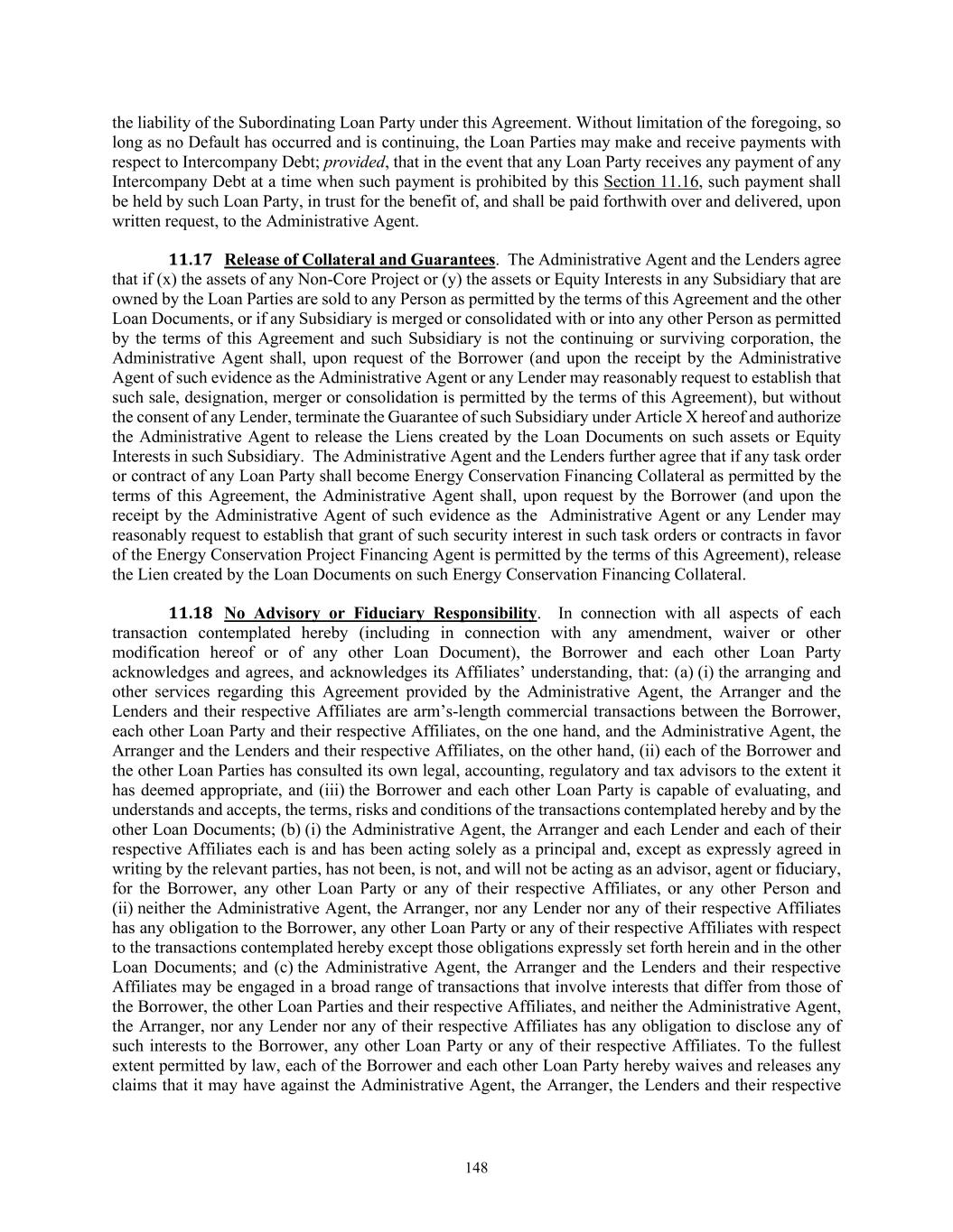148 the liability of the Subordinating Loan Party under this Agreement. Without limitation of the foregoing, so long as no Default has occurred and is continuing, the Loan Parties may make and receive payments with respect to Intercompany Debt; provided, that in the event that any Loan Party receives any payment of any Intercompany Debt at a time when such payment is prohibited by this Section 11.16, such payment shall be held by such Loan Party, in trust for the benefit of, and shall be paid forthwith over and delivered, upon written request, to the Administrative Agent. 11.17 Release of Collateral and Guarantees. The Administrative Agent and the Lenders agree that if (x) the assets of any Non-Core Project or (y) the assets or Equity Interests in any Subsidiary that are owned by the Loan Parties are sold to any Person as permitted by the terms of this Agreement and the other Loan Documents, or if any Subsidiary is merged or consolidated with or into any other Person as permitted by the terms of this Agreement and such Subsidiary is not the continuing or surviving corporation, the Administrative Agent shall, upon request of the Borrower (and upon the receipt by the Administrative Agent of such evidence as the Administrative Agent or any Lender may reasonably request to establish that such sale, designation, merger or consolidation is permitted by the terms of this Agreement), but without the consent of any Lender, terminate the Guarantee of such Subsidiary under Article X hereof and authorize the Administrative Agent to release the Liens created by the Loan Documents on such assets or Equity Interests in such Subsidiary. The Administrative Agent and the Lenders further agree that if any task order or contract of any Loan Party shall become Energy Conservation Financing Collateral as permitted by the terms of this Agreement, the Administrative Agent shall, upon request by the Borrower (and upon the receipt by the Administrative Agent of such evidence as the Administrative Agent or any Lender may reasonably request to establish that grant of such security interest in such task orders or contracts in favor of the Energy Conservation Project Financing Agent is permitted by the terms of this Agreement), release the Lien created by the Loan Documents on such Energy Conservation Financing Collateral. 11.18 No Advisory or Fiduciary Responsibility. In connection with all aspects of each transaction contemplated hereby (including in connection with any amendment, waiver or other modification hereof or of any other Loan Document), the Borrower and each other Loan Party acknowledges and agrees, and acknowledges its Affiliates’ understanding, that: (a) (i) the arranging and other services regarding this Agreement provided by the Administrative Agent, the Arranger and the Lenders and their respective Affiliates are arm’s-length commercial transactions between the Borrower, each other Loan Party and their respective Affiliates, on the one hand, and the Administrative Agent, the Arranger and the Lenders and their respective Affiliates, on the other hand, (ii) each of the Borrower and the other Loan Parties has consulted its own legal, accounting, regulatory and tax advisors to the extent it has deemed appropriate, and (iii) the Borrower and each other Loan Party is capable of evaluating, and understands and accepts, the terms, risks and conditions of the transactions contemplated hereby and by the other Loan Documents; (b) (i) the Administrative Agent, the Arranger and each Lender and each of their respective Affiliates each is and has been acting solely as a principal and, except as expressly agreed in writing by the relevant parties, has not been, is not, and will not be acting as an advisor, agent or fiduciary, for the Borrower, any other Loan Party or any of their respective Affiliates, or any other Person and (ii) neither the Administrative Agent, the Arranger, nor any Lender nor any of their respective Affiliates has any obligation to the Borrower, any other Loan Party or any of their respective Affiliates with respect to the transactions contemplated hereby except those obligations expressly set forth herein and in the other Loan Documents; and (c) the Administrative Agent, the Arranger and the Lenders and their respective Affiliates may be engaged in a broad range of transactions that involve interests that differ from those of the Borrower, the other Loan Parties and their respective Affiliates, and neither the Administrative Agent, the Arranger, nor any Lender nor any of their respective Affiliates has any obligation to disclose any of such interests to the Borrower, any other Loan Party or any of their respective Affiliates. To the fullest extent permitted by law, each of the Borrower and each other Loan Party hereby waives and releases any claims that it may have against the Administrative Agent, the Arranger, the Lenders and their respective