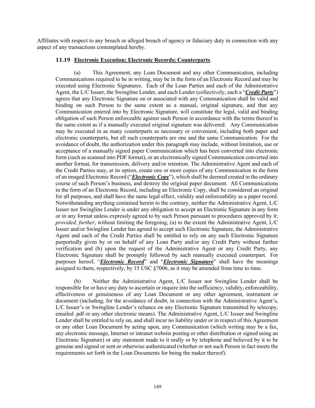 149 Affiliates with respect to any breach or alleged breach of agency or fiduciary duty in connection with any aspect of any transactions contemplated hereby. 11.19 Electronic Execution; Electronic Records; Counterparts. (a) This Agreement, any Loan Document and any other Communication, including Communications required to be in writing, may be in the form of an Electronic Record and may be executed using Electronic Signatures. Each of the Loan Parties and each of the Administrative Agent, the L/C Issuer, the Swingline Lender, and each Lender (collectively, each a “Credit Party”) agrees that any Electronic Signature on or associated with any Communication shall be valid and binding on such Person to the same extent as a manual, original signature, and that any Communication entered into by Electronic Signature, will constitute the legal, valid and binding obligation of such Person enforceable against such Person in accordance with the terms thereof to the same extent as if a manually executed original signature was delivered. Any Communication may be executed in as many counterparts as necessary or convenient, including both paper and electronic counterparts, but all such counterparts are one and the same Communication. For the avoidance of doubt, the authorization under this paragraph may include, without limitation, use or acceptance of a manually signed paper Communication which has been converted into electronic form (such as scanned into PDF format), or an electronically signed Communication converted into another format, for transmission, delivery and/or retention. The Administrative Agent and each of the Credit Parties may, at its option, create one or more copies of any Communication in the form of an imaged Electronic Record (“Electronic Copy”), which shall be deemed created in the ordinary course of such Person’s business, and destroy the original paper document. All Communications in the form of an Electronic Record, including an Electronic Copy, shall be considered an original for all purposes, and shall have the same legal effect, validity and enforceability as a paper record. Notwithstanding anything contained herein to the contrary, neither the Administrative Agent, L/C Issuer nor Swingline Lender is under any obligation to accept an Electronic Signature in any form or in any format unless expressly agreed to by such Person pursuant to procedures approved by it; provided, further, without limiting the foregoing, (a) to the extent the Administrative Agent, L/C Issuer and/or Swingline Lender has agreed to accept such Electronic Signature, the Administrative Agent and each of the Credit Parties shall be entitled to rely on any such Electronic Signature purportedly given by or on behalf of any Loan Party and/or any Credit Party without further verification and (b) upon the request of the Administrative Agent or any Credit Party, any Electronic Signature shall be promptly followed by such manually executed counterpart. For purposes hereof, “Electronic Record” and “Electronic Signature” shall have the meanings assigned to them, respectively, by 15 USC §7006, as it may be amended from time to time. (b) Neither the Administrative Agent, L/C Issuer nor Swingline Lender shall be responsible for or have any duty to ascertain or inquire into the sufficiency, validity, enforceability, effectiveness or genuineness of any Loan Document or any other agreement, instrument or document (including, for the avoidance of doubt, in connection with the Administrative Agent’s, L/C Issuer’s or Swingline Lender’s reliance on any Electronic Signature transmitted by telecopy, emailed .pdf or any other electronic means). The Administrative Agent, L/C Issuer and Swingline Lender shall be entitled to rely on, and shall incur no liability under or in respect of this Agreement or any other Loan Document by acting upon, any Communication (which writing may be a fax, any electronic message, Internet or intranet website posting or other distribution or signed using an Electronic Signature) or any statement made to it orally or by telephone and believed by it to be genuine and signed or sent or otherwise authenticated (whether or not such Person in fact meets the requirements set forth in the Loan Documents for being the maker thereof).