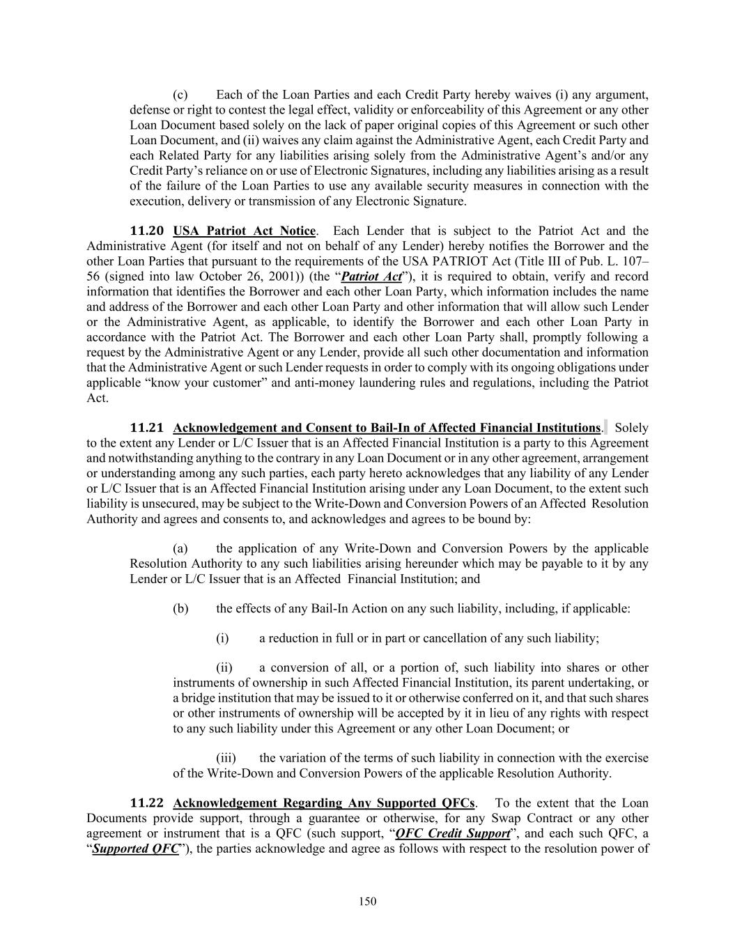 150 (c) Each of the Loan Parties and each Credit Party hereby waives (i) any argument, defense or right to contest the legal effect, validity or enforceability of this Agreement or any other Loan Document based solely on the lack of paper original copies of this Agreement or such other Loan Document, and (ii) waives any claim against the Administrative Agent, each Credit Party and each Related Party for any liabilities arising solely from the Administrative Agent’s and/or any Credit Party’s reliance on or use of Electronic Signatures, including any liabilities arising as a result of the failure of the Loan Parties to use any available security measures in connection with the execution, delivery or transmission of any Electronic Signature. 11.20 USA Patriot Act Notice. Each Lender that is subject to the Patriot Act and the Administrative Agent (for itself and not on behalf of any Lender) hereby notifies the Borrower and the other Loan Parties that pursuant to the requirements of the USA PATRIOT Act (Title III of Pub. L. 107– 56 (signed into law October 26, 2001)) (the “Patriot Act”), it is required to obtain, verify and record information that identifies the Borrower and each other Loan Party, which information includes the name and address of the Borrower and each other Loan Party and other information that will allow such Lender or the Administrative Agent, as applicable, to identify the Borrower and each other Loan Party in accordance with the Patriot Act. The Borrower and each other Loan Party shall, promptly following a request by the Administrative Agent or any Lender, provide all such other documentation and information that the Administrative Agent or such Lender requests in order to comply with its ongoing obligations under applicable “know your customer” and anti-money laundering rules and regulations, including the Patriot Act. 11.21 Acknowledgement and Consent to Bail-In of Affected Financial Institutions. Solely to the extent any Lender or L/C Issuer that is an Affected Financial Institution is a party to this Agreement and notwithstanding anything to the contrary in any Loan Document or in any other agreement, arrangement or understanding among any such parties, each party hereto acknowledges that any liability of any Lender or L/C Issuer that is an Affected Financial Institution arising under any Loan Document, to the extent such liability is unsecured, may be subject to the Write-Down and Conversion Powers of an Affected Resolution Authority and agrees and consents to, and acknowledges and agrees to be bound by: (a) the application of any Write-Down and Conversion Powers by the applicable Resolution Authority to any such liabilities arising hereunder which may be payable to it by any Lender or L/C Issuer that is an Affected Financial Institution; and (b) the effects of any Bail-In Action on any such liability, including, if applicable: (i) a reduction in full or in part or cancellation of any such liability; (ii) a conversion of all, or a portion of, such liability into shares or other instruments of ownership in such Affected Financial Institution, its parent undertaking, or a bridge institution that may be issued to it or otherwise conferred on it, and that such shares or other instruments of ownership will be accepted by it in lieu of any rights with respect to any such liability under this Agreement or any other Loan Document; or (iii) the variation of the terms of such liability in connection with the exercise of the Write-Down and Conversion Powers of the applicable Resolution Authority. 11.22 Acknowledgement Regarding Any Supported QFCs. To the extent that the Loan Documents provide support, through a guarantee or otherwise, for any Swap Contract or any other agreement or instrument that is a QFC (such support, “QFC Credit Support”, and each such QFC, a “Supported QFC”), the parties acknowledge and agree as follows with respect to the resolution power of