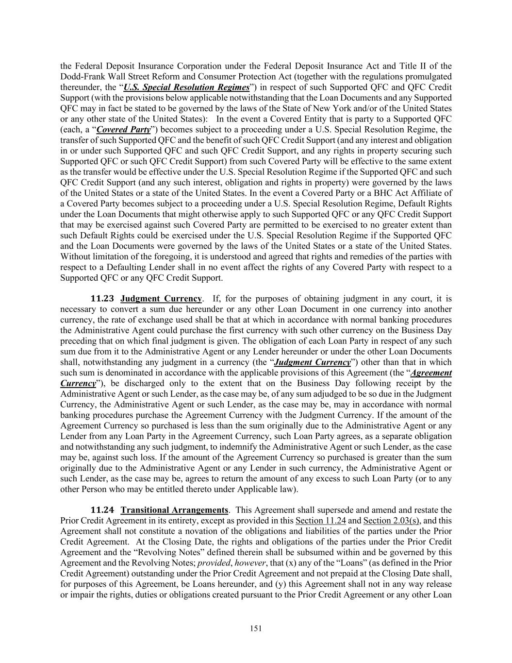 151 the Federal Deposit Insurance Corporation under the Federal Deposit Insurance Act and Title II of the Dodd-Frank Wall Street Reform and Consumer Protection Act (together with the regulations promulgated thereunder, the “U.S. Special Resolution Regimes”) in respect of such Supported QFC and QFC Credit Support (with the provisions below applicable notwithstanding that the Loan Documents and any Supported QFC may in fact be stated to be governed by the laws of the State of New York and/or of the United States or any other state of the United States): In the event a Covered Entity that is party to a Supported QFC (each, a “Covered Party”) becomes subject to a proceeding under a U.S. Special Resolution Regime, the transfer of such Supported QFC and the benefit of such QFC Credit Support (and any interest and obligation in or under such Supported QFC and such QFC Credit Support, and any rights in property securing such Supported QFC or such QFC Credit Support) from such Covered Party will be effective to the same extent as the transfer would be effective under the U.S. Special Resolution Regime if the Supported QFC and such QFC Credit Support (and any such interest, obligation and rights in property) were governed by the laws of the United States or a state of the United States. In the event a Covered Party or a BHC Act Affiliate of a Covered Party becomes subject to a proceeding under a U.S. Special Resolution Regime, Default Rights under the Loan Documents that might otherwise apply to such Supported QFC or any QFC Credit Support that may be exercised against such Covered Party are permitted to be exercised to no greater extent than such Default Rights could be exercised under the U.S. Special Resolution Regime if the Supported QFC and the Loan Documents were governed by the laws of the United States or a state of the United States. Without limitation of the foregoing, it is understood and agreed that rights and remedies of the parties with respect to a Defaulting Lender shall in no event affect the rights of any Covered Party with respect to a Supported QFC or any QFC Credit Support. 11.23 Judgment Currency. If, for the purposes of obtaining judgment in any court, it is necessary to convert a sum due hereunder or any other Loan Document in one currency into another currency, the rate of exchange used shall be that at which in accordance with normal banking procedures the Administrative Agent could purchase the first currency with such other currency on the Business Day preceding that on which final judgment is given. The obligation of each Loan Party in respect of any such sum due from it to the Administrative Agent or any Lender hereunder or under the other Loan Documents shall, notwithstanding any judgment in a currency (the “Judgment Currency”) other than that in which such sum is denominated in accordance with the applicable provisions of this Agreement (the “Agreement Currency”), be discharged only to the extent that on the Business Day following receipt by the Administrative Agent or such Lender, as the case may be, of any sum adjudged to be so due in the Judgment Currency, the Administrative Agent or such Lender, as the case may be, may in accordance with normal banking procedures purchase the Agreement Currency with the Judgment Currency. If the amount of the Agreement Currency so purchased is less than the sum originally due to the Administrative Agent or any Lender from any Loan Party in the Agreement Currency, such Loan Party agrees, as a separate obligation and notwithstanding any such judgment, to indemnify the Administrative Agent or such Lender, as the case may be, against such loss. If the amount of the Agreement Currency so purchased is greater than the sum originally due to the Administrative Agent or any Lender in such currency, the Administrative Agent or such Lender, as the case may be, agrees to return the amount of any excess to such Loan Party (or to any other Person who may be entitled thereto under Applicable law). 11.24 Transitional Arrangements. This Agreement shall supersede and amend and restate the Prior Credit Agreement in its entirety, except as provided in this Section 11.24 and Section 2.03(s), and this Agreement shall not constitute a novation of the obligations and liabilities of the parties under the Prior Credit Agreement. At the Closing Date, the rights and obligations of the parties under the Prior Credit Agreement and the “Revolving Notes” defined therein shall be subsumed within and be governed by this Agreement and the Revolving Notes; provided, however, that (x) any of the “Loans” (as defined in the Prior Credit Agreement) outstanding under the Prior Credit Agreement and not prepaid at the Closing Date shall, for purposes of this Agreement, be Loans hereunder, and (y) this Agreement shall not in any way release or impair the rights, duties or obligations created pursuant to the Prior Credit Agreement or any other Loan