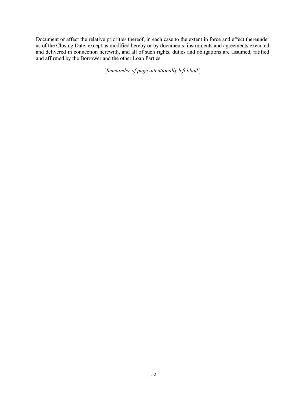 152 Document or affect the relative priorities thereof, in each case to the extent in force and effect thereunder as of the Closing Date, except as modified hereby or by documents, instruments and agreements executed and delivered in connection herewith, and all of such rights, duties and obligations are assumed, ratified and affirmed by the Borrower and the other Loan Parties. [Remainder of page intentionally left blank]