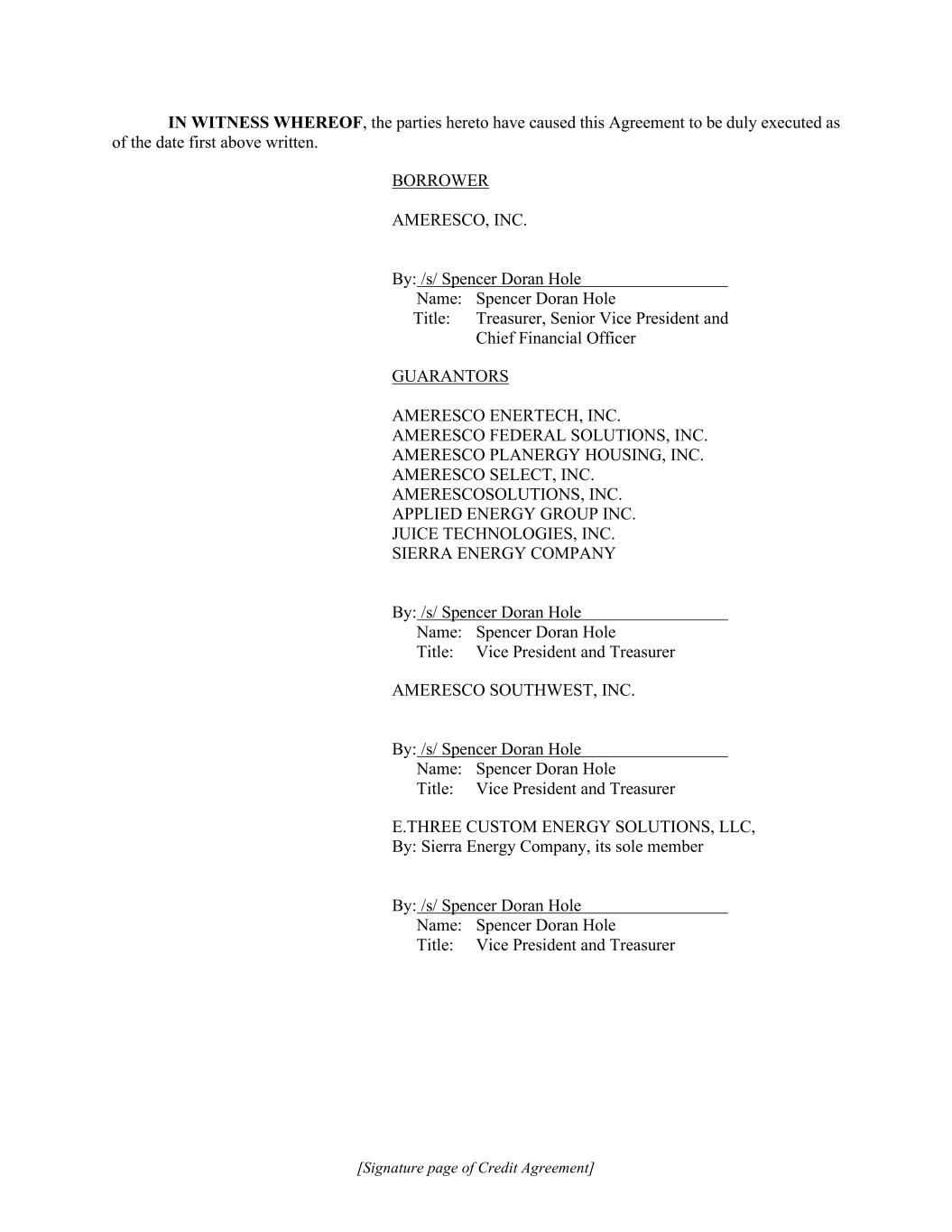 [Signature page of Credit Agreement] IN WITNESS WHEREOF, the parties hereto have caused this Agreement to be duly executed as of the date first above written. BORROWER AMERESCO, INC. By: /s/ Spencer Doran Hole Name: Spencer Doran Hole Title: Treasurer, Senior Vice President and Chief Financial Officer GUARANTORS AMERESCO ENERTECH, INC. AMERESCO FEDERAL SOLUTIONS, INC. AMERESCO PLANERGY HOUSING, INC. AMERESCO SELECT, INC. AMERESCOSOLUTIONS, INC. APPLIED ENERGY GROUP INC. JUICE TECHNOLOGIES, INC. SIERRA ENERGY COMPANY By: /s/ Spencer Doran Hole Name: Spencer Doran Hole Title: Vice President and Treasurer AMERESCO SOUTHWEST, INC. By: /s/ Spencer Doran Hole Name: Spencer Doran Hole Title: Vice President and Treasurer E.THREE CUSTOM ENERGY SOLUTIONS, LLC, By: Sierra Energy Company, its sole member By: /s/ Spencer Doran Hole Name: Spencer Doran Hole Title: Vice President and Treasurer