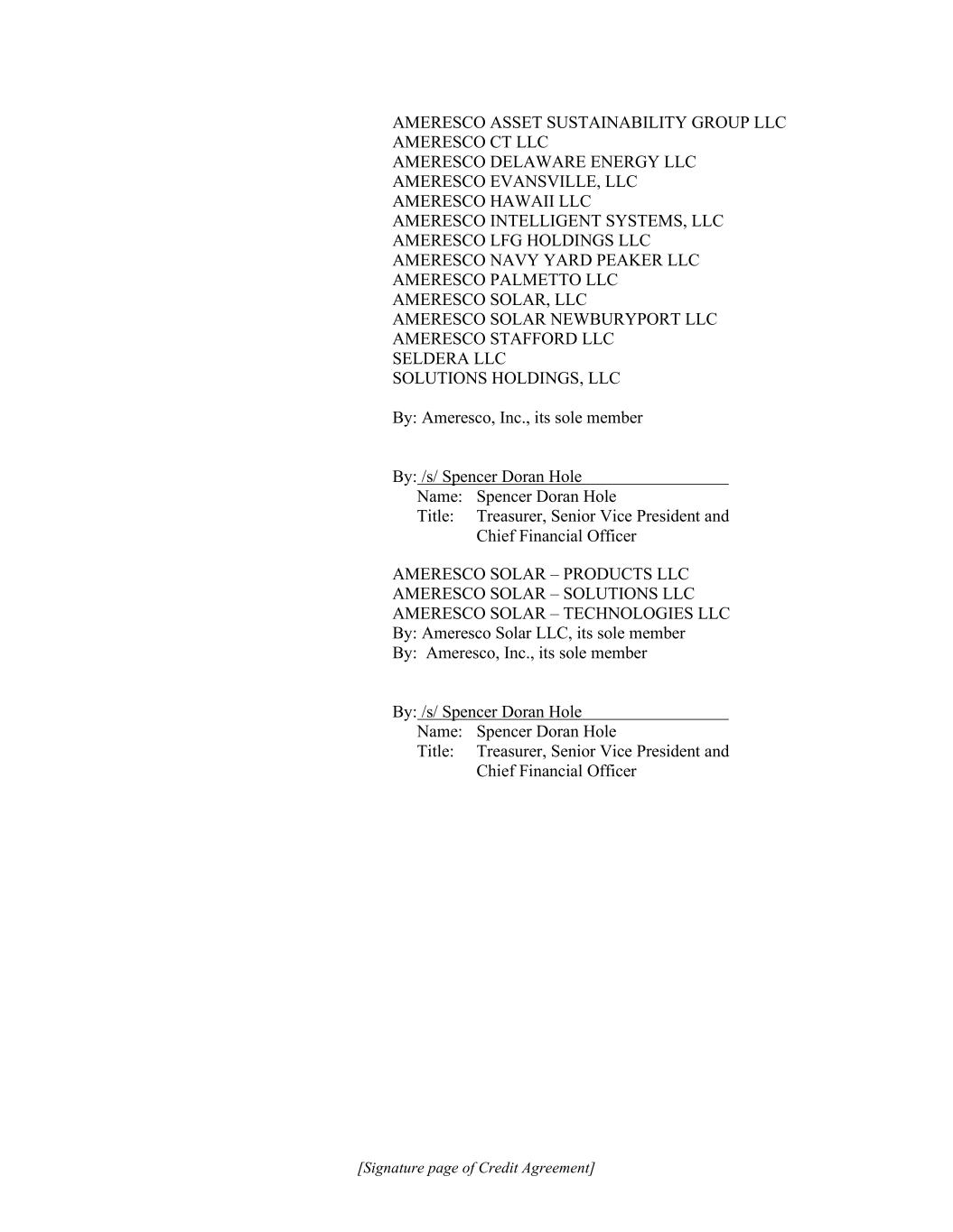 [Signature page of Credit Agreement] AMERESCO ASSET SUSTAINABILITY GROUP LLC AMERESCO CT LLC AMERESCO DELAWARE ENERGY LLC AMERESCO EVANSVILLE, LLC AMERESCO HAWAII LLC AMERESCO INTELLIGENT SYSTEMS, LLC AMERESCO LFG HOLDINGS LLC AMERESCO NAVY YARD PEAKER LLC AMERESCO PALMETTO LLC AMERESCO SOLAR, LLC AMERESCO SOLAR NEWBURYPORT LLC AMERESCO STAFFORD LLC SELDERA LLC SOLUTIONS HOLDINGS, LLC By: Ameresco, Inc., its sole member By: /s/ Spencer Doran Hole Name: Spencer Doran Hole Title: Treasurer, Senior Vice President and Chief Financial Officer AMERESCO SOLAR – PRODUCTS LLC AMERESCO SOLAR – SOLUTIONS LLC AMERESCO SOLAR – TECHNOLOGIES LLC By: Ameresco Solar LLC, its sole member By: Ameresco, Inc., its sole member By: /s/ Spencer Doran Hole Name: Spencer Doran Hole Title: Treasurer, Senior Vice President and Chief Financial Officer