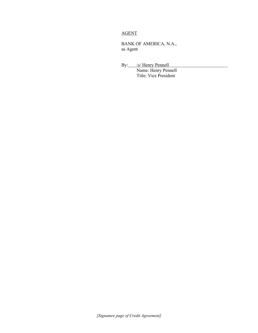 [Signature page of Credit Agreement] AGENT BANK OF AMERICA, N.A., as Agent By: /s/ Henry Pennell Name: Henry Pennell Title: Vice President