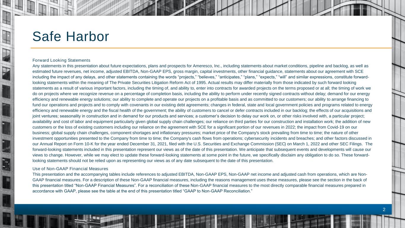 2 Safe Harbor Forward Looking Statements Any statements in this presentation about future expectations, plans and prospects for Ameresco, Inc., including statements about market conditions, pipeline and backlog, as well as estimated future revenues, net income, adjusted EBITDA, Non-GAAP EPS, gross margin, capital investments, other financial guidance, statements about our agreement with SCE including the impact of any delays, and other statements containing the words “projects,” “believes,” “anticipates,” “plans,” “expects,” “will” and similar expressions, constitute forward- looking statements within the meaning of The Private Securities Litigation Reform Act of 1995. Actual results may differ materially from those indicated by such forward looking statements as a result of various important factors, including the timing of, and ability to, enter into contracts for awarded projects on the terms proposed or at all; the timing of work we do on projects where we recognize revenue on a percentage of completion basis, including the ability to perform under recently signed contracts without delay; demand for our energy efficiency and renewable energy solutions; our ability to complete and operate our projects on a profitable basis and as committed to our customers; our ability to arrange financing to fund our operations and projects and to comply with covenants in our existing debt agreements; changes in federal, state and local government policies and programs related to energy efficiency and renewable energy and the fiscal health of the government; the ability of customers to cancel or defer contracts included in our backlog; the effects of our acquisitions and joint ventures; seasonality in construction and in demand for our products and services; a customer’s decision to delay our work on, or other risks involved with, a particular project; availability and cost of labor and equipment particularly given global supply chain challenges; our reliance on third parties for our construction and installation work; the addition of new customers or the loss of existing customers including our reliance on the agreement with SCE for a significant portion of our revenues in 2022; the impact from Covid-19 on our business; global supply chain challenges, component shortages and inflationary pressures; market price of the Company's stock prevailing from time to time; the nature of other investment opportunities presented to the Company from time to time; the Company's cash flows from operations; cybersecurity incidents and breaches; and other factors discussed in our Annual Report on Form 10-K for the year ended December 31, 2021, filed with the U.S. Securities and Exchange Commission (SEC) on March 1, 2022 and other SEC Filings. The forward-looking statements included in this presentation represent our views as of the date of this presentation. We anticipate that subsequent events and developments will cause our views to change. However, while we may elect to update these forward-looking statements at some point in the future, we specifically disclaim any obligation to do so. These forward- looking statements should not be relied upon as representing our views as of any date subsequent to the date of this presentation. Use of Non-GAAP Financial Measures This presentation and the accompanying tables include references to adjusted EBITDA, Non-GAAP EPS, Non-GAAP net income and adjusted cash from operations, which are Non- GAAP financial measures. For a description of these Non-GAAP financial measures, including the reasons management uses these measures, please see the section in the back of this presentation titled “Non-GAAP Financial Measures”. For a reconciliation of these Non-GAAP financial measures to the most directly comparable financial measures prepared in accordance with GAAP, please see the table at the end of this presentation titled “GAAP to Non-GAAP Reconciliation.”