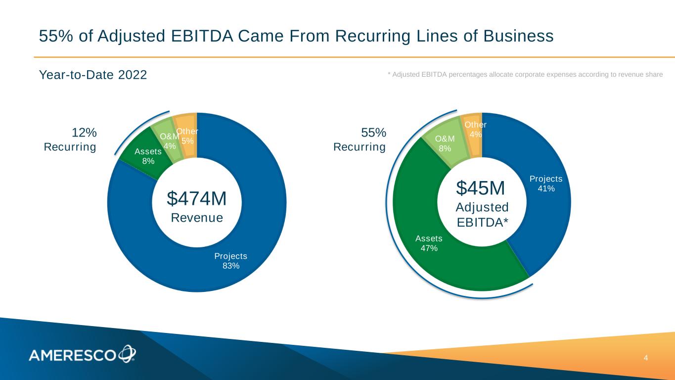 Projects 41% Assets 47% O&M 8% Other 4% $45M Adjusted EBITDA* 55% of Adjusted EBITDA Came From Recurring Lines of Business 4 Projects 83% Assets 8% O&M 4% Other 5% 12% Recurring $474M Revenue * Adjusted EBITDA percentages allocate corporate expenses according to revenue shareYear-to-Date 2022 55% Recurring