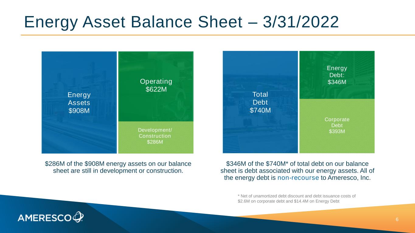 Energy Asset Portfolio – 3/31/2022 5 353 MWe of Energy Assets. Non-RNG Biogas is 94 MW, RNG is 38 MW, Solar is 212 MW, Other is 8 MW 464 MWe in Development & Construction. Renewable Gas is 134 MWe, Solar & Battery is 321 MW, Energy as a Service is 9 MW* Operating Energy Assets 353 MWe Other: 2% Solar: 60% Biogas: RNG 11% Biogas: Non-RNG 27% Energy Assets in Development & Construction 464 MWe EAAS: 2% Solar: 69% Biogas: RNG 29% Numbers may not sum due to rounding *$60M of our anticipated Assets in Development spending is for Energy as a Service assets, $34M of which does not include generation assets that can be measured in MWe