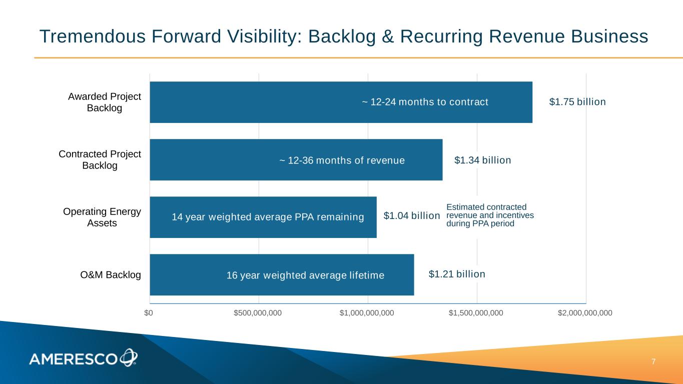 Energy Asset Balance Sheet – 3/31/2022 6 * Net of unamortized debt discount and debt issuance costs of $2.6M on corporate debt and $14.4M on Energy Debt $286M of the $908M energy assets on our balance sheet are still in development or construction. $346M of the $740M* of total debt on our balance sheet is debt associated with our energy assets. All of the energy debt is non-recourse to Ameresco, Inc. Total Debt $740M Corporate Debt $393M Energy Debt: $346M Energy Assets $908M Development/ Construction $286M Operating $622M