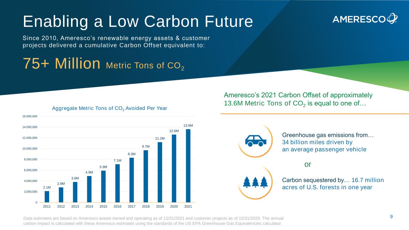Enabling a Low Carbon Future Since 2010, Ameresco’s renewable energy assets & customer projects delivered a cumulative Carbon Offset equivalent to: Greenhouse gas emissions from… 34 billion miles driven by an average passenger vehicle Carbon sequestered by… 16.7 million acres of U.S. forests in one year or Data estimates are based on Ameresco assets owned and operating as of 12/31/2021 and customer projects as of 12/31/2020. The annual carbon impact is calculated with these Ameresco estimates using the standards of the US EPA Greenhouse Gas Equivalencies calculator. 75+ Million Metric Tons of CO2 Ameresco’s 2021 Carbon Offset of approximately 13.6M Metric Tons of CO2 is equal to one of… 2.1M 2.8M 3.8M 4.9M 5.9M 7.1M 8.3M 9.7M 11.2M 12.6M 13.6M 0 2,000,000 4,000,000 6,000,000 8,000,000 10,000,000 12,000,000 14,000,000 16,000,000 2011 2012 2013 2014 2015 2016 2017 2018 2019 2020 2021 Aggregate Metric Tons of CO2 Avoided Per Year 9