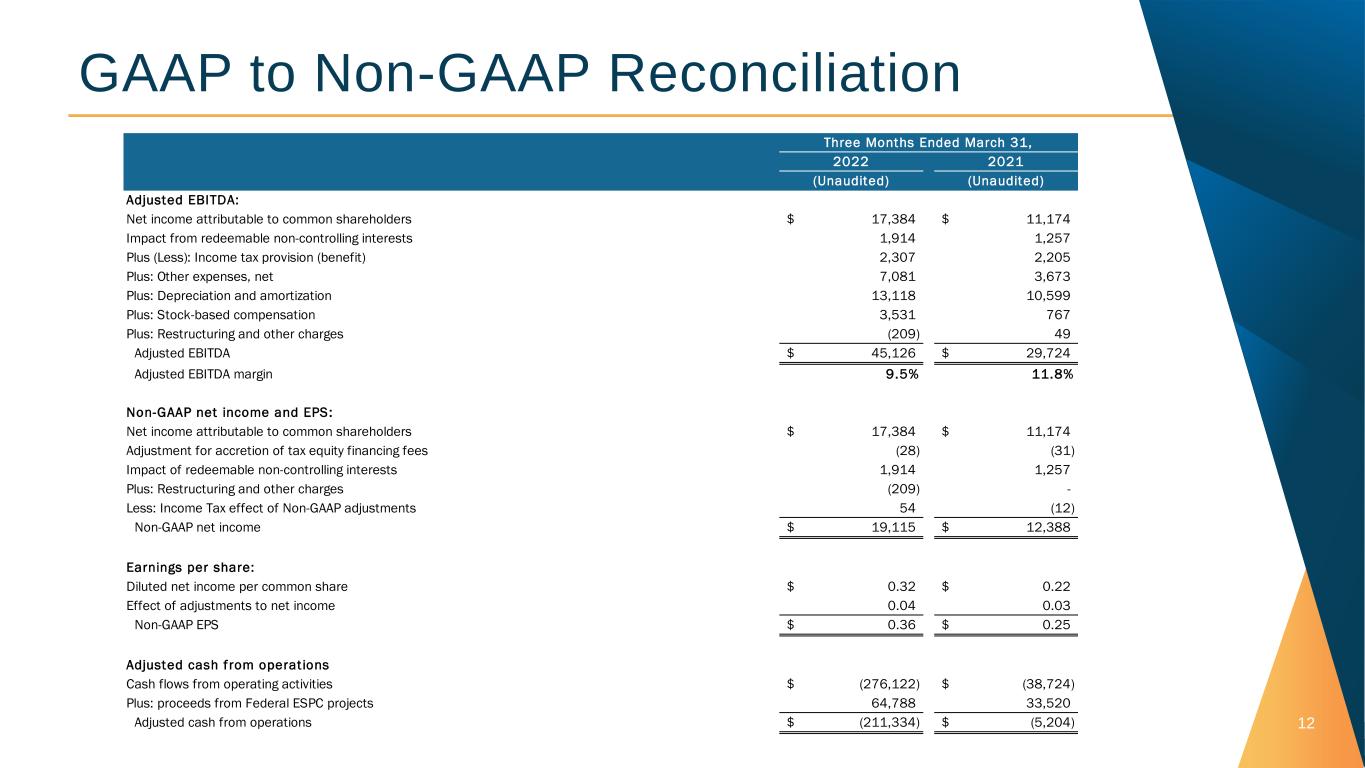 11 Non-GAAP Financial Measures We use the Non-GAAP financial measures defined and discussed below to provide investors and others with useful supplemental information to our financial results prepared in accordance with GAAP. These Non-GAAP financial measures should not be considered as an alternative to any measure of financial performance calculated and presented in accordance with GAAP. For a reconciliation of these Non-GAAP measures to the most directly comparable financial measures prepared in accordance with GAAP, please see the table at the end of this presentation titled “GAAP to Non-GAAP Reconciliation.” We understand that, although measures similar to these Non- GAAP financial measures are frequently used by investors and securities analysts in their evaluation of companies, they have limitations as analytical tools, and investors should not consider them in isolation or as a substitute for the most directly comparable GAAP financial measures or an analysis of our results of operations as reported under GAAP. To properly and prudently evaluate our business, we encourage investors to review our GAAP financial statements and not to rely on any single financial measure to evaluate our business. Adjusted EBITDA and Adjusted EBITDA Margin We define adjusted EBITDA as net income attributable to common shareholders, including impact from redeemable non-controlling interests, before income tax (benefit) provision, other expenses net, depreciation, amortization of intangible assets, accretion of asset retirement obligations, contingent consideration expense, stock-based compensation expense, energy asset impairment, restructuring and other charges, gain or loss on sale of equity investment, and gain or loss upon deconsolidation of a variable interest entity. We believe adjusted EBITDA is useful to investors in evaluating our operating performance for the following reasons: adjusted EBITDA and similar Non-GAAP measures are widely used by investors to measure a company's operating performance without regard to items that can vary substantially from company to company depending upon financing and accounting methods, book values of assets, capital structures and the methods by which assets were acquired; securities analysts often use adjusted EBITDA and similar Non-GAAP measures as supplemental measures to evaluate the overall operating performance of companies; and by comparing our adjusted EBITDA in different historical periods, investors can evaluate our operating results without the additional variations of depreciation and amortization expense, accretion of asset retirement obligations, contingent consideration expense, stock-based compensation expense, impact from redeemable non-controlling interests, restructuring and asset impairment charges. We define adjusted EBITDA margin as adjusted EBITDA stated as a percentage of revenue. Our management uses adjusted EBITDA and adjusted EBITDA margin as measures of operating performance, because they do not include the impact of items that we do not consider indicative of our core operating performance; for planning purposes, including the preparation of our annual operating budget; to allocate resources to enhance the financial performance of the business; to evaluate the effectiveness of our business strategies; and in communications with the board of directors and investors concerning our financial performance. Non-GAAP Net Income and EPS We define Non-GAAP net income and earnings per share (EPS) to exclude certain discrete items that management does not consider representative of our ongoing operations, including energy asset impairment, restructuring and other charges, impact from redeemable non-controlling interest, gain or loss on sale of equity investment, and gain or loss upon deconsolidation of a variable interest entity. We consider Non-GAAP net income and Non- GAAP EPS to be important indicators of our operational strength and performance of our business because they eliminate the effects of events that are not part of the Company's core operations. Adjusted Cash from Operations We define adjusted cash from operations as cash flows from operating activities plus proceeds from Federal ESPC projects. Cash received in payment of Federal ESPC projects is treated as a financing cash flow under GAAP due to the unusual financing structure for these projects. These cash flows, however, correspond to the revenue generated by these projects. Thus we believe that adjusting operating cash flow to include the cash generated by our Federal ESPC projects provides investors with a useful measure for evaluating the cash generating ability of our core operating business. Our management uses adjusted cash from operations as a measure of liquidity because it captures all sources of cash associated with our revenue generated by operations.