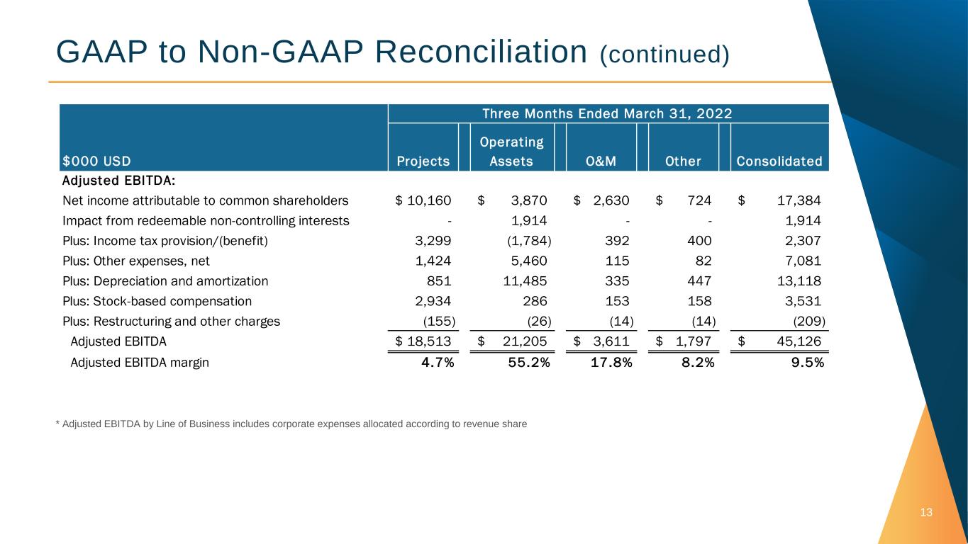 GAAP to Non-GAAP Reconciliation (continued) 13 * Adjusted EBITDA by Line of Business includes corporate expenses allocated according to revenue share $000 USD Projects Operating Assets O&M Other Consolidated Adjusted EBITDA: Net income attributable to common shareholders 10,160$ 3,870$ 2,630$ 724$ 17,384$ Impact from redeemable non-controlling interests - 1,914 - - 1,914 Plus: Income tax provision/(benefit) 3,299 (1,784) 392 400 2,307 Plus: Other expenses, net 1,424 5,460 115 82 7,081 Plus: Depreciation and amortization 851 11,485 335 447 13,118 Plus: Stock-based compensation 2,934 286 153 158 3,531 Plus: Restructuring and other charges (155) (26) (14) (14) (209) Adjusted EBITDA 18,513$ 21,205$ 3,611$ 1,797$ 45,126$ Adjusted EBITDA margin 4.7% 55.2% 17.8% 8.2% 9.5% Three Months Ended March 31, 2022