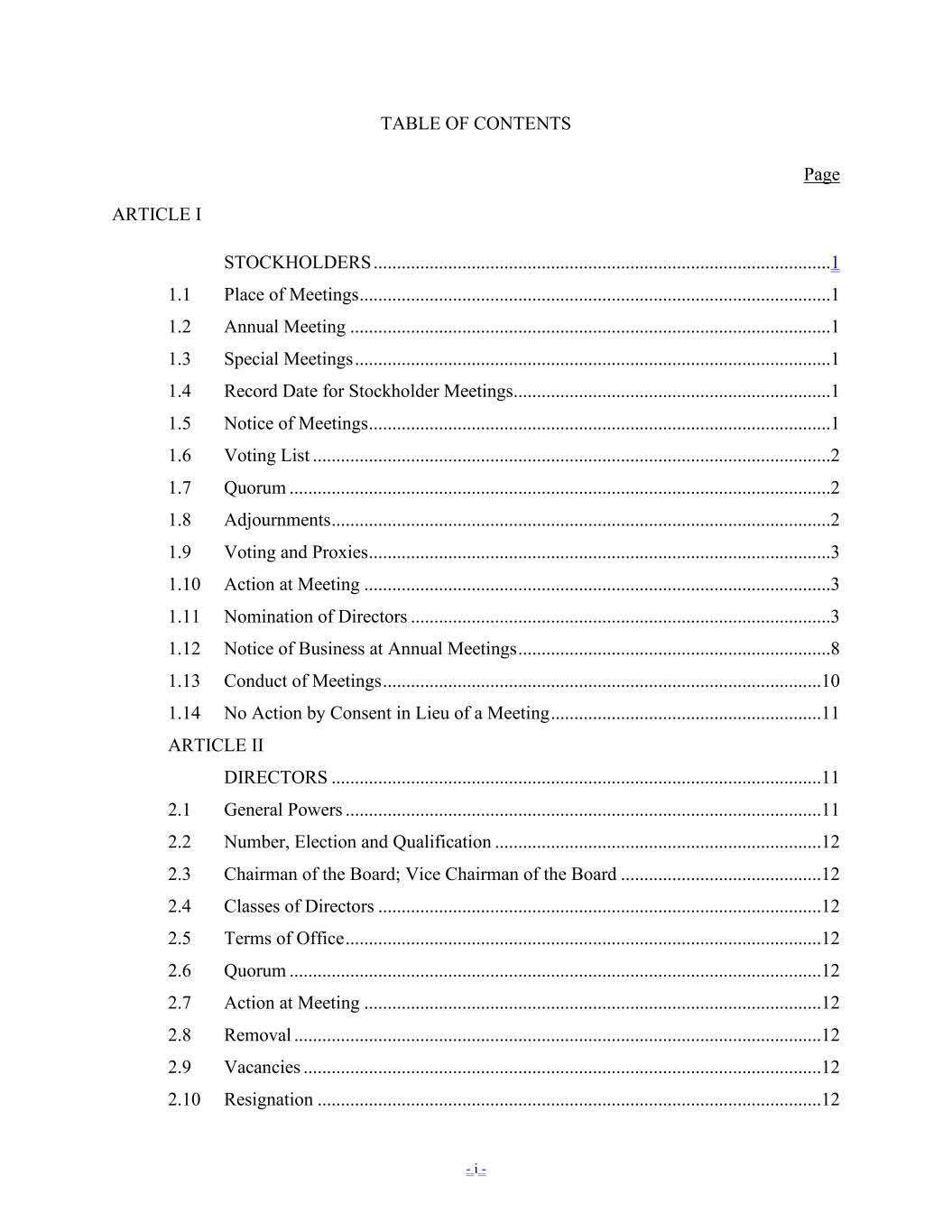 - i - TABLE OF CONTENTS Page ARTICLE I STOCKHOLDERS ..................................................................................................1 1.1 Place of Meetings .....................................................................................................1 1.2 Annual Meeting .......................................................................................................1 1.3 Special Meetings ......................................................................................................1 1.4 Record Date for Stockholder Meetings....................................................................1 1.5 Notice of Meetings ...................................................................................................1 1.6 Voting List ...............................................................................................................2 1.7 Quorum ....................................................................................................................2 1.8 Adjournments ...........................................................................................................2 1.9 Voting and Proxies ...................................................................................................3 1.10 Action at Meeting ....................................................................................................3 1.11 Nomination of Directors ..........................................................................................3 1.12 Notice of Business at Annual Meetings ...................................................................8 1.13 Conduct of Meetings ..............................................................................................10 1.14 No Action by Consent in Lieu of a Meeting ..........................................................11 ARTICLE II DIRECTORS .........................................................................................................11 2.1 General Powers ......................................................................................................11 2.2 Number, Election and Qualification ......................................................................12 2.3 Chairman of the Board; Vice Chairman of the Board ...........................................12 2.4 Classes of Directors ...............................................................................................12 2.5 Terms of Office ......................................................................................................12 2.6 Quorum ..................................................................................................................12 2.7 Action at Meeting ..................................................................................................12 2.8 Removal .................................................................................................................12 2.9 Vacancies ...............................................................................................................12 2.10 Resignation ............................................................................................................12