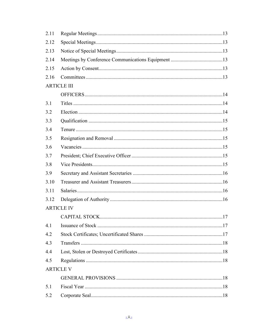 - ii - 2.11 Regular Meetings ...................................................................................................13 2.12 Special Meetings ....................................................................................................13 2.13 Notice of Special Meetings ....................................................................................13 2.14 Meetings by Conference Communications Equipment .........................................13 2.15 Action by Consent..................................................................................................13 2.16 Committees ............................................................................................................13 ARTICLE III OFFICERS .............................................................................................................14 3.1 Titles ......................................................................................................................14 3.2 Election ..................................................................................................................14 3.3 Qualification ..........................................................................................................15 3.4 Tenure ....................................................................................................................15 3.5 Resignation and Removal ......................................................................................15 3.6 Vacancies ...............................................................................................................15 3.7 President; Chief Executive Officer ........................................................................15 3.8 Vice Presidents.......................................................................................................15 3.9 Secretary and Assistant Secretaries .......................................................................16 3.10 Treasurer and Assistant Treasurers ........................................................................16 3.11 Salaries ...................................................................................................................16 3.12 Delegation of Authority .........................................................................................16 ARTICLE IV CAPITAL STOCK.................................................................................................17 4.1 Issuance of Stock ...................................................................................................17 4.2 Stock Certificates; Uncertificated Shares ..............................................................17 4.3 Transfers ................................................................................................................18 4.4 Lost, Stolen or Destroyed Certificates ...................................................................18 4.5 Regulations ............................................................................................................18 ARTICLE V GENERAL PROVISIONS ....................................................................................18 5.1 Fiscal Year .............................................................................................................18 5.2 Corporate Seal ........................................................................................................18
