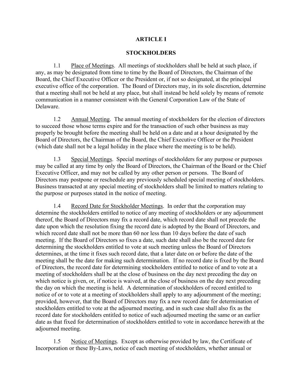 ARTICLE I STOCKHOLDERS 1.1 Place of Meetings. All meetings of stockholders shall be held at such place, if any, as may be designated from time to time by the Board of Directors, the Chairman of the Board, the Chief Executive Officer or the President or, if not so designated, at the principal executive office of the corporation. The Board of Directors may, in its sole discretion, determine that a meeting shall not be held at any place, but shall instead be held solely by means of remote communication in a manner consistent with the General Corporation Law of the State of Delaware. 1.2 Annual Meeting. The annual meeting of stockholders for the election of directors to succeed those whose terms expire and for the transaction of such other business as may properly be brought before the meeting shall be held on a date and at a hour designated by the Board of Directors, the Chairman of the Board, the Chief Executive Officer or the President (which date shall not be a legal holiday in the place where the meeting is to be held). 1.3 Special Meetings. Special meetings of stockholders for any purpose or purposes may be called at any time by only the Board of Directors, the Chairman of the Board or the Chief Executive Officer, and may not be called by any other person or persons. The Board of Directors may postpone or reschedule any previously scheduled special meeting of stockholders. Business transacted at any special meeting of stockholders shall be limited to matters relating to the purpose or purposes stated in the notice of meeting. 1.4 Record Date for Stockholder Meetings. In order that the corporation may determine the stockholders entitled to notice of any meeting of stockholders or any adjournment thereof, the Board of Directors may fix a record date, which record date shall not precede the date upon which the resolution fixing the record date is adopted by the Board of Directors, and which record date shall not be more than 60 nor less than 10 days before the date of such meeting. If the Board of Directors so fixes a date, such date shall also be the record date for determining the stockholders entitled to vote at such meeting unless the Board of Directors determines, at the time it fixes such record date, that a later date on or before the date of the meeting shall be the date for making such determination. If no record date is fixed by the Board of Directors, the record date for determining stockholders entitled to notice of and to vote at a meeting of stockholders shall be at the close of business on the day next preceding the day on which notice is given, or, if notice is waived, at the close of business on the day next preceding the day on which the meeting is held. A determination of stockholders of record entitled to notice of or to vote at a meeting of stockholders shall apply to any adjournment of the meeting; provided, however, that the Board of Directors may fix a new record date for determination of stockholders entitled to vote at the adjourned meeting, and in such case shall also fix as the record date for stockholders entitled to notice of such adjourned meeting the same or an earlier date as that fixed for determination of stockholders entitled to vote in accordance herewith at the adjourned meeting. 1.5 Notice of Meetings. Except as otherwise provided by law, the Certificate of Incorporation or these By-Laws, notice of each meeting of stockholders, whether annual or