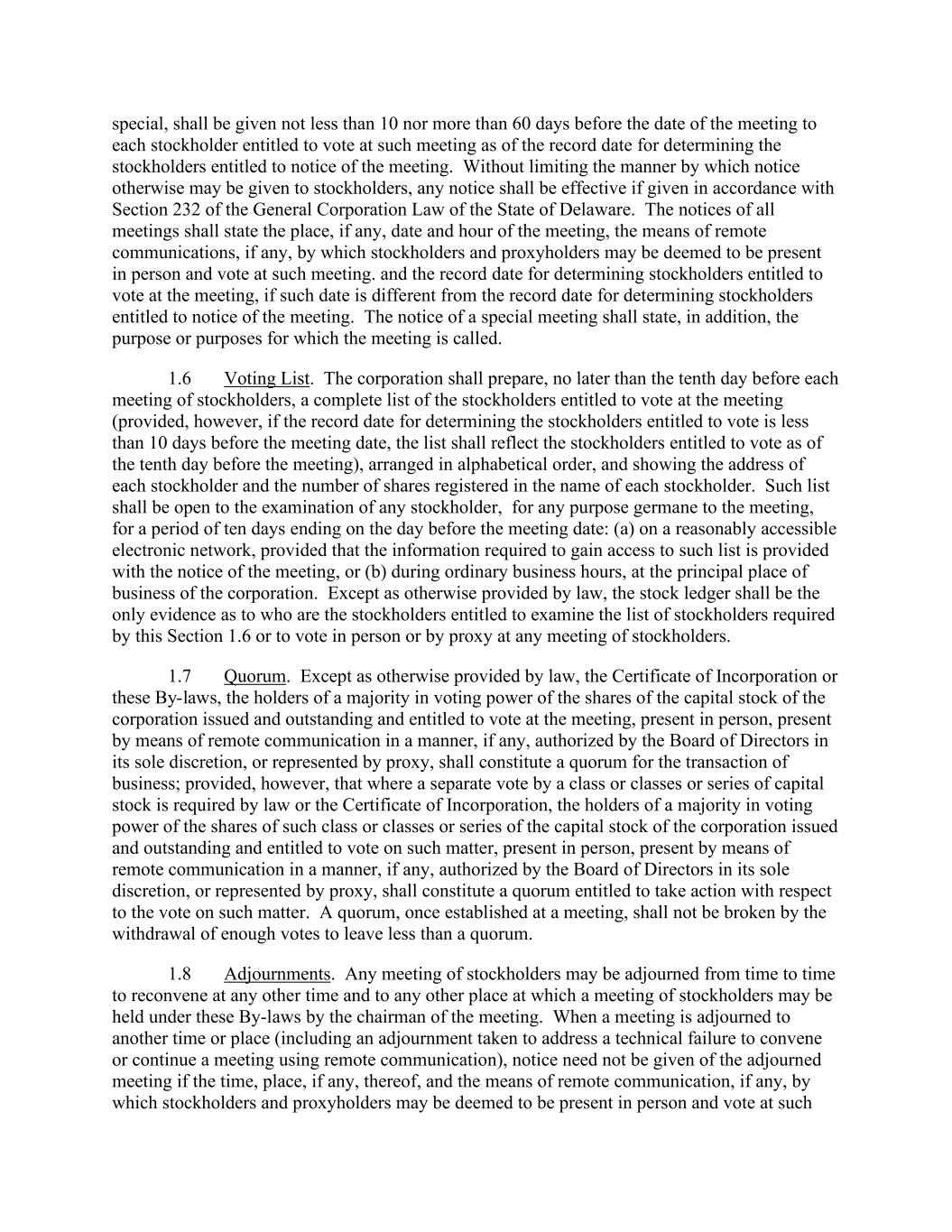special, shall be given not less than 10 nor more than 60 days before the date of the meeting to each stockholder entitled to vote at such meeting as of the record date for determining the stockholders entitled to notice of the meeting. Without limiting the manner by which notice otherwise may be given to stockholders, any notice shall be effective if given in accordance with Section 232 of the General Corporation Law of the State of Delaware. The notices of all meetings shall state the place, if any, date and hour of the meeting, the means of remote communications, if any, by which stockholders and proxyholders may be deemed to be present in person and vote at such meeting. and the record date for determining stockholders entitled to vote at the meeting, if such date is different from the record date for determining stockholders entitled to notice of the meeting. The notice of a special meeting shall state, in addition, the purpose or purposes for which the meeting is called. 1.6 Voting List. The corporation shall prepare, no later than the tenth day before each meeting of stockholders, a complete list of the stockholders entitled to vote at the meeting (provided, however, if the record date for determining the stockholders entitled to vote is less than 10 days before the meeting date, the list shall reflect the stockholders entitled to vote as of the tenth day before the meeting), arranged in alphabetical order, and showing the address of each stockholder and the number of shares registered in the name of each stockholder. Such list shall be open to the examination of any stockholder, for any purpose germane to the meeting, for a period of ten days ending on the day before the meeting date: (a) on a reasonably accessible electronic network, provided that the information required to gain access to such list is provided with the notice of the meeting, or (b) during ordinary business hours, at the principal place of business of the corporation. Except as otherwise provided by law, the stock ledger shall be the only evidence as to who are the stockholders entitled to examine the list of stockholders required by this Section 1.6 or to vote in person or by proxy at any meeting of stockholders. 1.7 Quorum. Except as otherwise provided by law, the Certificate of Incorporation or these By-laws, the holders of a majority in voting power of the shares of the capital stock of the corporation issued and outstanding and entitled to vote at the meeting, present in person, present by means of remote communication in a manner, if any, authorized by the Board of Directors in its sole discretion, or represented by proxy, shall constitute a quorum for the transaction of business; provided, however, that where a separate vote by a class or classes or series of capital stock is required by law or the Certificate of Incorporation, the holders of a majority in voting power of the shares of such class or classes or series of the capital stock of the corporation issued and outstanding and entitled to vote on such matter, present in person, present by means of remote communication in a manner, if any, authorized by the Board of Directors in its sole discretion, or represented by proxy, shall constitute a quorum entitled to take action with respect to the vote on such matter. A quorum, once established at a meeting, shall not be broken by the withdrawal of enough votes to leave less than a quorum. 1.8 Adjournments. Any meeting of stockholders may be adjourned from time to time to reconvene at any other time and to any other place at which a meeting of stockholders may be held under these By-laws by the chairman of the meeting. When a meeting is adjourned to another time or place (including an adjournment taken to address a technical failure to convene or continue a meeting using remote communication), notice need not be given of the adjourned meeting if the time, place, if any, thereof, and the means of remote communication, if any, by which stockholders and proxyholders may be deemed to be present in person and vote at such