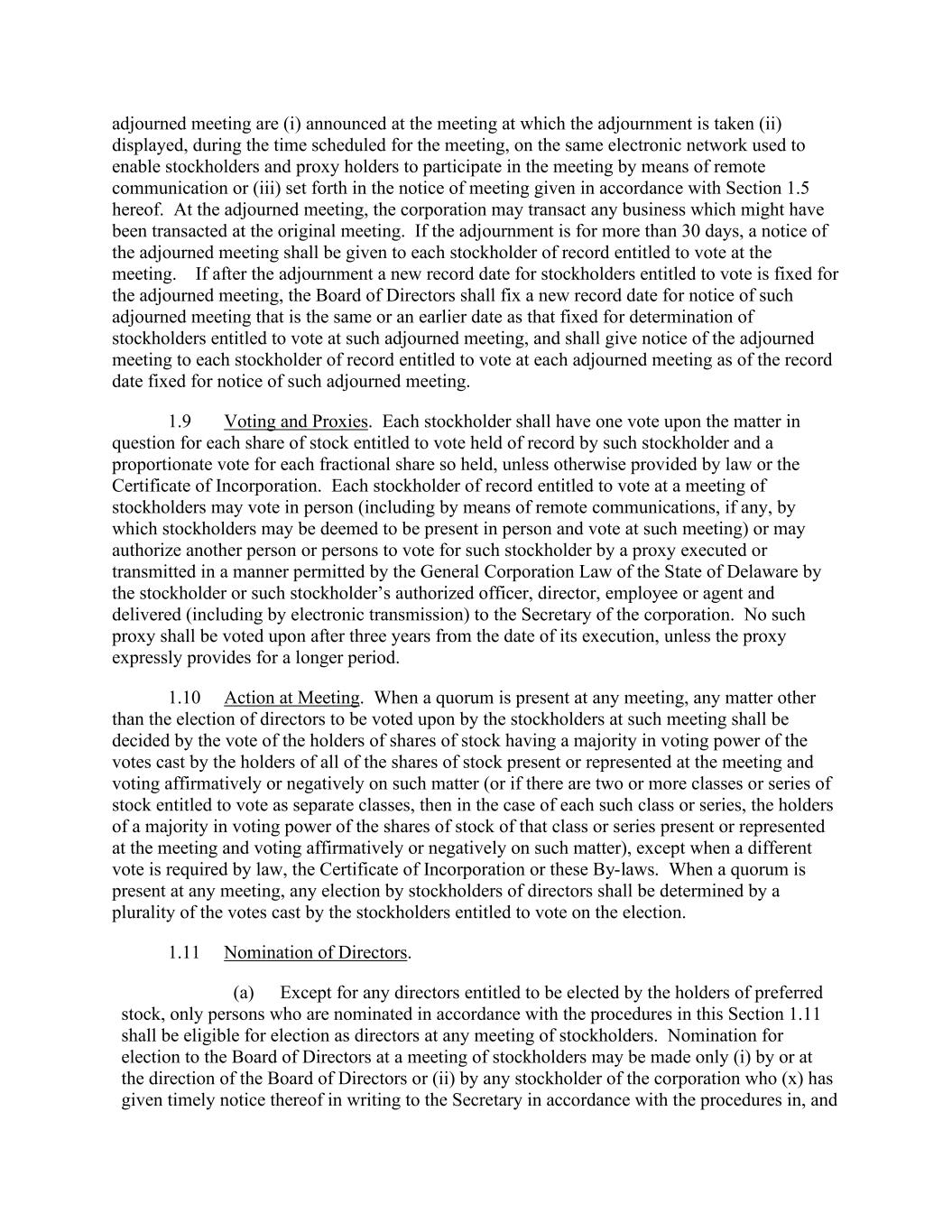 adjourned meeting are (i) announced at the meeting at which the adjournment is taken (ii) displayed, during the time scheduled for the meeting, on the same electronic network used to enable stockholders and proxy holders to participate in the meeting by means of remote communication or (iii) set forth in the notice of meeting given in accordance with Section 1.5 hereof. At the adjourned meeting, the corporation may transact any business which might have been transacted at the original meeting. If the adjournment is for more than 30 days, a notice of the adjourned meeting shall be given to each stockholder of record entitled to vote at the meeting. If after the adjournment a new record date for stockholders entitled to vote is fixed for the adjourned meeting, the Board of Directors shall fix a new record date for notice of such adjourned meeting that is the same or an earlier date as that fixed for determination of stockholders entitled to vote at such adjourned meeting, and shall give notice of the adjourned meeting to each stockholder of record entitled to vote at each adjourned meeting as of the record date fixed for notice of such adjourned meeting. 1.9 Voting and Proxies. Each stockholder shall have one vote upon the matter in question for each share of stock entitled to vote held of record by such stockholder and a proportionate vote for each fractional share so held, unless otherwise provided by law or the Certificate of Incorporation. Each stockholder of record entitled to vote at a meeting of stockholders may vote in person (including by means of remote communications, if any, by which stockholders may be deemed to be present in person and vote at such meeting) or may authorize another person or persons to vote for such stockholder by a proxy executed or transmitted in a manner permitted by the General Corporation Law of the State of Delaware by the stockholder or such stockholder’s authorized officer, director, employee or agent and delivered (including by electronic transmission) to the Secretary of the corporation. No such proxy shall be voted upon after three years from the date of its execution, unless the proxy expressly provides for a longer period. 1.10 Action at Meeting. When a quorum is present at any meeting, any matter other than the election of directors to be voted upon by the stockholders at such meeting shall be decided by the vote of the holders of shares of stock having a majority in voting power of the votes cast by the holders of all of the shares of stock present or represented at the meeting and voting affirmatively or negatively on such matter (or if there are two or more classes or series of stock entitled to vote as separate classes, then in the case of each such class or series, the holders of a majority in voting power of the shares of stock of that class or series present or represented at the meeting and voting affirmatively or negatively on such matter), except when a different vote is required by law, the Certificate of Incorporation or these By-laws. When a quorum is present at any meeting, any election by stockholders of directors shall be determined by a plurality of the votes cast by the stockholders entitled to vote on the election. 1.11 Nomination of Directors. (a) Except for any directors entitled to be elected by the holders of preferred stock, only persons who are nominated in accordance with the procedures in this Section 1.11 shall be eligible for election as directors at any meeting of stockholders. Nomination for election to the Board of Directors at a meeting of stockholders may be made only (i) by or at the direction of the Board of Directors or (ii) by any stockholder of the corporation who (x) has given timely notice thereof in writing to the Secretary in accordance with the procedures in, and
