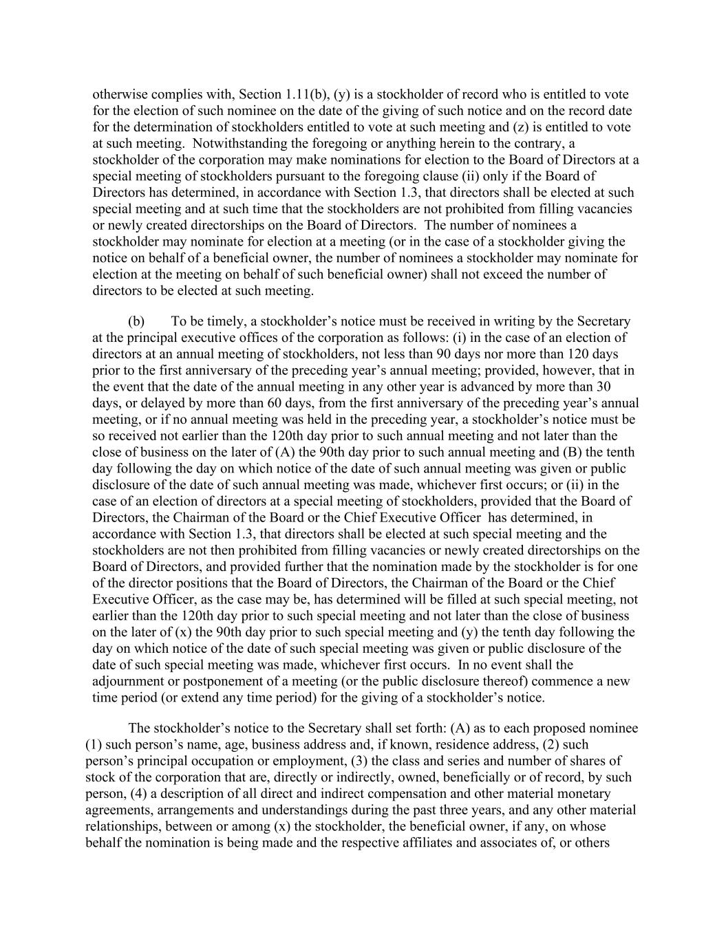 otherwise complies with, Section 1.11(b), (y) is a stockholder of record who is entitled to vote for the election of such nominee on the date of the giving of such notice and on the record date for the determination of stockholders entitled to vote at such meeting and (z) is entitled to vote at such meeting. Notwithstanding the foregoing or anything herein to the contrary, a stockholder of the corporation may make nominations for election to the Board of Directors at a special meeting of stockholders pursuant to the foregoing clause (ii) only if the Board of Directors has determined, in accordance with Section 1.3, that directors shall be elected at such special meeting and at such time that the stockholders are not prohibited from filling vacancies or newly created directorships on the Board of Directors. The number of nominees a stockholder may nominate for election at a meeting (or in the case of a stockholder giving the notice on behalf of a beneficial owner, the number of nominees a stockholder may nominate for election at the meeting on behalf of such beneficial owner) shall not exceed the number of directors to be elected at such meeting. (b) To be timely, a stockholder’s notice must be received in writing by the Secretary at the principal executive offices of the corporation as follows: (i) in the case of an election of directors at an annual meeting of stockholders, not less than 90 days nor more than 120 days prior to the first anniversary of the preceding year’s annual meeting; provided, however, that in the event that the date of the annual meeting in any other year is advanced by more than 30 days, or delayed by more than 60 days, from the first anniversary of the preceding year’s annual meeting, or if no annual meeting was held in the preceding year, a stockholder’s notice must be so received not earlier than the 120th day prior to such annual meeting and not later than the close of business on the later of (A) the 90th day prior to such annual meeting and (B) the tenth day following the day on which notice of the date of such annual meeting was given or public disclosure of the date of such annual meeting was made, whichever first occurs; or (ii) in the case of an election of directors at a special meeting of stockholders, provided that the Board of Directors, the Chairman of the Board or the Chief Executive Officer has determined, in accordance with Section 1.3, that directors shall be elected at such special meeting and the stockholders are not then prohibited from filling vacancies or newly created directorships on the Board of Directors, and provided further that the nomination made by the stockholder is for one of the director positions that the Board of Directors, the Chairman of the Board or the Chief Executive Officer, as the case may be, has determined will be filled at such special meeting, not earlier than the 120th day prior to such special meeting and not later than the close of business on the later of (x) the 90th day prior to such special meeting and (y) the tenth day following the day on which notice of the date of such special meeting was given or public disclosure of the date of such special meeting was made, whichever first occurs. In no event shall the adjournment or postponement of a meeting (or the public disclosure thereof) commence a new time period (or extend any time period) for the giving of a stockholder’s notice. The stockholder’s notice to the Secretary shall set forth: (A) as to each proposed nominee (1) such person’s name, age, business address and, if known, residence address, (2) such person’s principal occupation or employment, (3) the class and series and number of shares of stock of the corporation that are, directly or indirectly, owned, beneficially or of record, by such person, (4) a description of all direct and indirect compensation and other material monetary agreements, arrangements and understandings during the past three years, and any other material relationships, between or among (x) the stockholder, the beneficial owner, if any, on whose behalf the nomination is being made and the respective affiliates and associates of, or others