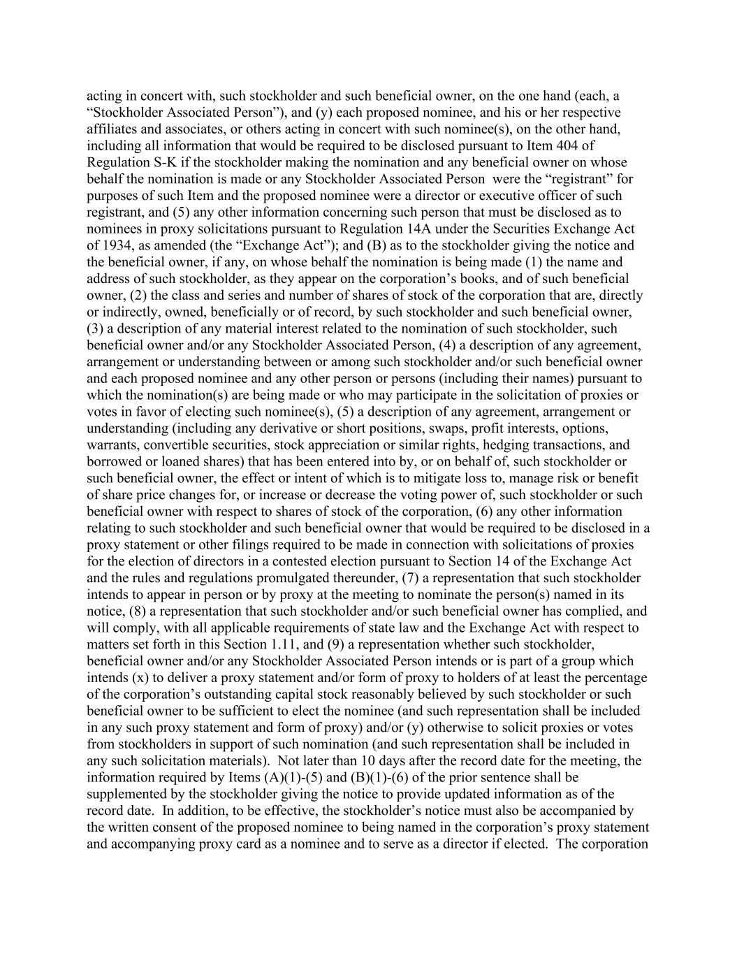 acting in concert with, such stockholder and such beneficial owner, on the one hand (each, a “Stockholder Associated Person”), and (y) each proposed nominee, and his or her respective affiliates and associates, or others acting in concert with such nominee(s), on the other hand, including all information that would be required to be disclosed pursuant to Item 404 of Regulation S-K if the stockholder making the nomination and any beneficial owner on whose behalf the nomination is made or any Stockholder Associated Person were the “registrant” for purposes of such Item and the proposed nominee were a director or executive officer of such registrant, and (5) any other information concerning such person that must be disclosed as to nominees in proxy solicitations pursuant to Regulation 14A under the Securities Exchange Act of 1934, as amended (the “Exchange Act”); and (B) as to the stockholder giving the notice and the beneficial owner, if any, on whose behalf the nomination is being made (1) the name and address of such stockholder, as they appear on the corporation’s books, and of such beneficial owner, (2) the class and series and number of shares of stock of the corporation that are, directly or indirectly, owned, beneficially or of record, by such stockholder and such beneficial owner, (3) a description of any material interest related to the nomination of such stockholder, such beneficial owner and/or any Stockholder Associated Person, (4) a description of any agreement, arrangement or understanding between or among such stockholder and/or such beneficial owner and each proposed nominee and any other person or persons (including their names) pursuant to which the nomination(s) are being made or who may participate in the solicitation of proxies or votes in favor of electing such nominee(s), (5) a description of any agreement, arrangement or understanding (including any derivative or short positions, swaps, profit interests, options, warrants, convertible securities, stock appreciation or similar rights, hedging transactions, and borrowed or loaned shares) that has been entered into by, or on behalf of, such stockholder or such beneficial owner, the effect or intent of which is to mitigate loss to, manage risk or benefit of share price changes for, or increase or decrease the voting power of, such stockholder or such beneficial owner with respect to shares of stock of the corporation, (6) any other information relating to such stockholder and such beneficial owner that would be required to be disclosed in a proxy statement or other filings required to be made in connection with solicitations of proxies for the election of directors in a contested election pursuant to Section 14 of the Exchange Act and the rules and regulations promulgated thereunder, (7) a representation that such stockholder intends to appear in person or by proxy at the meeting to nominate the person(s) named in its notice, (8) a representation that such stockholder and/or such beneficial owner has complied, and will comply, with all applicable requirements of state law and the Exchange Act with respect to matters set forth in this Section 1.11, and (9) a representation whether such stockholder, beneficial owner and/or any Stockholder Associated Person intends or is part of a group which intends (x) to deliver a proxy statement and/or form of proxy to holders of at least the percentage of the corporation’s outstanding capital stock reasonably believed by such stockholder or such beneficial owner to be sufficient to elect the nominee (and such representation shall be included in any such proxy statement and form of proxy) and/or (y) otherwise to solicit proxies or votes from stockholders in support of such nomination (and such representation shall be included in any such solicitation materials). Not later than 10 days after the record date for the meeting, the information required by Items (A)(1)-(5) and (B)(1)-(6) of the prior sentence shall be supplemented by the stockholder giving the notice to provide updated information as of the record date. In addition, to be effective, the stockholder’s notice must also be accompanied by the written consent of the proposed nominee to being named in the corporation’s proxy statement and accompanying proxy card as a nominee and to serve as a director if elected. The corporation