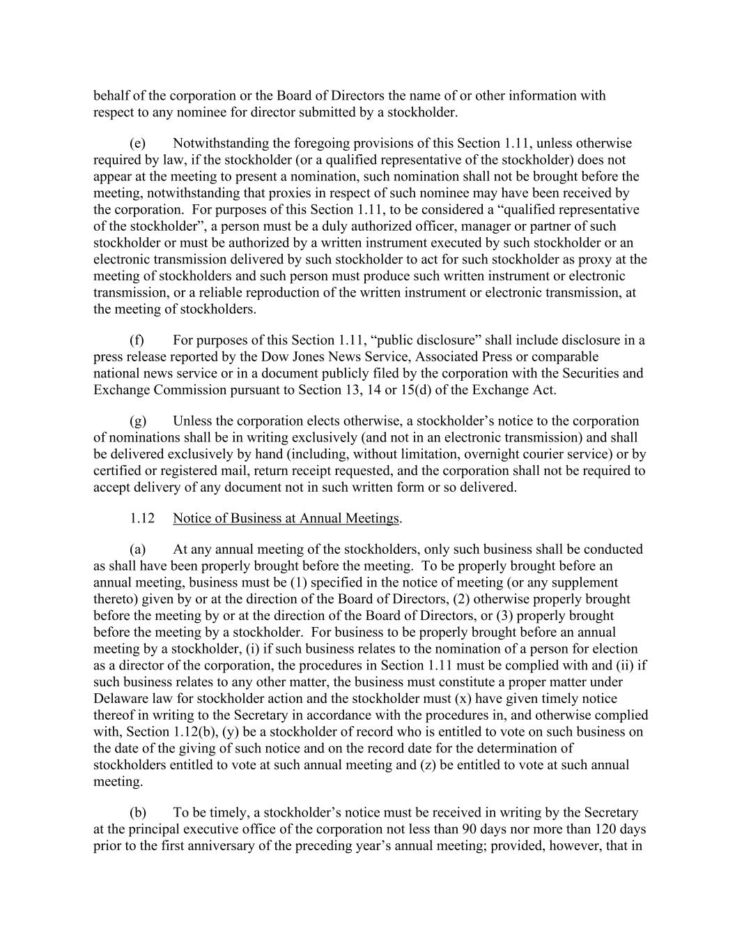 behalf of the corporation or the Board of Directors the name of or other information with respect to any nominee for director submitted by a stockholder. (e) Notwithstanding the foregoing provisions of this Section 1.11, unless otherwise required by law, if the stockholder (or a qualified representative of the stockholder) does not appear at the meeting to present a nomination, such nomination shall not be brought before the meeting, notwithstanding that proxies in respect of such nominee may have been received by the corporation. For purposes of this Section 1.11, to be considered a “qualified representative of the stockholder”, a person must be a duly authorized officer, manager or partner of such stockholder or must be authorized by a written instrument executed by such stockholder or an electronic transmission delivered by such stockholder to act for such stockholder as proxy at the meeting of stockholders and such person must produce such written instrument or electronic transmission, or a reliable reproduction of the written instrument or electronic transmission, at the meeting of stockholders. (f) For purposes of this Section 1.11, “public disclosure” shall include disclosure in a press release reported by the Dow Jones News Service, Associated Press or comparable national news service or in a document publicly filed by the corporation with the Securities and Exchange Commission pursuant to Section 13, 14 or 15(d) of the Exchange Act. (g) Unless the corporation elects otherwise, a stockholder’s notice to the corporation of nominations shall be in writing exclusively (and not in an electronic transmission) and shall be delivered exclusively by hand (including, without limitation, overnight courier service) or by certified or registered mail, return receipt requested, and the corporation shall not be required to accept delivery of any document not in such written form or so delivered. 1.12 Notice of Business at Annual Meetings. (a) At any annual meeting of the stockholders, only such business shall be conducted as shall have been properly brought before the meeting. To be properly brought before an annual meeting, business must be (1) specified in the notice of meeting (or any supplement thereto) given by or at the direction of the Board of Directors, (2) otherwise properly brought before the meeting by or at the direction of the Board of Directors, or (3) properly brought before the meeting by a stockholder. For business to be properly brought before an annual meeting by a stockholder, (i) if such business relates to the nomination of a person for election as a director of the corporation, the procedures in Section 1.11 must be complied with and (ii) if such business relates to any other matter, the business must constitute a proper matter under Delaware law for stockholder action and the stockholder must (x) have given timely notice thereof in writing to the Secretary in accordance with the procedures in, and otherwise complied with, Section 1.12(b), (y) be a stockholder of record who is entitled to vote on such business on the date of the giving of such notice and on the record date for the determination of stockholders entitled to vote at such annual meeting and (z) be entitled to vote at such annual meeting. (b) To be timely, a stockholder’s notice must be received in writing by the Secretary at the principal executive office of the corporation not less than 90 days nor more than 120 days prior to the first anniversary of the preceding year’s annual meeting; provided, however, that in