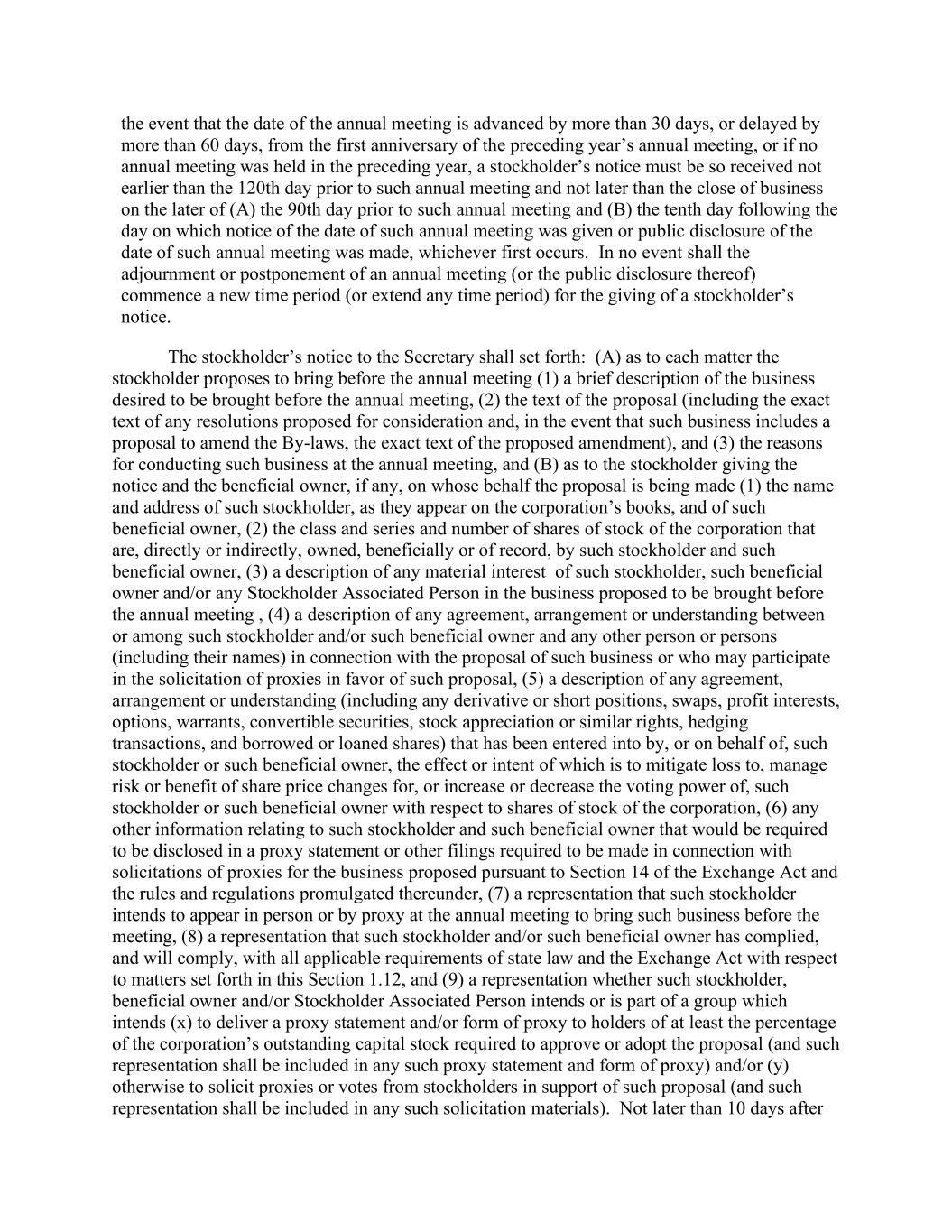 the event that the date of the annual meeting is advanced by more than 30 days, or delayed by more than 60 days, from the first anniversary of the preceding year’s annual meeting, or if no annual meeting was held in the preceding year, a stockholder’s notice must be so received not earlier than the 120th day prior to such annual meeting and not later than the close of business on the later of (A) the 90th day prior to such annual meeting and (B) the tenth day following the day on which notice of the date of such annual meeting was given or public disclosure of the date of such annual meeting was made, whichever first occurs. In no event shall the adjournment or postponement of an annual meeting (or the public disclosure thereof) commence a new time period (or extend any time period) for the giving of a stockholder’s notice. The stockholder’s notice to the Secretary shall set forth: (A) as to each matter the stockholder proposes to bring before the annual meeting (1) a brief description of the business desired to be brought before the annual meeting, (2) the text of the proposal (including the exact text of any resolutions proposed for consideration and, in the event that such business includes a proposal to amend the By-laws, the exact text of the proposed amendment), and (3) the reasons for conducting such business at the annual meeting, and (B) as to the stockholder giving the notice and the beneficial owner, if any, on whose behalf the proposal is being made (1) the name and address of such stockholder, as they appear on the corporation’s books, and of such beneficial owner, (2) the class and series and number of shares of stock of the corporation that are, directly or indirectly, owned, beneficially or of record, by such stockholder and such beneficial owner, (3) a description of any material interest of such stockholder, such beneficial owner and/or any Stockholder Associated Person in the business proposed to be brought before the annual meeting , (4) a description of any agreement, arrangement or understanding between or among such stockholder and/or such beneficial owner and any other person or persons (including their names) in connection with the proposal of such business or who may participate in the solicitation of proxies in favor of such proposal, (5) a description of any agreement, arrangement or understanding (including any derivative or short positions, swaps, profit interests, options, warrants, convertible securities, stock appreciation or similar rights, hedging transactions, and borrowed or loaned shares) that has been entered into by, or on behalf of, such stockholder or such beneficial owner, the effect or intent of which is to mitigate loss to, manage risk or benefit of share price changes for, or increase or decrease the voting power of, such stockholder or such beneficial owner with respect to shares of stock of the corporation, (6) any other information relating to such stockholder and such beneficial owner that would be required to be disclosed in a proxy statement or other filings required to be made in connection with solicitations of proxies for the business proposed pursuant to Section 14 of the Exchange Act and the rules and regulations promulgated thereunder, (7) a representation that such stockholder intends to appear in person or by proxy at the annual meeting to bring such business before the meeting, (8) a representation that such stockholder and/or such beneficial owner has complied, and will comply, with all applicable requirements of state law and the Exchange Act with respect to matters set forth in this Section 1.12, and (9) a representation whether such stockholder, beneficial owner and/or Stockholder Associated Person intends or is part of a group which intends (x) to deliver a proxy statement and/or form of proxy to holders of at least the percentage of the corporation’s outstanding capital stock required to approve or adopt the proposal (and such representation shall be included in any such proxy statement and form of proxy) and/or (y) otherwise to solicit proxies or votes from stockholders in support of such proposal (and such representation shall be included in any such solicitation materials). Not later than 10 days after