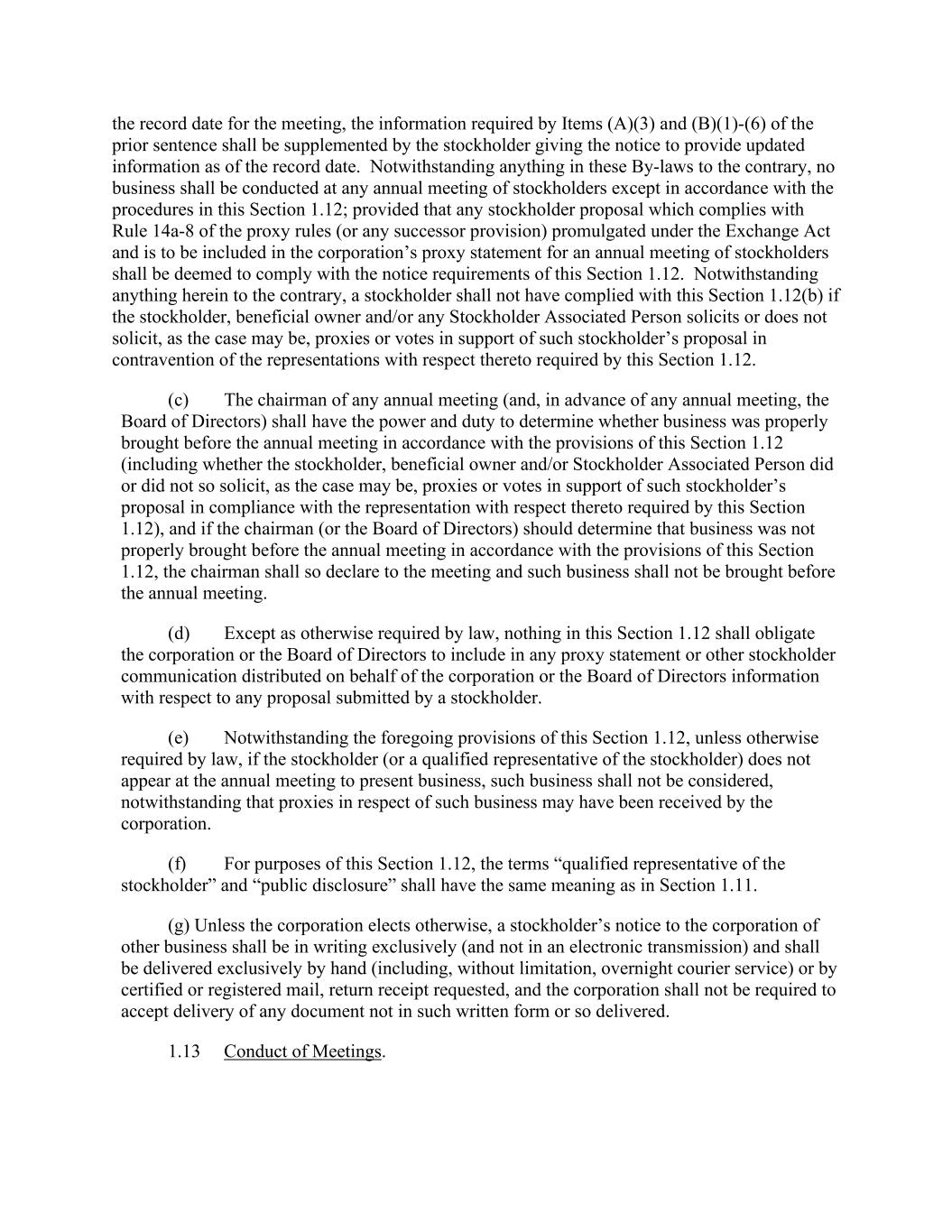 the record date for the meeting, the information required by Items (A)(3) and (B)(1)-(6) of the prior sentence shall be supplemented by the stockholder giving the notice to provide updated information as of the record date. Notwithstanding anything in these By-laws to the contrary, no business shall be conducted at any annual meeting of stockholders except in accordance with the procedures in this Section 1.12; provided that any stockholder proposal which complies with Rule 14a-8 of the proxy rules (or any successor provision) promulgated under the Exchange Act and is to be included in the corporation’s proxy statement for an annual meeting of stockholders shall be deemed to comply with the notice requirements of this Section 1.12. Notwithstanding anything herein to the contrary, a stockholder shall not have complied with this Section 1.12(b) if the stockholder, beneficial owner and/or any Stockholder Associated Person solicits or does not solicit, as the case may be, proxies or votes in support of such stockholder’s proposal in contravention of the representations with respect thereto required by this Section 1.12. (c) The chairman of any annual meeting (and, in advance of any annual meeting, the Board of Directors) shall have the power and duty to determine whether business was properly brought before the annual meeting in accordance with the provisions of this Section 1.12 (including whether the stockholder, beneficial owner and/or Stockholder Associated Person did or did not so solicit, as the case may be, proxies or votes in support of such stockholder’s proposal in compliance with the representation with respect thereto required by this Section 1.12), and if the chairman (or the Board of Directors) should determine that business was not properly brought before the annual meeting in accordance with the provisions of this Section 1.12, the chairman shall so declare to the meeting and such business shall not be brought before the annual meeting. (d) Except as otherwise required by law, nothing in this Section 1.12 shall obligate the corporation or the Board of Directors to include in any proxy statement or other stockholder communication distributed on behalf of the corporation or the Board of Directors information with respect to any proposal submitted by a stockholder. (e) Notwithstanding the foregoing provisions of this Section 1.12, unless otherwise required by law, if the stockholder (or a qualified representative of the stockholder) does not appear at the annual meeting to present business, such business shall not be considered, notwithstanding that proxies in respect of such business may have been received by the corporation. (f) For purposes of this Section 1.12, the terms “qualified representative of the stockholder” and “public disclosure” shall have the same meaning as in Section 1.11. (g) Unless the corporation elects otherwise, a stockholder’s notice to the corporation of other business shall be in writing exclusively (and not in an electronic transmission) and shall be delivered exclusively by hand (including, without limitation, overnight courier service) or by certified or registered mail, return receipt requested, and the corporation shall not be required to accept delivery of any document not in such written form or so delivered. 1.13 Conduct of Meetings.