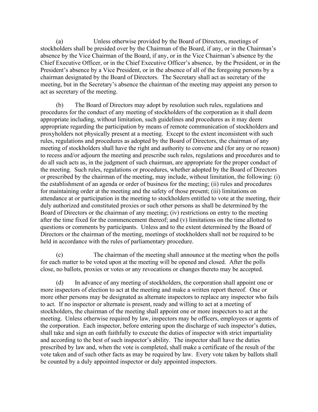 (a) Unless otherwise provided by the Board of Directors, meetings of stockholders shall be presided over by the Chairman of the Board, if any, or in the Chairman’s absence by the Vice Chairman of the Board, if any, or in the Vice Chairman’s absence by the Chief Executive Officer, or in the Chief Executive Officer’s absence, by the President, or in the President’s absence by a Vice President, or in the absence of all of the foregoing persons by a chairman designated by the Board of Directors. The Secretary shall act as secretary of the meeting, but in the Secretary’s absence the chairman of the meeting may appoint any person to act as secretary of the meeting. (b) The Board of Directors may adopt by resolution such rules, regulations and procedures for the conduct of any meeting of stockholders of the corporation as it shall deem appropriate including, without limitation, such guidelines and procedures as it may deem appropriate regarding the participation by means of remote communication of stockholders and proxyholders not physically present at a meeting. Except to the extent inconsistent with such rules, regulations and procedures as adopted by the Board of Directors, the chairman of any meeting of stockholders shall have the right and authority to convene and (for any or no reason) to recess and/or adjourn the meeting and prescribe such rules, regulations and procedures and to do all such acts as, in the judgment of such chairman, are appropriate for the proper conduct of the meeting. Such rules, regulations or procedures, whether adopted by the Board of Directors or prescribed by the chairman of the meeting, may include, without limitation, the following: (i) the establishment of an agenda or order of business for the meeting; (ii) rules and procedures for maintaining order at the meeting and the safety of those present; (iii) limitations on attendance at or participation in the meeting to stockholders entitled to vote at the meeting, their duly authorized and constituted proxies or such other persons as shall be determined by the Board of Directors or the chairman of any meeting; (iv) restrictions on entry to the meeting after the time fixed for the commencement thereof; and (v) limitations on the time allotted to questions or comments by participants. Unless and to the extent determined by the Board of Directors or the chairman of the meeting, meetings of stockholders shall not be required to be held in accordance with the rules of parliamentary procedure. (c) The chairman of the meeting shall announce at the meeting when the polls for each matter to be voted upon at the meeting will be opened and closed. After the polls close, no ballots, proxies or votes or any revocations or changes thereto may be accepted. (d) In advance of any meeting of stockholders, the corporation shall appoint one or more inspectors of election to act at the meeting and make a written report thereof. One or more other persons may be designated as alternate inspectors to replace any inspector who fails to act. If no inspector or alternate is present, ready and willing to act at a meeting of stockholders, the chairman of the meeting shall appoint one or more inspectors to act at the meeting. Unless otherwise required by law, inspectors may be officers, employees or agents of the corporation. Each inspector, before entering upon the discharge of such inspector’s duties, shall take and sign an oath faithfully to execute the duties of inspector with strict impartiality and according to the best of such inspector’s ability. The inspector shall have the duties prescribed by law and, when the vote is completed, shall make a certificate of the result of the vote taken and of such other facts as may be required by law. Every vote taken by ballots shall be counted by a duly appointed inspector or duly appointed inspectors.