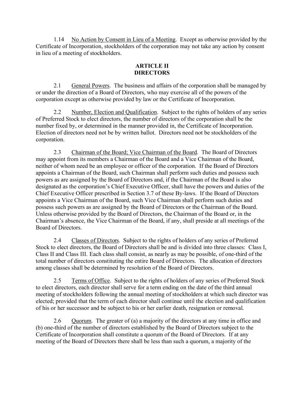1.14 No Action by Consent in Lieu of a Meeting. Except as otherwise provided by the Certificate of Incorporation, stockholders of the corporation may not take any action by consent in lieu of a meeting of stockholders. ARTICLE II DIRECTORS 2.1 General Powers. The business and affairs of the corporation shall be managed by or under the direction of a Board of Directors, who may exercise all of the powers of the corporation except as otherwise provided by law or the Certificate of Incorporation. 2.2 Number, Election and Qualification. Subject to the rights of holders of any series of Preferred Stock to elect directors, the number of directors of the corporation shall be the number fixed by, or determined in the manner provided in, the Certificate of Incorporation. Election of directors need not be by written ballot. Directors need not be stockholders of the corporation. 2.3 Chairman of the Board; Vice Chairman of the Board. The Board of Directors may appoint from its members a Chairman of the Board and a Vice Chairman of the Board, neither of whom need be an employee or officer of the corporation. If the Board of Directors appoints a Chairman of the Board, such Chairman shall perform such duties and possess such powers as are assigned by the Board of Directors and, if the Chairman of the Board is also designated as the corporation’s Chief Executive Officer, shall have the powers and duties of the Chief Executive Officer prescribed in Section 3.7 of these By-laws. If the Board of Directors appoints a Vice Chairman of the Board, such Vice Chairman shall perform such duties and possess such powers as are assigned by the Board of Directors or the Chairman of the Board. Unless otherwise provided by the Board of Directors, the Chairman of the Board or, in the Chairman’s absence, the Vice Chairman of the Board, if any, shall preside at all meetings of the Board of Directors. 2.4 Classes of Directors. Subject to the rights of holders of any series of Preferred Stock to elect directors, the Board of Directors shall be and is divided into three classes: Class I, Class II and Class III. Each class shall consist, as nearly as may be possible, of one-third of the total number of directors constituting the entire Board of Directors. The allocation of directors among classes shall be determined by resolution of the Board of Directors. 2.5 Terms of Office. Subject to the rights of holders of any series of Preferred Stock to elect directors, each director shall serve for a term ending on the date of the third annual meeting of stockholders following the annual meeting of stockholders at which such director was elected; provided that the term of each director shall continue until the election and qualification of his or her successor and be subject to his or her earlier death, resignation or removal. 2.6 Quorum. The greater of (a) a majority of the directors at any time in office and (b) one-third of the number of directors established by the Board of Directors subject to the Certificate of Incorporation shall constitute a quorum of the Board of Directors. If at any meeting of the Board of Directors there shall be less than such a quorum, a majority of the