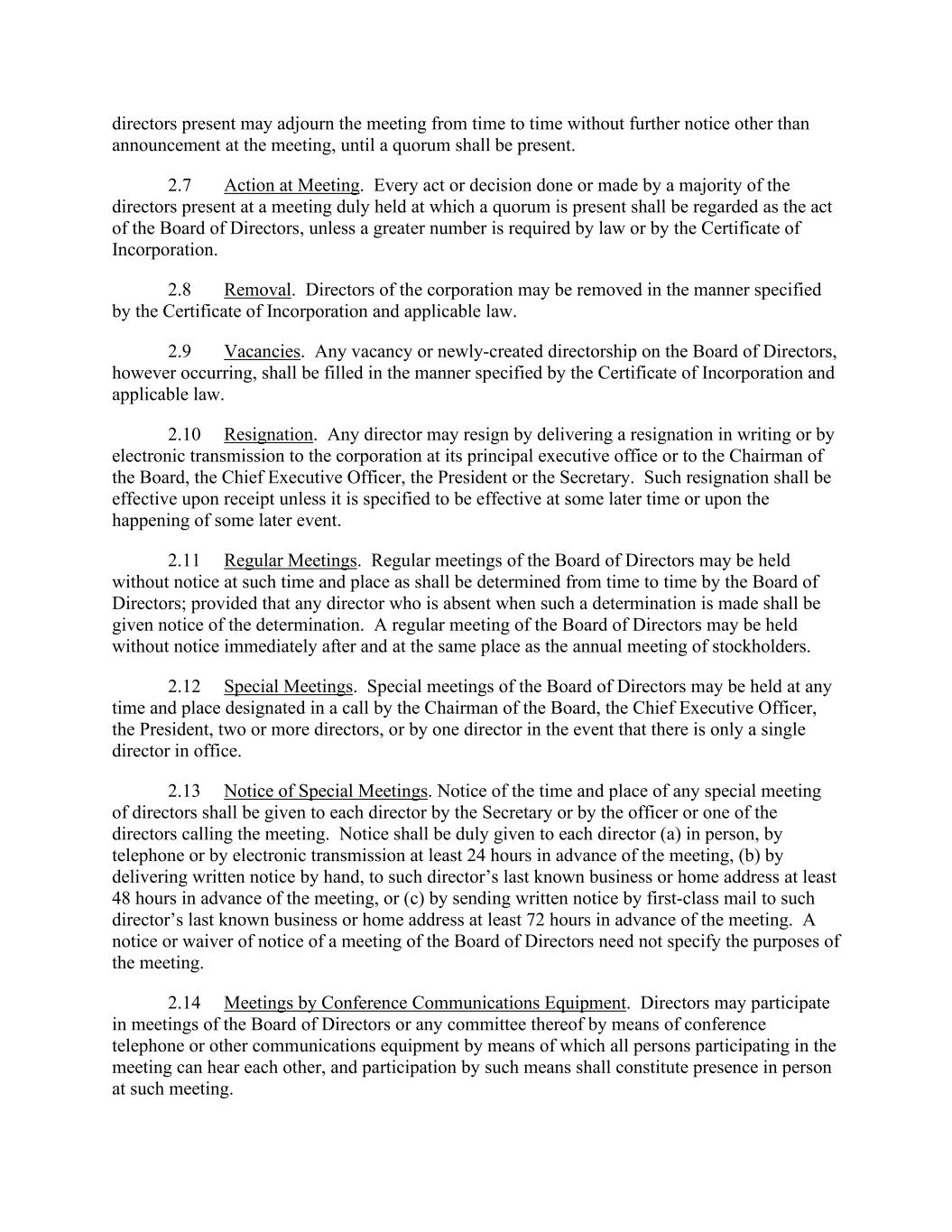 directors present may adjourn the meeting from time to time without further notice other than announcement at the meeting, until a quorum shall be present. 2.7 Action at Meeting. Every act or decision done or made by a majority of the directors present at a meeting duly held at which a quorum is present shall be regarded as the act of the Board of Directors, unless a greater number is required by law or by the Certificate of Incorporation. 2.8 Removal. Directors of the corporation may be removed in the manner specified by the Certificate of Incorporation and applicable law. 2.9 Vacancies. Any vacancy or newly-created directorship on the Board of Directors, however occurring, shall be filled in the manner specified by the Certificate of Incorporation and applicable law. 2.10 Resignation. Any director may resign by delivering a resignation in writing or by electronic transmission to the corporation at its principal executive office or to the Chairman of the Board, the Chief Executive Officer, the President or the Secretary. Such resignation shall be effective upon receipt unless it is specified to be effective at some later time or upon the happening of some later event. 2.11 Regular Meetings. Regular meetings of the Board of Directors may be held without notice at such time and place as shall be determined from time to time by the Board of Directors; provided that any director who is absent when such a determination is made shall be given notice of the determination. A regular meeting of the Board of Directors may be held without notice immediately after and at the same place as the annual meeting of stockholders. 2.12 Special Meetings. Special meetings of the Board of Directors may be held at any time and place designated in a call by the Chairman of the Board, the Chief Executive Officer, the President, two or more directors, or by one director in the event that there is only a single director in office. 2.13 Notice of Special Meetings. Notice of the time and place of any special meeting of directors shall be given to each director by the Secretary or by the officer or one of the directors calling the meeting. Notice shall be duly given to each director (a) in person, by telephone or by electronic transmission at least 24 hours in advance of the meeting, (b) by delivering written notice by hand, to such director’s last known business or home address at least 48 hours in advance of the meeting, or (c) by sending written notice by first-class mail to such director’s last known business or home address at least 72 hours in advance of the meeting. A notice or waiver of notice of a meeting of the Board of Directors need not specify the purposes of the meeting. 2.14 Meetings by Conference Communications Equipment. Directors may participate in meetings of the Board of Directors or any committee thereof by means of conference telephone or other communications equipment by means of which all persons participating in the meeting can hear each other, and participation by such means shall constitute presence in person at such meeting.