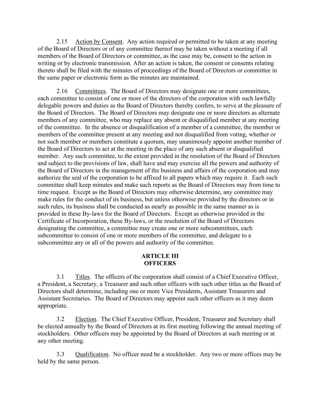 2.15 Action by Consent. Any action required or permitted to be taken at any meeting of the Board of Directors or of any committee thereof may be taken without a meeting if all members of the Board of Directors or committee, as the case may be, consent to the action in writing or by electronic transmission. After an action is taken, the consent or consents relating thereto shall be filed with the minutes of proceedings of the Board of Directors or committee in the same paper or electronic form as the minutes are maintained. 2.16 Committees. The Board of Directors may designate one or more committees, each committee to consist of one or more of the directors of the corporation with such lawfully delegable powers and duties as the Board of Directors thereby confers, to serve at the pleasure of the Board of Directors. The Board of Directors may designate one or more directors as alternate members of any committee, who may replace any absent or disqualified member at any meeting of the committee. In the absence or disqualification of a member of a committee, the member or members of the committee present at any meeting and not disqualified from voting, whether or not such member or members constitute a quorum, may unanimously appoint another member of the Board of Directors to act at the meeting in the place of any such absent or disqualified member. Any such committee, to the extent provided in the resolution of the Board of Directors and subject to the provisions of law, shall have and may exercise all the powers and authority of the Board of Directors in the management of the business and affairs of the corporation and may authorize the seal of the corporation to be affixed to all papers which may require it. Each such committee shall keep minutes and make such reports as the Board of Directors may from time to time request. Except as the Board of Directors may otherwise determine, any committee may make rules for the conduct of its business, but unless otherwise provided by the directors or in such rules, its business shall be conducted as nearly as possible in the same manner as is provided in these By-laws for the Board of Directors. Except as otherwise provided in the Certificate of Incorporation, these By-laws, or the resolution of the Board of Directors designating the committee, a committee may create one or more subcommittees, each subcommittee to consist of one or more members of the committee, and delegate to a subcommittee any or all of the powers and authority of the committee. ARTICLE III OFFICERS 3.1 Titles. The officers of the corporation shall consist of a Chief Executive Officer, a President, a Secretary, a Treasurer and such other officers with such other titles as the Board of Directors shall determine, including one or more Vice Presidents, Assistant Treasurers and Assistant Secretaries. The Board of Directors may appoint such other officers as it may deem appropriate. 3.2 Election. The Chief Executive Officer, President, Treasurer and Secretary shall be elected annually by the Board of Directors at its first meeting following the annual meeting of stockholders. Other officers may be appointed by the Board of Directors at such meeting or at any other meeting. 3.3 Qualification. No officer need be a stockholder. Any two or more offices may be held by the same person.