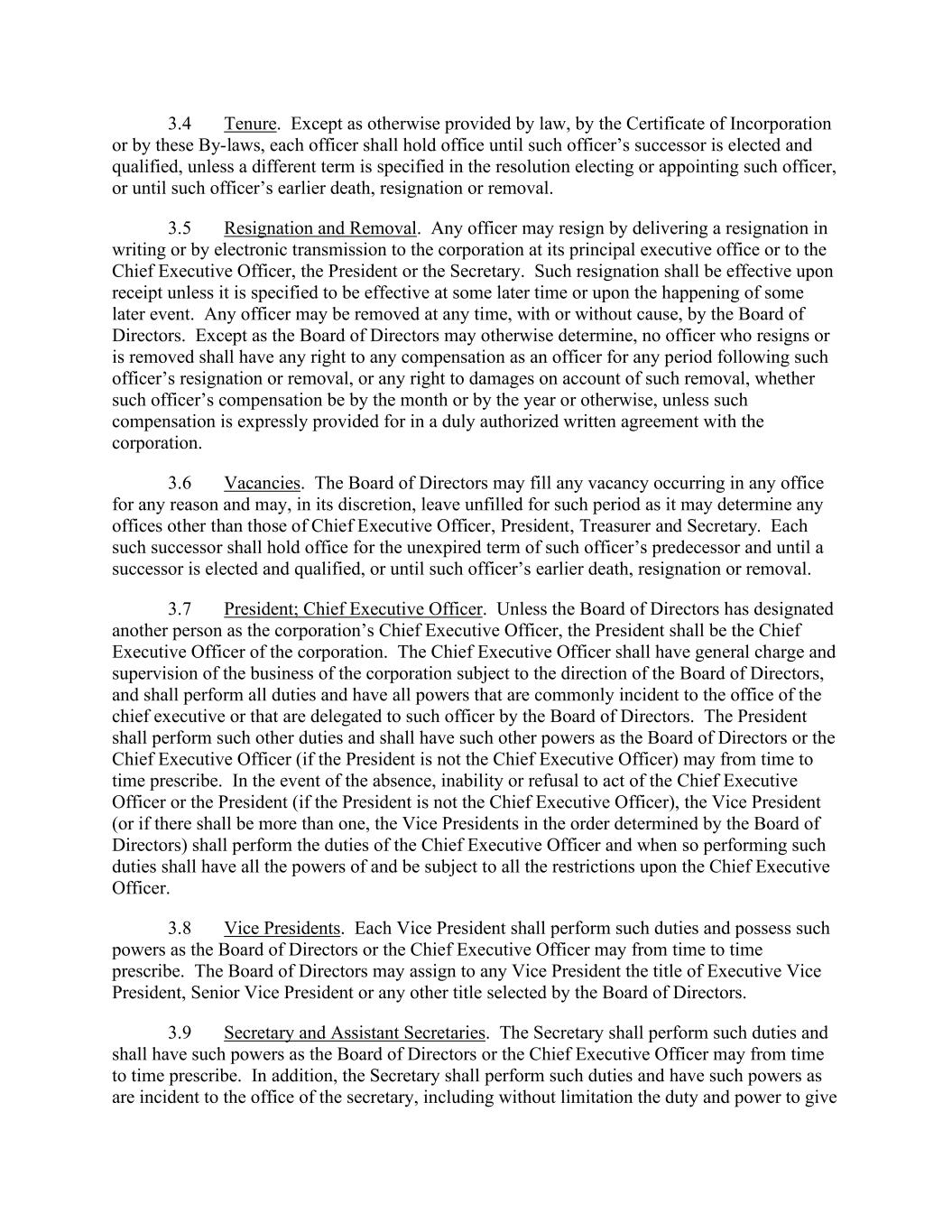 3.4 Tenure. Except as otherwise provided by law, by the Certificate of Incorporation or by these By-laws, each officer shall hold office until such officer’s successor is elected and qualified, unless a different term is specified in the resolution electing or appointing such officer, or until such officer’s earlier death, resignation or removal. 3.5 Resignation and Removal. Any officer may resign by delivering a resignation in writing or by electronic transmission to the corporation at its principal executive office or to the Chief Executive Officer, the President or the Secretary. Such resignation shall be effective upon receipt unless it is specified to be effective at some later time or upon the happening of some later event. Any officer may be removed at any time, with or without cause, by the Board of Directors. Except as the Board of Directors may otherwise determine, no officer who resigns or is removed shall have any right to any compensation as an officer for any period following such officer’s resignation or removal, or any right to damages on account of such removal, whether such officer’s compensation be by the month or by the year or otherwise, unless such compensation is expressly provided for in a duly authorized written agreement with the corporation. 3.6 Vacancies. The Board of Directors may fill any vacancy occurring in any office for any reason and may, in its discretion, leave unfilled for such period as it may determine any offices other than those of Chief Executive Officer, President, Treasurer and Secretary. Each such successor shall hold office for the unexpired term of such officer’s predecessor and until a successor is elected and qualified, or until such officer’s earlier death, resignation or removal. 3.7 President; Chief Executive Officer. Unless the Board of Directors has designated another person as the corporation’s Chief Executive Officer, the President shall be the Chief Executive Officer of the corporation. The Chief Executive Officer shall have general charge and supervision of the business of the corporation subject to the direction of the Board of Directors, and shall perform all duties and have all powers that are commonly incident to the office of the chief executive or that are delegated to such officer by the Board of Directors. The President shall perform such other duties and shall have such other powers as the Board of Directors or the Chief Executive Officer (if the President is not the Chief Executive Officer) may from time to time prescribe. In the event of the absence, inability or refusal to act of the Chief Executive Officer or the President (if the President is not the Chief Executive Officer), the Vice President (or if there shall be more than one, the Vice Presidents in the order determined by the Board of Directors) shall perform the duties of the Chief Executive Officer and when so performing such duties shall have all the powers of and be subject to all the restrictions upon the Chief Executive Officer. 3.8 Vice Presidents. Each Vice President shall perform such duties and possess such powers as the Board of Directors or the Chief Executive Officer may from time to time prescribe. The Board of Directors may assign to any Vice President the title of Executive Vice President, Senior Vice President or any other title selected by the Board of Directors. 3.9 Secretary and Assistant Secretaries. The Secretary shall perform such duties and shall have such powers as the Board of Directors or the Chief Executive Officer may from time to time prescribe. In addition, the Secretary shall perform such duties and have such powers as are incident to the office of the secretary, including without limitation the duty and power to give