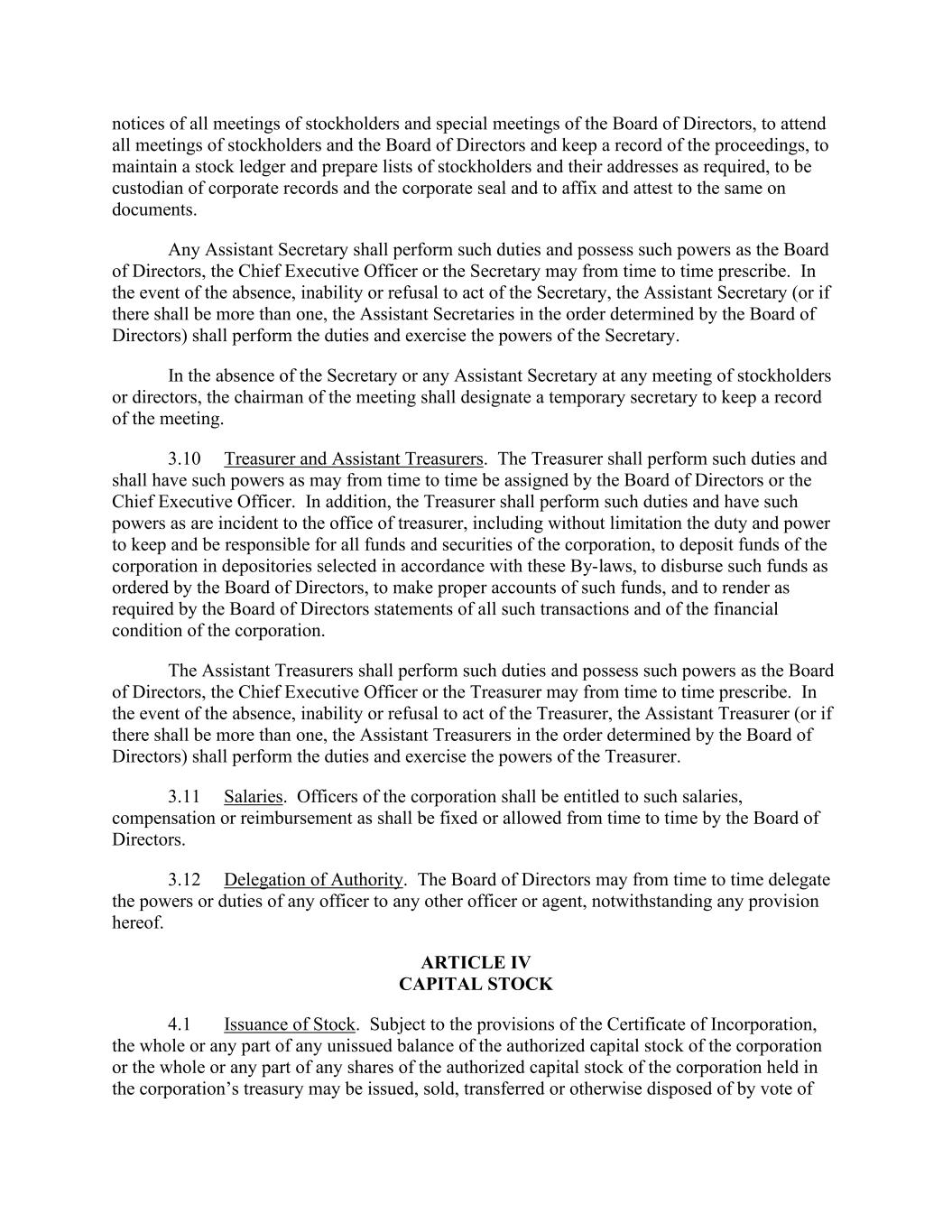 notices of all meetings of stockholders and special meetings of the Board of Directors, to attend all meetings of stockholders and the Board of Directors and keep a record of the proceedings, to maintain a stock ledger and prepare lists of stockholders and their addresses as required, to be custodian of corporate records and the corporate seal and to affix and attest to the same on documents. Any Assistant Secretary shall perform such duties and possess such powers as the Board of Directors, the Chief Executive Officer or the Secretary may from time to time prescribe. In the event of the absence, inability or refusal to act of the Secretary, the Assistant Secretary (or if there shall be more than one, the Assistant Secretaries in the order determined by the Board of Directors) shall perform the duties and exercise the powers of the Secretary. In the absence of the Secretary or any Assistant Secretary at any meeting of stockholders or directors, the chairman of the meeting shall designate a temporary secretary to keep a record of the meeting. 3.10 Treasurer and Assistant Treasurers. The Treasurer shall perform such duties and shall have such powers as may from time to time be assigned by the Board of Directors or the Chief Executive Officer. In addition, the Treasurer shall perform such duties and have such powers as are incident to the office of treasurer, including without limitation the duty and power to keep and be responsible for all funds and securities of the corporation, to deposit funds of the corporation in depositories selected in accordance with these By-laws, to disburse such funds as ordered by the Board of Directors, to make proper accounts of such funds, and to render as required by the Board of Directors statements of all such transactions and of the financial condition of the corporation. The Assistant Treasurers shall perform such duties and possess such powers as the Board of Directors, the Chief Executive Officer or the Treasurer may from time to time prescribe. In the event of the absence, inability or refusal to act of the Treasurer, the Assistant Treasurer (or if there shall be more than one, the Assistant Treasurers in the order determined by the Board of Directors) shall perform the duties and exercise the powers of the Treasurer. 3.11 Salaries. Officers of the corporation shall be entitled to such salaries, compensation or reimbursement as shall be fixed or allowed from time to time by the Board of Directors. 3.12 Delegation of Authority. The Board of Directors may from time to time delegate the powers or duties of any officer to any other officer or agent, notwithstanding any provision hereof. ARTICLE IV CAPITAL STOCK 4.1 Issuance of Stock. Subject to the provisions of the Certificate of Incorporation, the whole or any part of any unissued balance of the authorized capital stock of the corporation or the whole or any part of any shares of the authorized capital stock of the corporation held in the corporation’s treasury may be issued, sold, transferred or otherwise disposed of by vote of