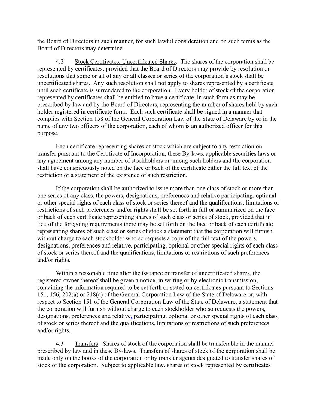 the Board of Directors in such manner, for such lawful consideration and on such terms as the Board of Directors may determine. 4.2 Stock Certificates; Uncertificated Shares. The shares of the corporation shall be represented by certificates, provided that the Board of Directors may provide by resolution or resolutions that some or all of any or all classes or series of the corporation’s stock shall be uncertificated shares. Any such resolution shall not apply to shares represented by a certificate until such certificate is surrendered to the corporation. Every holder of stock of the corporation represented by certificates shall be entitled to have a certificate, in such form as may be prescribed by law and by the Board of Directors, representing the number of shares held by such holder registered in certificate form. Each such certificate shall be signed in a manner that complies with Section 158 of the General Corporation Law of the State of Delaware by or in the name of any two officers of the corporation, each of whom is an authorized officer for this purpose. Each certificate representing shares of stock which are subject to any restriction on transfer pursuant to the Certificate of Incorporation, these By-laws, applicable securities laws or any agreement among any number of stockholders or among such holders and the corporation shall have conspicuously noted on the face or back of the certificate either the full text of the restriction or a statement of the existence of such restriction. If the corporation shall be authorized to issue more than one class of stock or more than one series of any class, the powers, designations, preferences and relative participating, optional or other special rights of each class of stock or series thereof and the qualifications, limitations or restrictions of such preferences and/or rights shall be set forth in full or summarized on the face or back of each certificate representing shares of such class or series of stock, provided that in lieu of the foregoing requirements there may be set forth on the face or back of each certificate representing shares of such class or series of stock a statement that the corporation will furnish without charge to each stockholder who so requests a copy of the full text of the powers, designations, preferences and relative, participating, optional or other special rights of each class of stock or series thereof and the qualifications, limitations or restrictions of such preferences and/or rights. Within a reasonable time after the issuance or transfer of uncertificated shares, the registered owner thereof shall be given a notice, in writing or by electronic transmission, containing the information required to be set forth or stated on certificates pursuant to Sections 151, 156, 202(a) or 218(a) of the General Corporation Law of the State of Delaware or, with respect to Section 151 of the General Corporation Law of the State of Delaware, a statement that the corporation will furnish without charge to each stockholder who so requests the powers, designations, preferences and relative, participating, optional or other special rights of each class of stock or series thereof and the qualifications, limitations or restrictions of such preferences and/or rights. 4.3 Transfers. Shares of stock of the corporation shall be transferable in the manner prescribed by law and in these By-laws. Transfers of shares of stock of the corporation shall be made only on the books of the corporation or by transfer agents designated to transfer shares of stock of the corporation. Subject to applicable law, shares of stock represented by certificates