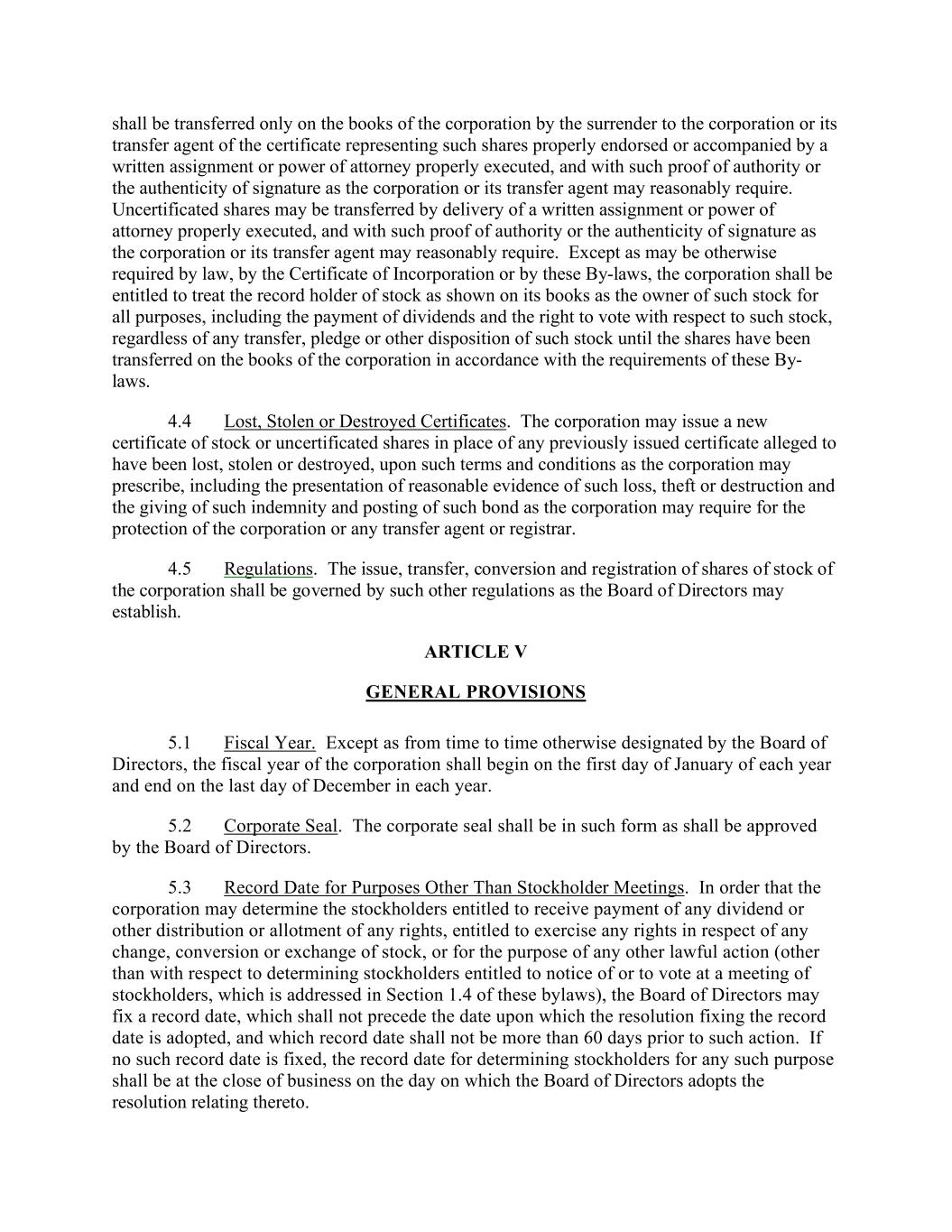 shall be transferred only on the books of the corporation by the surrender to the corporation or its transfer agent of the certificate representing such shares properly endorsed or accompanied by a written assignment or power of attorney properly executed, and with such proof of authority or the authenticity of signature as the corporation or its transfer agent may reasonably require. Uncertificated shares may be transferred by delivery of a written assignment or power of attorney properly executed, and with such proof of authority or the authenticity of signature as the corporation or its transfer agent may reasonably require. Except as may be otherwise required by law, by the Certificate of Incorporation or by these By-laws, the corporation shall be entitled to treat the record holder of stock as shown on its books as the owner of such stock for all purposes, including the payment of dividends and the right to vote with respect to such stock, regardless of any transfer, pledge or other disposition of such stock until the shares have been transferred on the books of the corporation in accordance with the requirements of these By- laws. 4.4 Lost, Stolen or Destroyed Certificates. The corporation may issue a new certificate of stock or uncertificated shares in place of any previously issued certificate alleged to have been lost, stolen or destroyed, upon such terms and conditions as the corporation may prescribe, including the presentation of reasonable evidence of such loss, theft or destruction and the giving of such indemnity and posting of such bond as the corporation may require for the protection of the corporation or any transfer agent or registrar. 4.5 Regulations. The issue, transfer, conversion and registration of shares of stock of the corporation shall be governed by such other regulations as the Board of Directors may establish. ARTICLE V GENERAL PROVISIONS 5.1 Fiscal Year. Except as from time to time otherwise designated by the Board of Directors, the fiscal year of the corporation shall begin on the first day of January of each year and end on the last day of December in each year. 5.2 Corporate Seal. The corporate seal shall be in such form as shall be approved by the Board of Directors. 5.3 Record Date for Purposes Other Than Stockholder Meetings. In order that the corporation may determine the stockholders entitled to receive payment of any dividend or other distribution or allotment of any rights, entitled to exercise any rights in respect of any change, conversion or exchange of stock, or for the purpose of any other lawful action (other than with respect to determining stockholders entitled to notice of or to vote at a meeting of stockholders, which is addressed in Section 1.4 of these bylaws), the Board of Directors may fix a record date, which shall not precede the date upon which the resolution fixing the record date is adopted, and which record date shall not be more than 60 days prior to such action. If no such record date is fixed, the record date for determining stockholders for any such purpose shall be at the close of business on the day on which the Board of Directors adopts the resolution relating thereto.