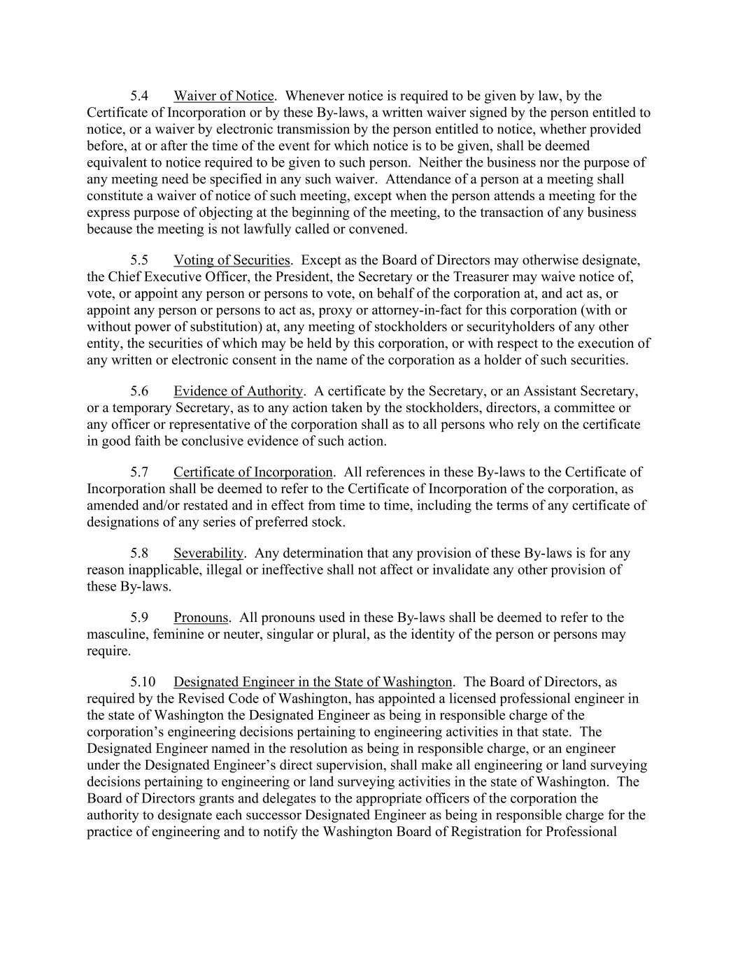 5.4 Waiver of Notice. Whenever notice is required to be given by law, by the Certificate of Incorporation or by these By-laws, a written waiver signed by the person entitled to notice, or a waiver by electronic transmission by the person entitled to notice, whether provided before, at or after the time of the event for which notice is to be given, shall be deemed equivalent to notice required to be given to such person. Neither the business nor the purpose of any meeting need be specified in any such waiver. Attendance of a person at a meeting shall constitute a waiver of notice of such meeting, except when the person attends a meeting for the express purpose of objecting at the beginning of the meeting, to the transaction of any business because the meeting is not lawfully called or convened. 5.5 Voting of Securities. Except as the Board of Directors may otherwise designate, the Chief Executive Officer, the President, the Secretary or the Treasurer may waive notice of, vote, or appoint any person or persons to vote, on behalf of the corporation at, and act as, or appoint any person or persons to act as, proxy or attorney-in-fact for this corporation (with or without power of substitution) at, any meeting of stockholders or securityholders of any other entity, the securities of which may be held by this corporation, or with respect to the execution of any written or electronic consent in the name of the corporation as a holder of such securities. 5.6 Evidence of Authority. A certificate by the Secretary, or an Assistant Secretary, or a temporary Secretary, as to any action taken by the stockholders, directors, a committee or any officer or representative of the corporation shall as to all persons who rely on the certificate in good faith be conclusive evidence of such action. 5.7 Certificate of Incorporation. All references in these By-laws to the Certificate of Incorporation shall be deemed to refer to the Certificate of Incorporation of the corporation, as amended and/or restated and in effect from time to time, including the terms of any certificate of designations of any series of preferred stock. 5.8 Severability. Any determination that any provision of these By-laws is for any reason inapplicable, illegal or ineffective shall not affect or invalidate any other provision of these By-laws. 5.9 Pronouns. All pronouns used in these By-laws shall be deemed to refer to the masculine, feminine or neuter, singular or plural, as the identity of the person or persons may require. 5.10 Designated Engineer in the State of Washington. The Board of Directors, as required by the Revised Code of Washington, has appointed a licensed professional engineer in the state of Washington the Designated Engineer as being in responsible charge of the corporation’s engineering decisions pertaining to engineering activities in that state. The Designated Engineer named in the resolution as being in responsible charge, or an engineer under the Designated Engineer’s direct supervision, shall make all engineering or land surveying decisions pertaining to engineering or land surveying activities in the state of Washington. The Board of Directors grants and delegates to the appropriate officers of the corporation the authority to designate each successor Designated Engineer as being in responsible charge for the practice of engineering and to notify the Washington Board of Registration for Professional
