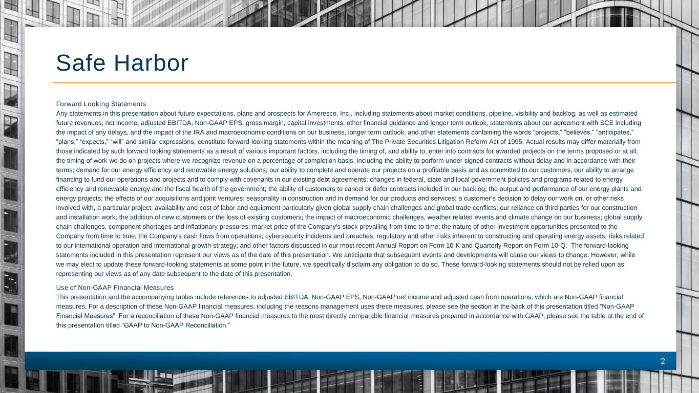 2 Safe Harbor Forward Looking Statements Any statements in this presentation about future expectations, plans and prospects for Ameresco, Inc., including statements about market conditions, pipeline, visibility and backlog, as well as estimated future revenues, net income, adjusted EBITDA, Non-GAAP EPS, gross margin, capital investments, other financial guidance and longer term outlook, statements about our agreement with SCE including the impact of any delays, and the impact of the IRA and macroeconomic conditions on our business, longer term outlook, and other statements containing the words “projects,” “believes,” “anticipates,” “plans,” “expects,” “will” and similar expressions, constitute forward-looking statements within the meaning of The Private Securities Litigation Reform Act of 1995. Actual results may differ materially from those indicated by such forward looking statements as a result of various important factors, including the timing of, and ability to, enter into contracts for awarded projects on the terms proposed or at all; the timing of work we do on projects where we recognize revenue on a percentage of completion basis, including the ability to perform under signed contracts without delay and in accordance with their terms; demand for our energy efficiency and renewable energy solutions; our ability to complete and operate our projects on a profitable basis and as committed to our customers; our ability to arrange financing to fund our operations and projects and to comply with covenants in our existing debt agreements; changes in federal, state and local government policies and programs related to energy efficiency and renewable energy and the fiscal health of the government; the ability of customers to cancel or defer contracts included in our backlog; the output and performance of our energy plants and energy projects; the effects of our acquisitions and joint ventures; seasonality in construction and in demand for our products and services; a customer’s decision to delay our work on, or other risks involved with, a particular project; availability and cost of labor and equipment particularly given global supply chain challenges and global trade conflicts; our reliance on third parties for our construction and installation work; the addition of new customers or the loss of existing customers; the impact of macroeconomic challenges, weather related events and climate change on our business; global supply chain challenges, component shortages and inflationary pressures; market price of the Company's stock prevailing from time to time; the nature of other investment opportunities presented to the Company from time to time; the Company's cash flows from operations; cybersecurity incidents and breaches; regulatory and other risks inherent to constructing and operating energy assets; risks related to our international operation and international growth strategy; and other factors discussed in our most recent Annual Report on Form 10-K and Quarterly Report on Form 10-Q. The forward-looking statements included in this presentation represent our views as of the date of this presentation. We anticipate that subsequent events and developments will cause our views to change. However, while we may elect to update these forward-looking statements at some point in the future, we specifically disclaim any obligation to do so. These forward-looking statements should not be relied upon as representing our views as of any date subsequent to the date of this presentation. Use of Non-GAAP Financial Measures This presentation and the accompanying tables include references to adjusted EBITDA, Non-GAAP EPS, Non-GAAP net income and adjusted cash from operations, which are Non-GAAP financial measures. For a description of these Non-GAAP financial measures, including the reasons management uses these measures, please see the section in the back of this presentation titled “Non-GAAP Financial Measures”. For a reconciliation of these Non-GAAP financial measures to the most directly comparable financial measures prepared in accordance with GAAP, please see the table at the end of this presentation titled “GAAP to Non-GAAP Reconciliation.”