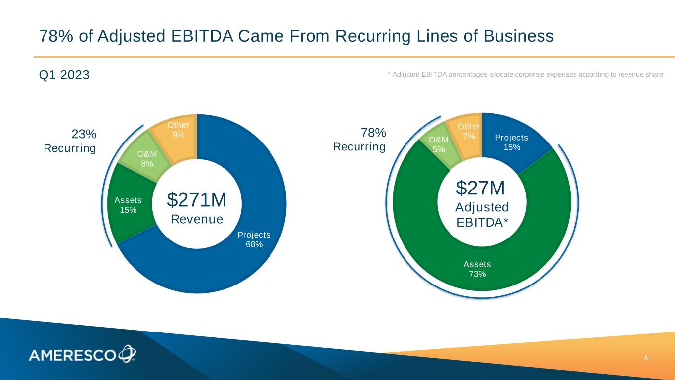 Projects 15% Assets 73% O&M 5% Other 7% $27M Adjusted EBITDA* 78% of Adjusted EBITDA Came From Recurring Lines of Business 4 Projects 68% Assets 15% O&M 8% Other 9%23% Recurring $271M Revenue * Adjusted EBITDA percentages allocate corporate expenses according to revenue shareQ1 2023 78% Recurring