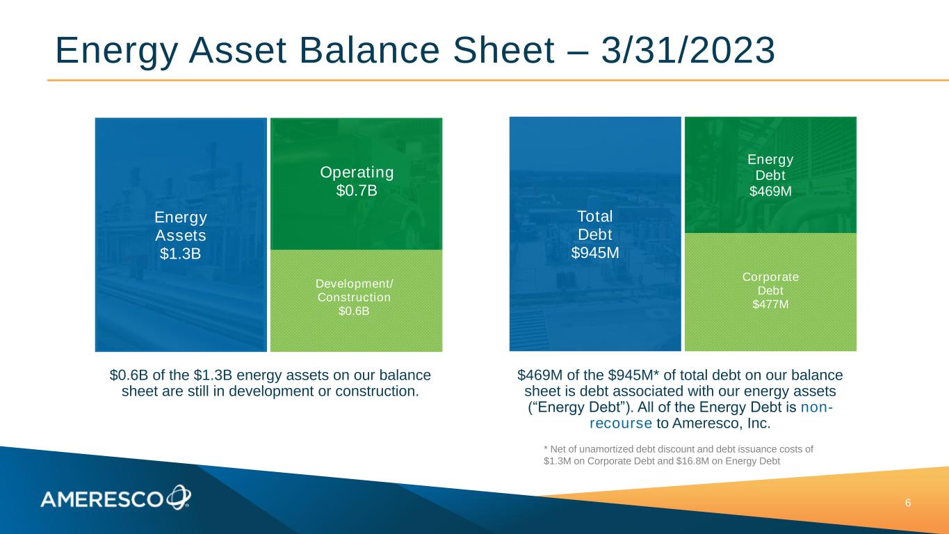 Energy Asset Portfolio – 3/31/2023 5 423 MWe of Energy Assets in operation. 94 MW of non-RNG biogas, 38MW of RNG, Solar is 277 MW, Other is 13 MW 491 MWe of total asset capacity. 432 MWe of Ameresco-owned capacity after minority interest Energy Assets 423 MWe Other: 3% Solar: 66% Biogas: RNG 9% Biogas: Non-RNG 22% Net Energy Assets in Development & Construction 432 MWe EaaS*: 0% Battery: 23% Solar: 44% Biogas: 33% Numbers may not sum due to rounding *$41M of our anticipated Assets in Development spending is for Energy as a Service assets, $39M of which does not include generation assets that can be measured in MWe Ameresco’s Ownership